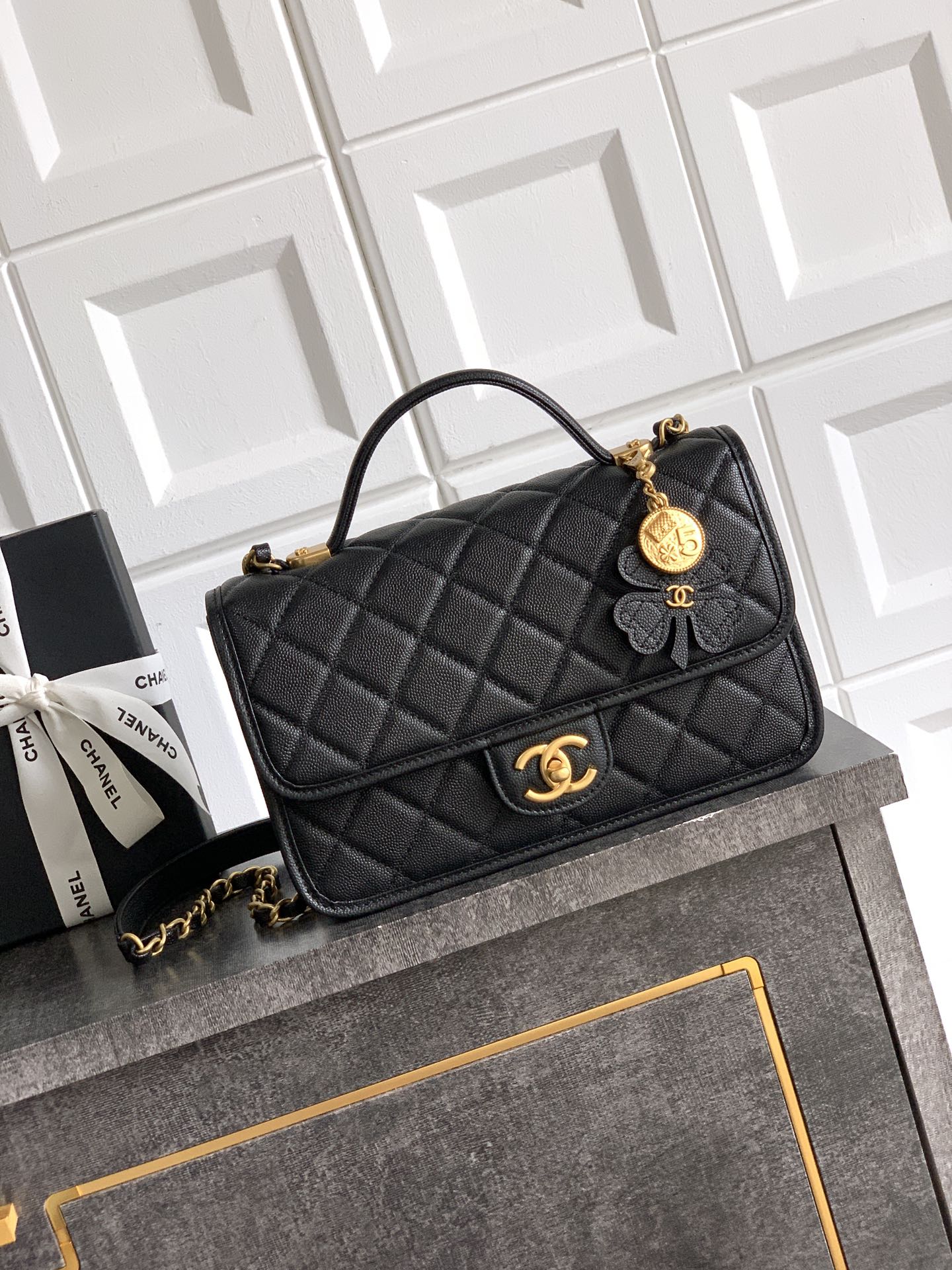 • A decorative four-leaf clover charm (made of matching black leather with a CC logo) paired with an embossed gold coin (featuring Chanel motifs like the quilted pattern).