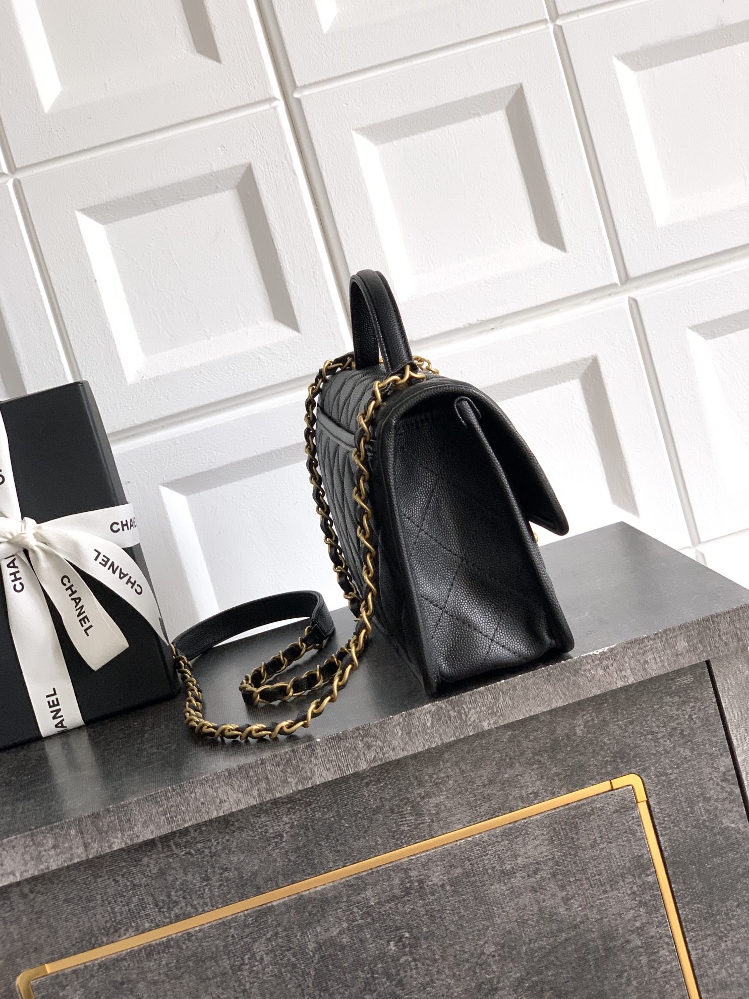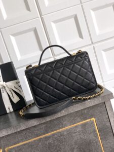 • A small top handle and a black-and-gold chain strap (convertible for shoulder/crossbody wear).