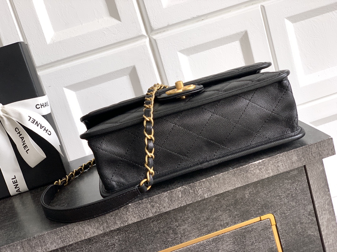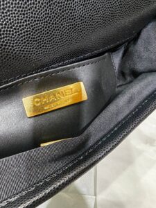 • This Chanel flap bag is crafted from durable black caviar leather, featuring the brand’s iconic diamond-quilted pattern and polished gold-tone hardware.