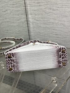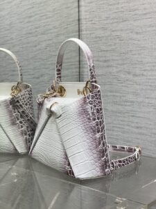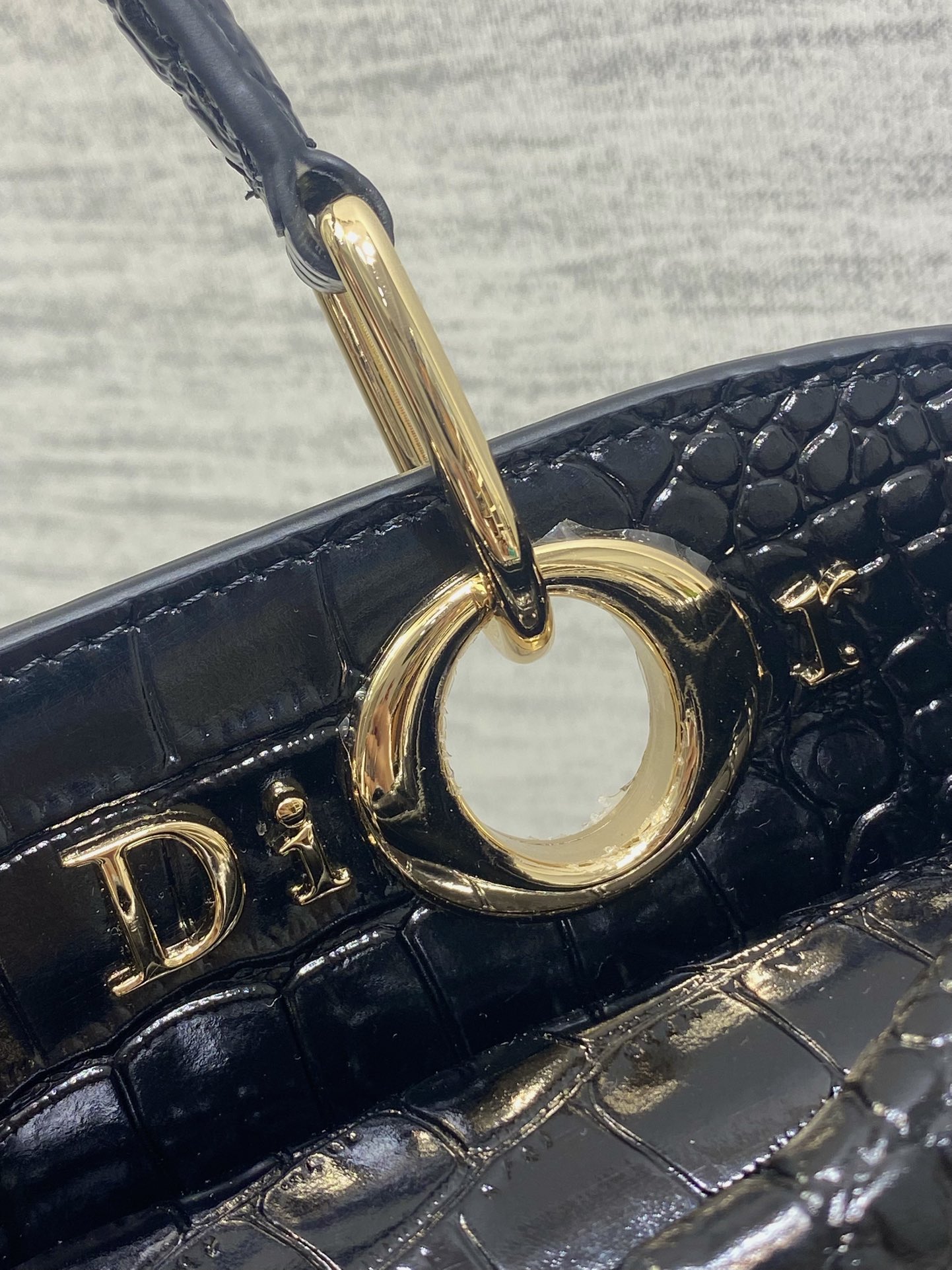 This is a Christian Dior handbag crafted from glossy black patent leather featuring a crocodile-embossed texture, exuding luxury and sophistication.