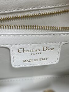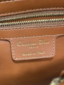 Protective gold-tone feet on the base prevent scuffing, while the interior (lined in smooth black leather) includes a zippered pocket—plus a “Christian Dior PARIS MADE IN ITALY” label for authenticity.