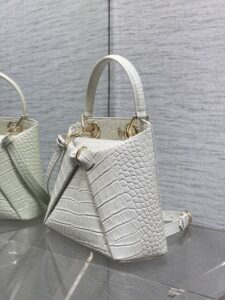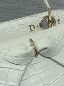 It is accented with polished gold-tone hardware, including the iconic “Dior” lettering (integrated with circular rings) on the top rim, and a decorative bow detail with a gold-tone loop on the front.