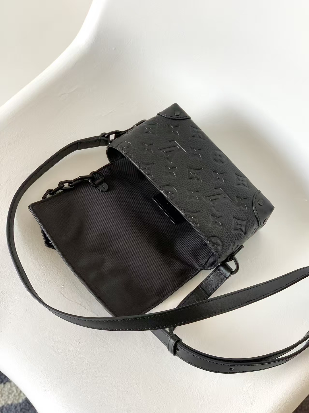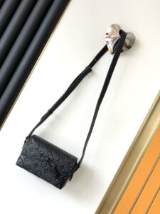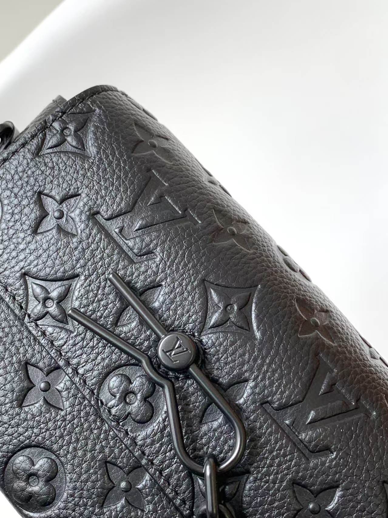 This handbag from Louis Vuitton is crafted from black embossed leather, featuring the brand’s signature Monogram pattern.