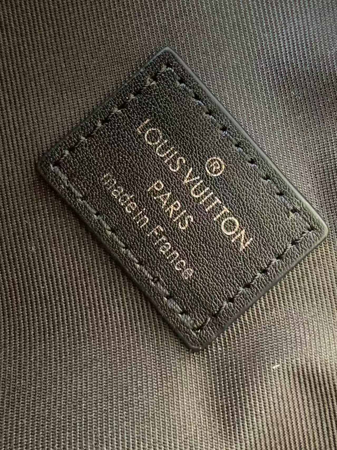 It is accented with black hardware, including a distinctive toggle closure with the embossed LV logo and a chain element.