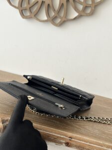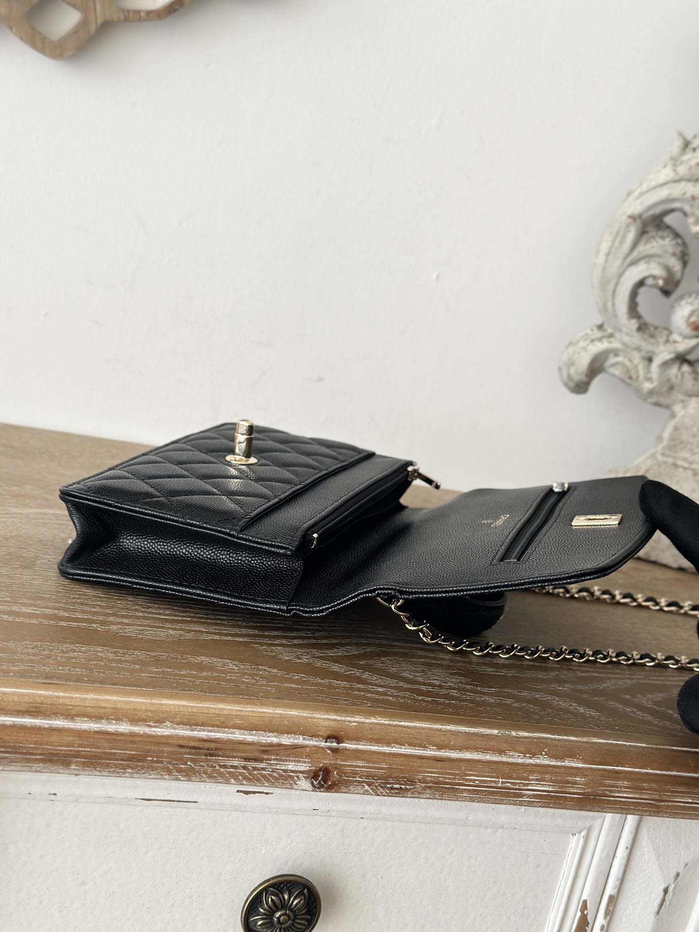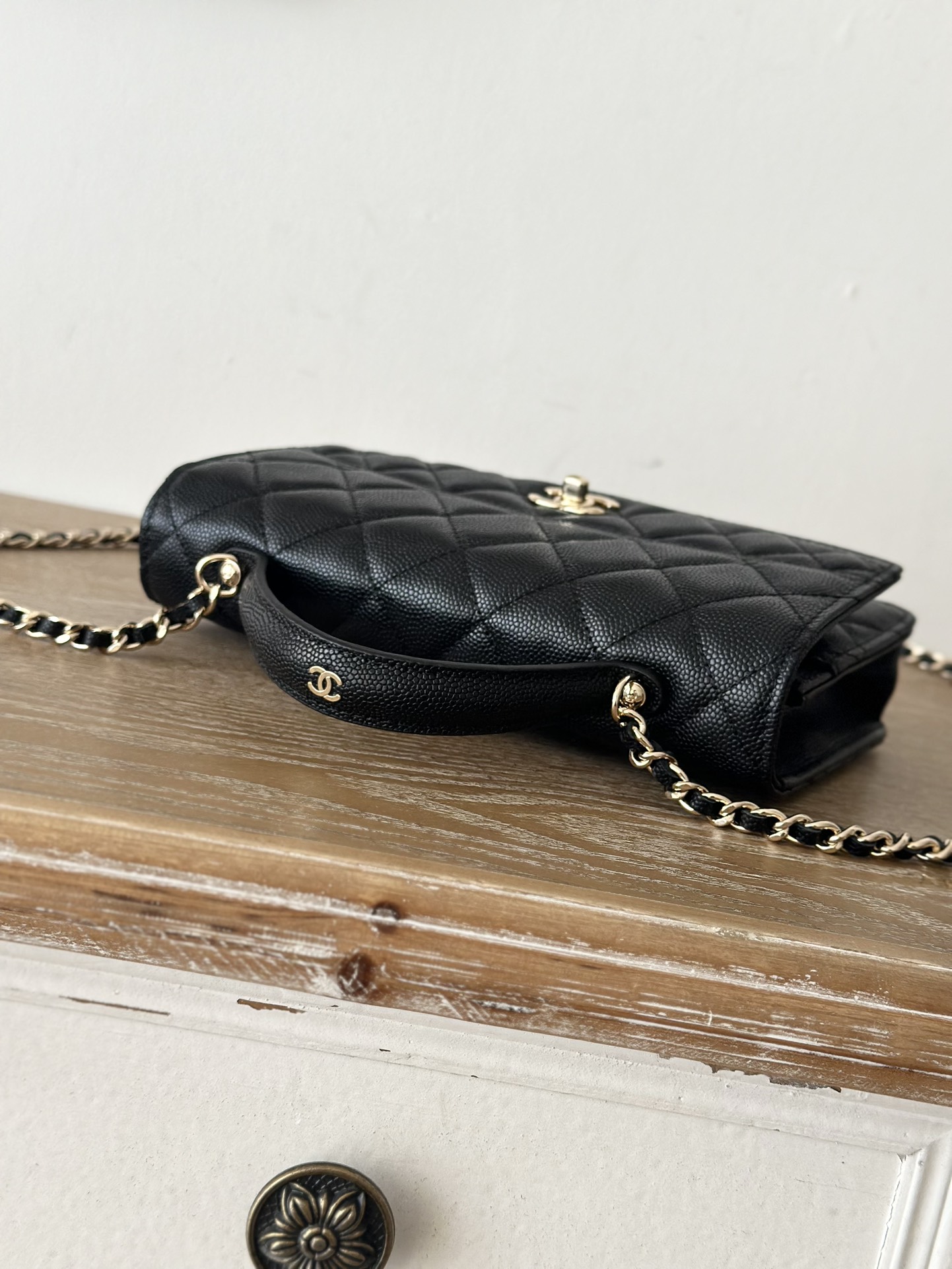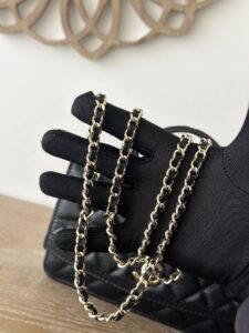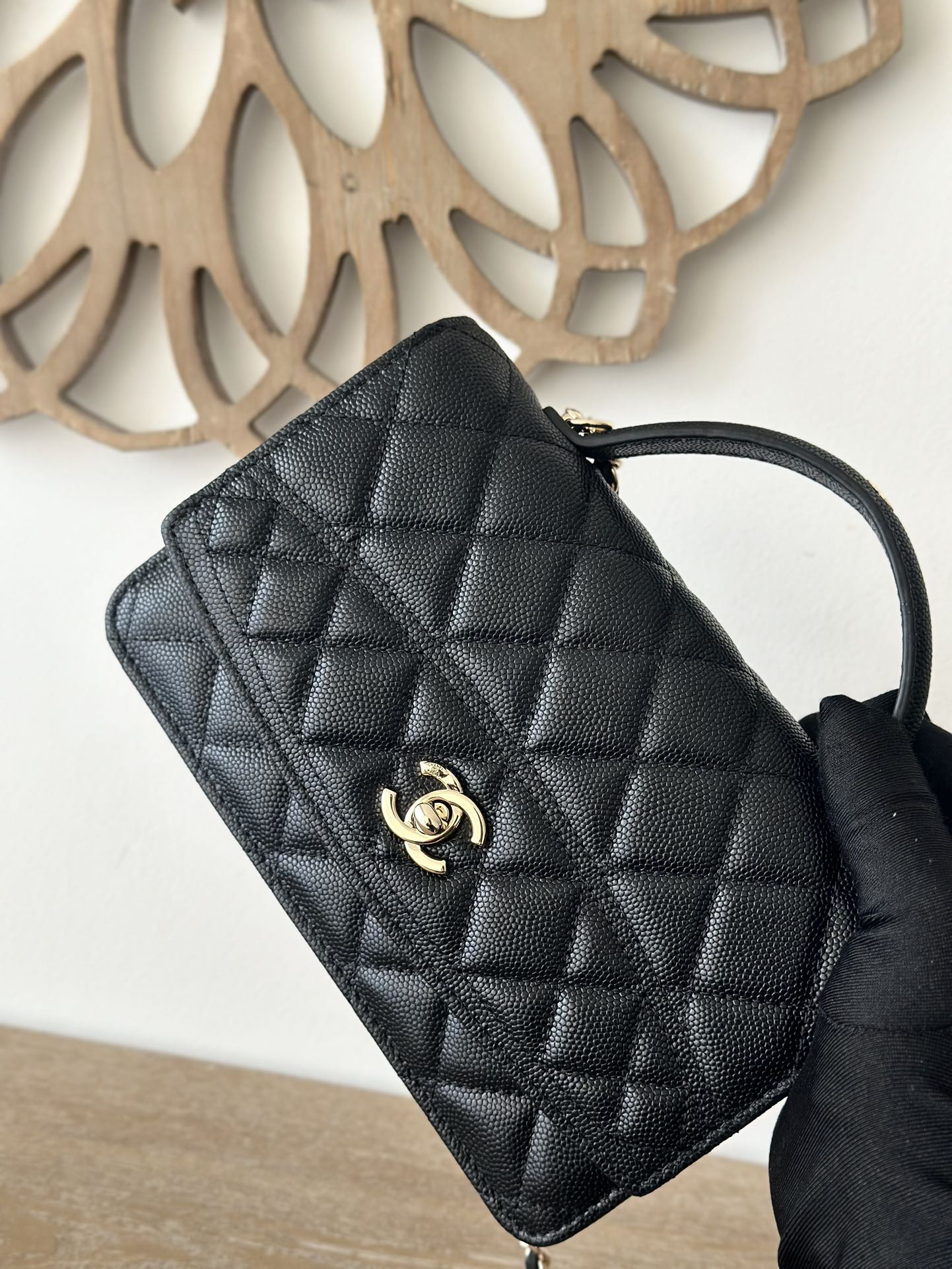 • It includes a signature interlocking CC turn-lock closure, a small top handle (embossed with the CC logo), and a black-and-gold chain strap (convertible for shoulder/crossbody wear).