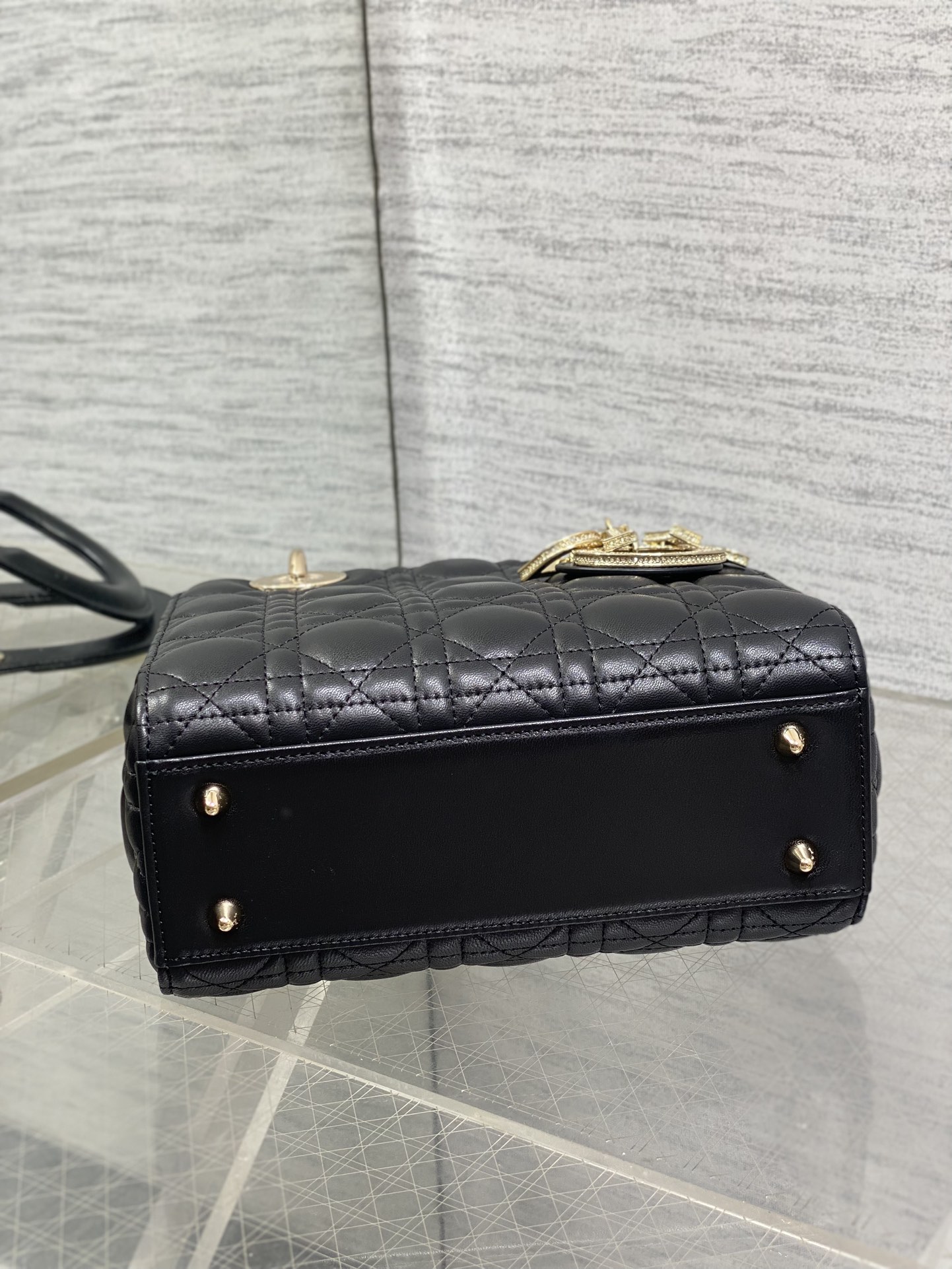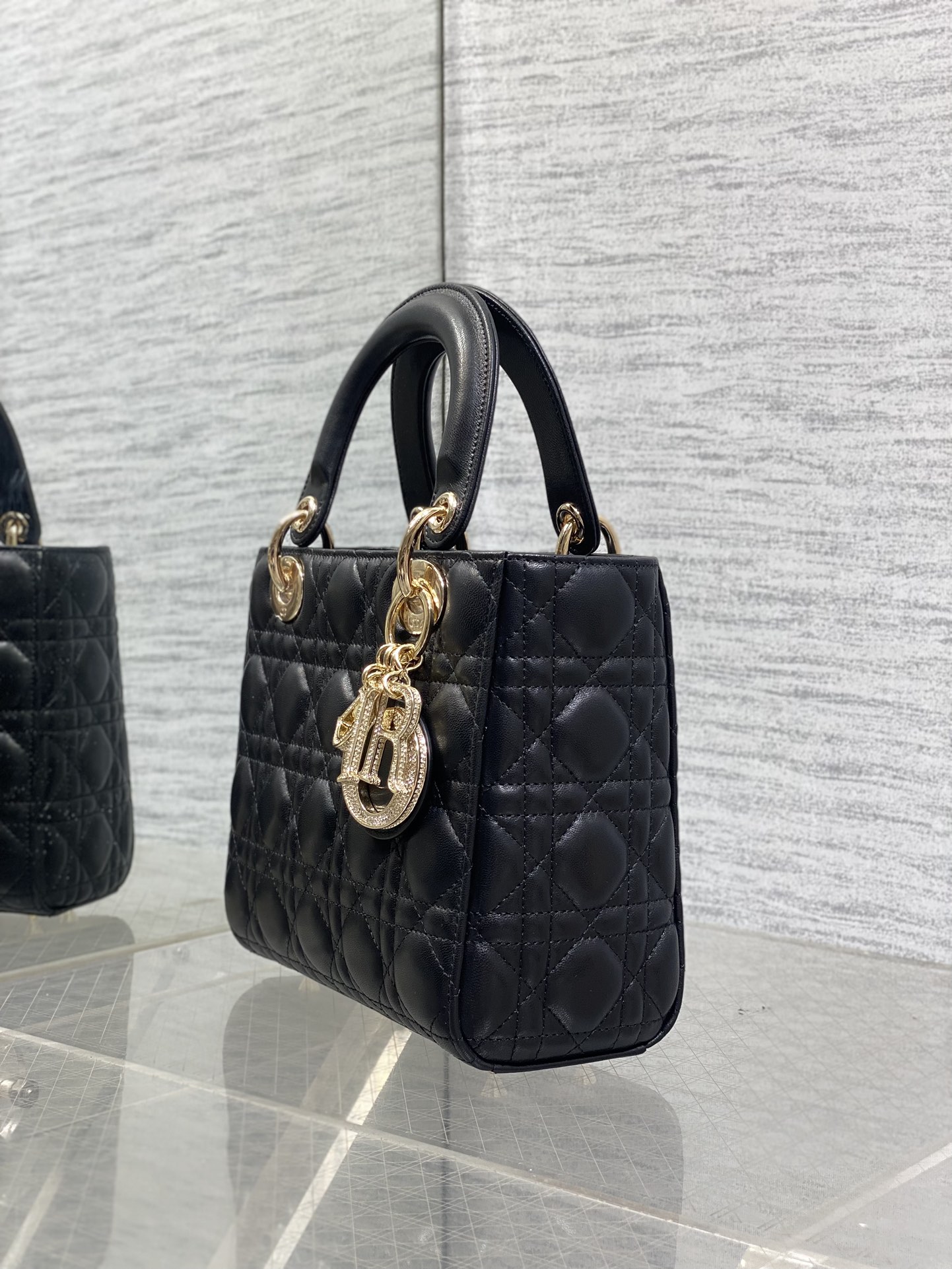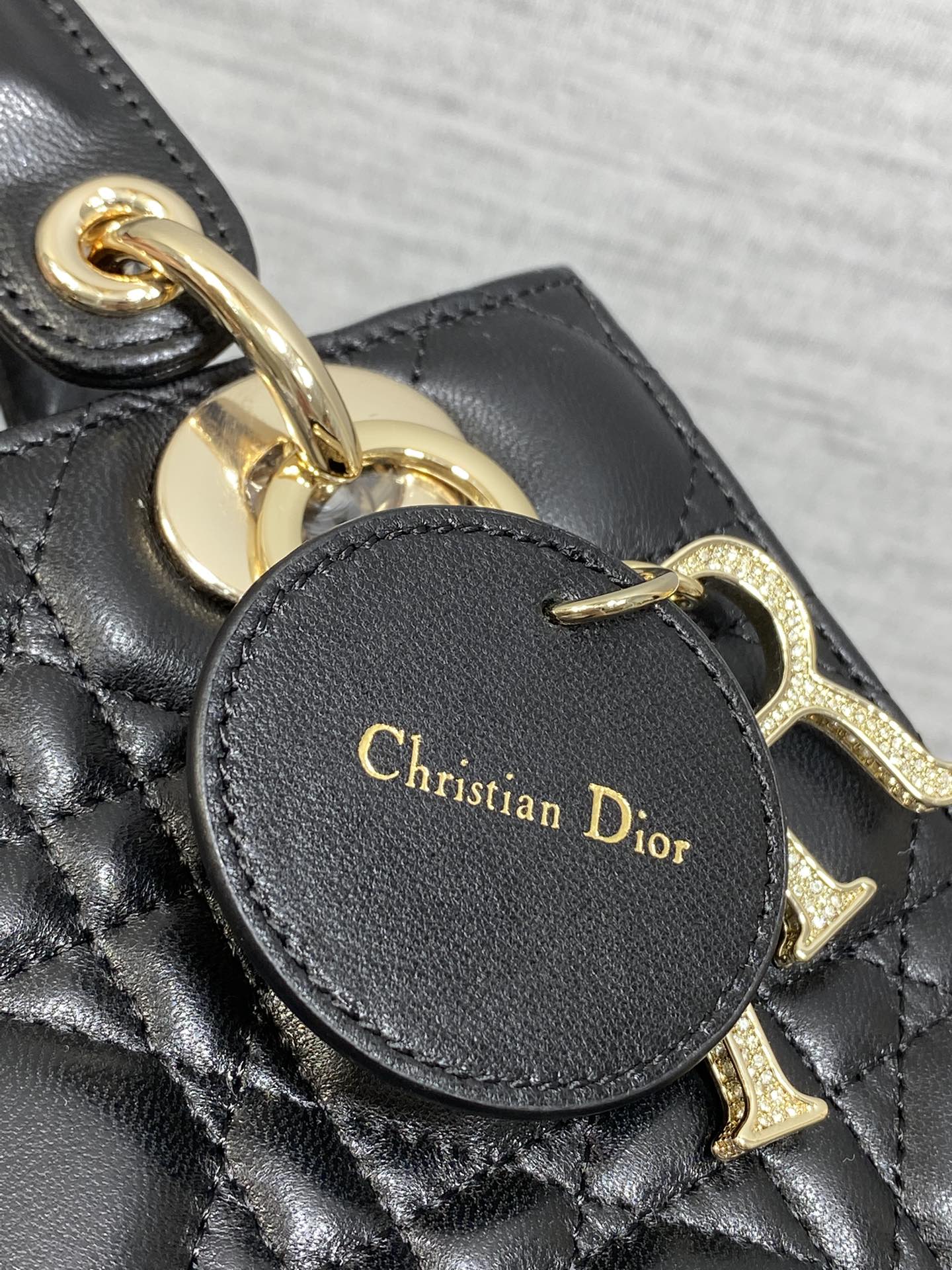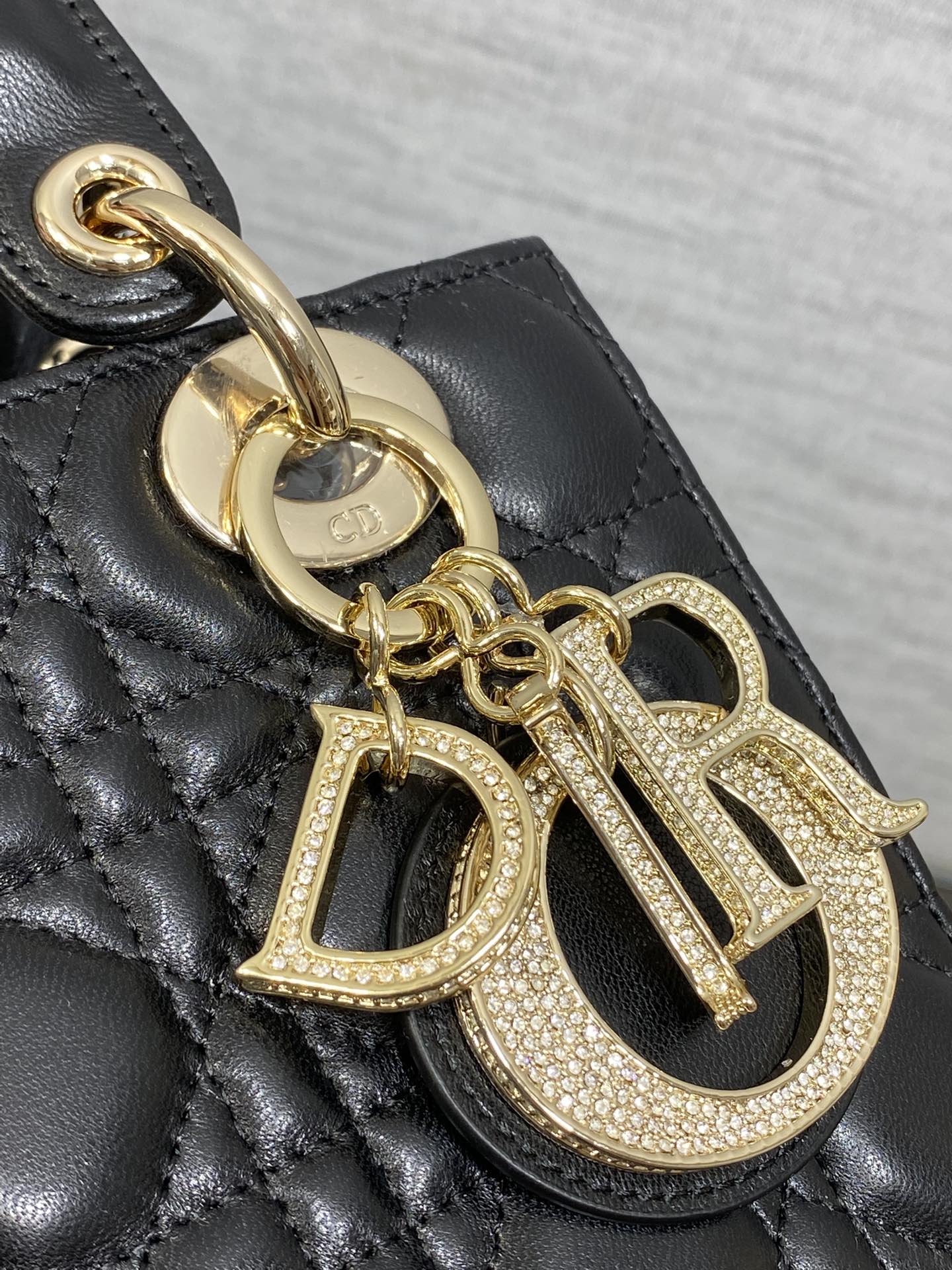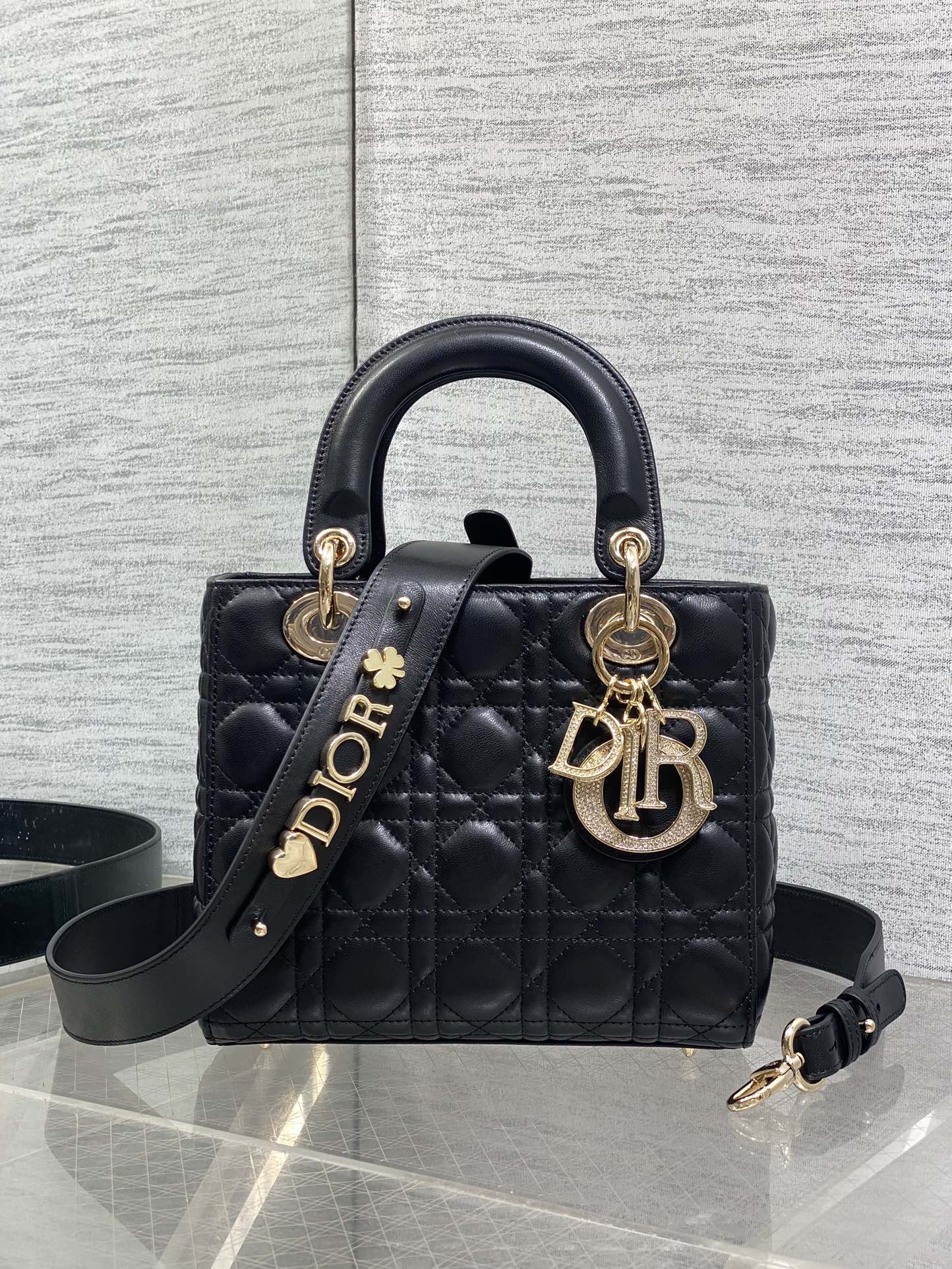 It is highlighted by glamorous details: polished gold-tone hardware, a crystal-embellished “DIOR” logo charm (a statement focal point), and a detachable black leather shoulder strap adorned with “DIOR” lettering, a gold heart, and a four-leaf clover (adding playful elegance).