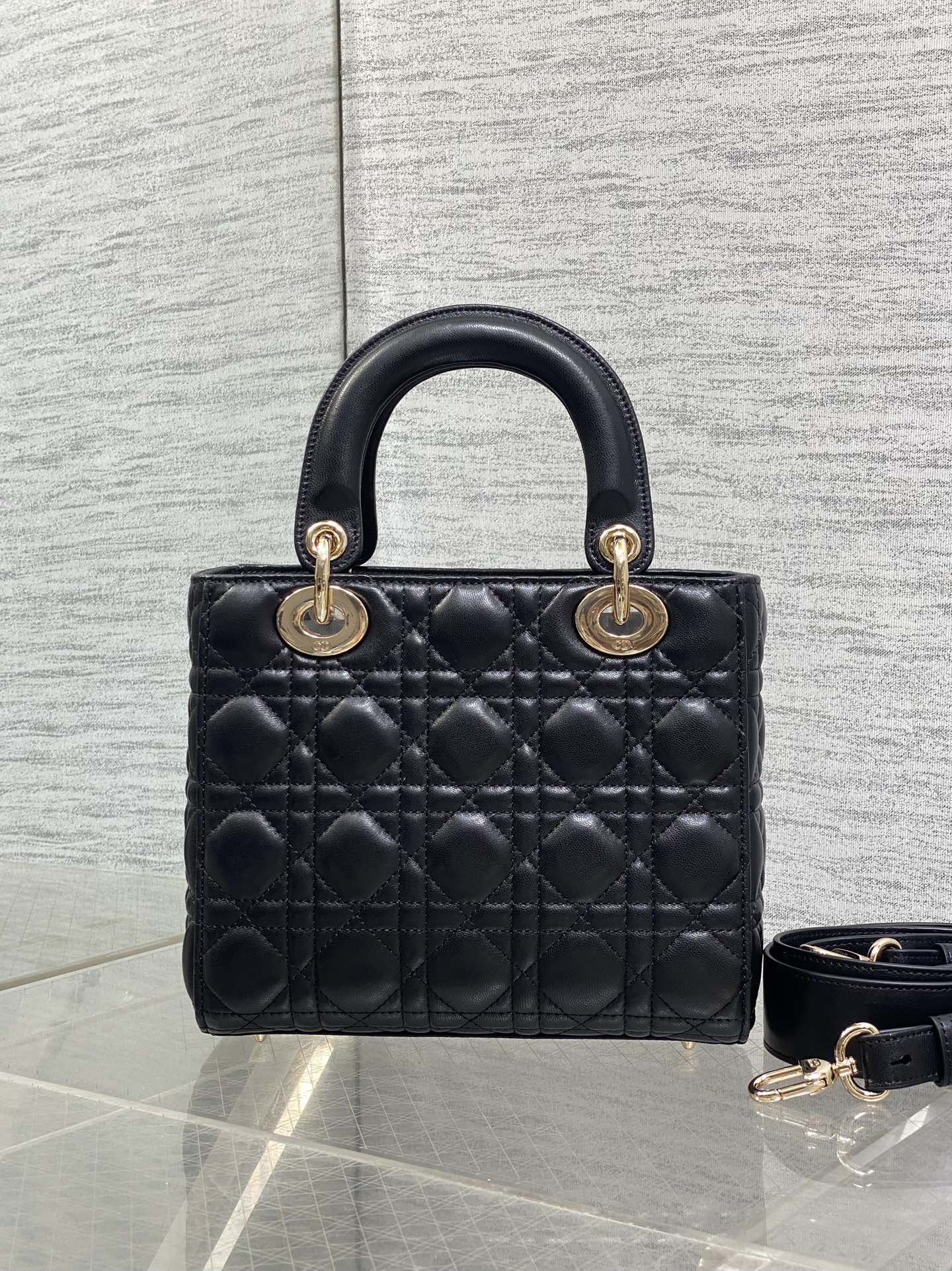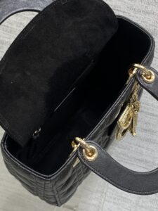 This is a Christian Dior handbag crafted from smooth black leather, featuring the brand’s iconic diamond-quilted pattern for a luxurious texture.