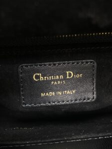 Protective gold-tone feet on the base prevent scuffing, while the interior (lined in soft black fabric) includes a zippered compartment—plus a “Christian Dior PARIS MADE IN ITALY” label for authenticity.