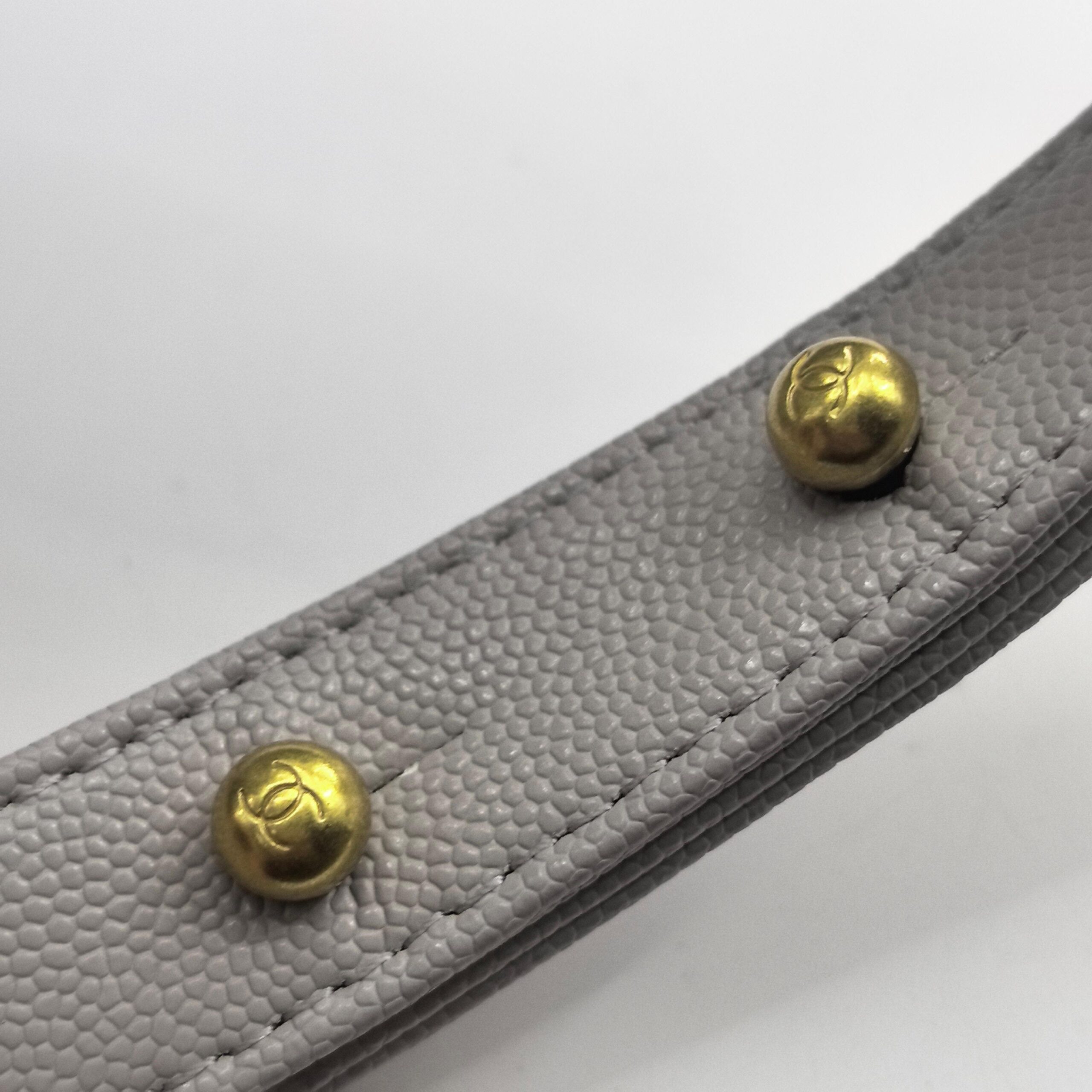 Material & Color: Crafted from durable light gray caviar leather (a textured, scratch-resistant material) with subtle diamond quilting across the front flap. The bag features polished gold-tone hardware that contrasts elegantly with the soft gray hue.