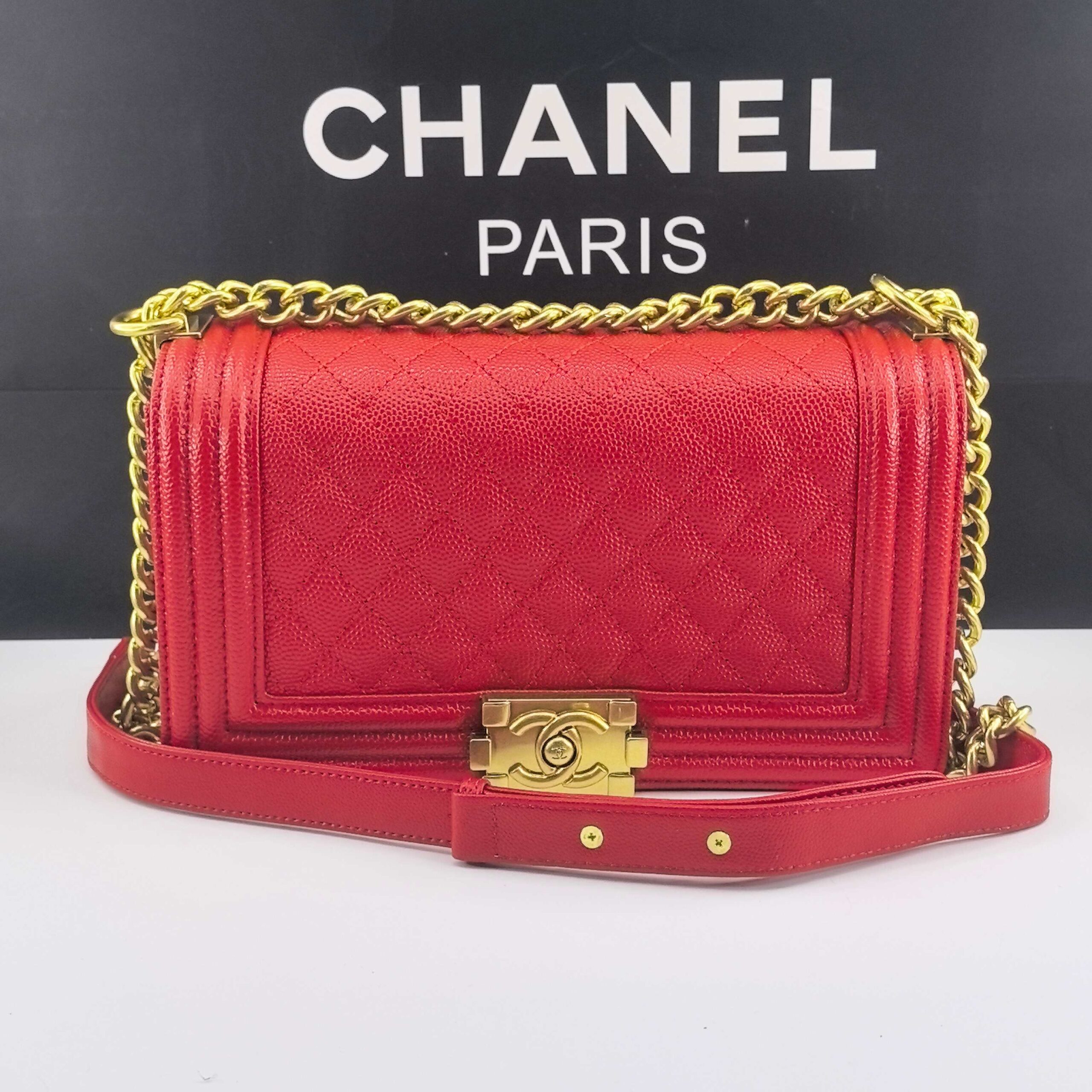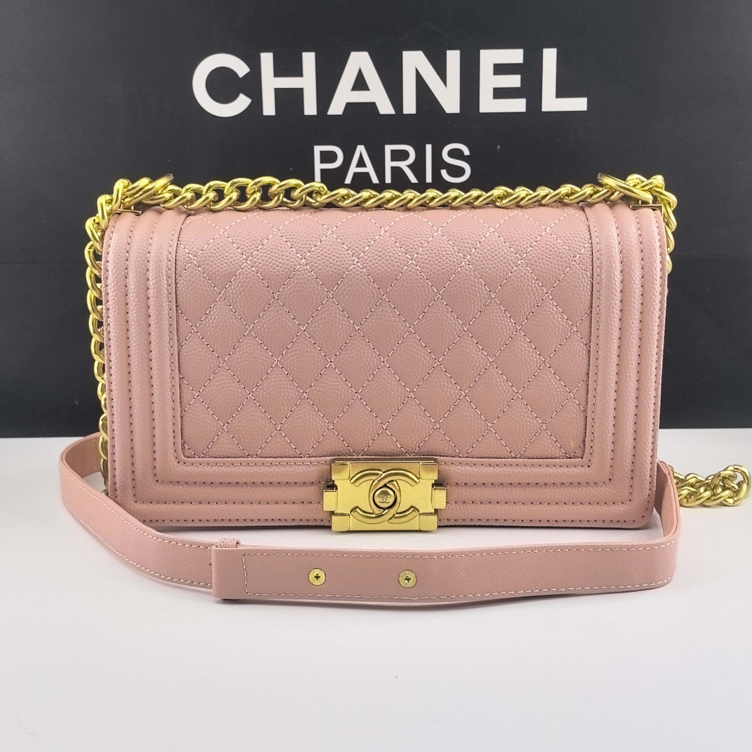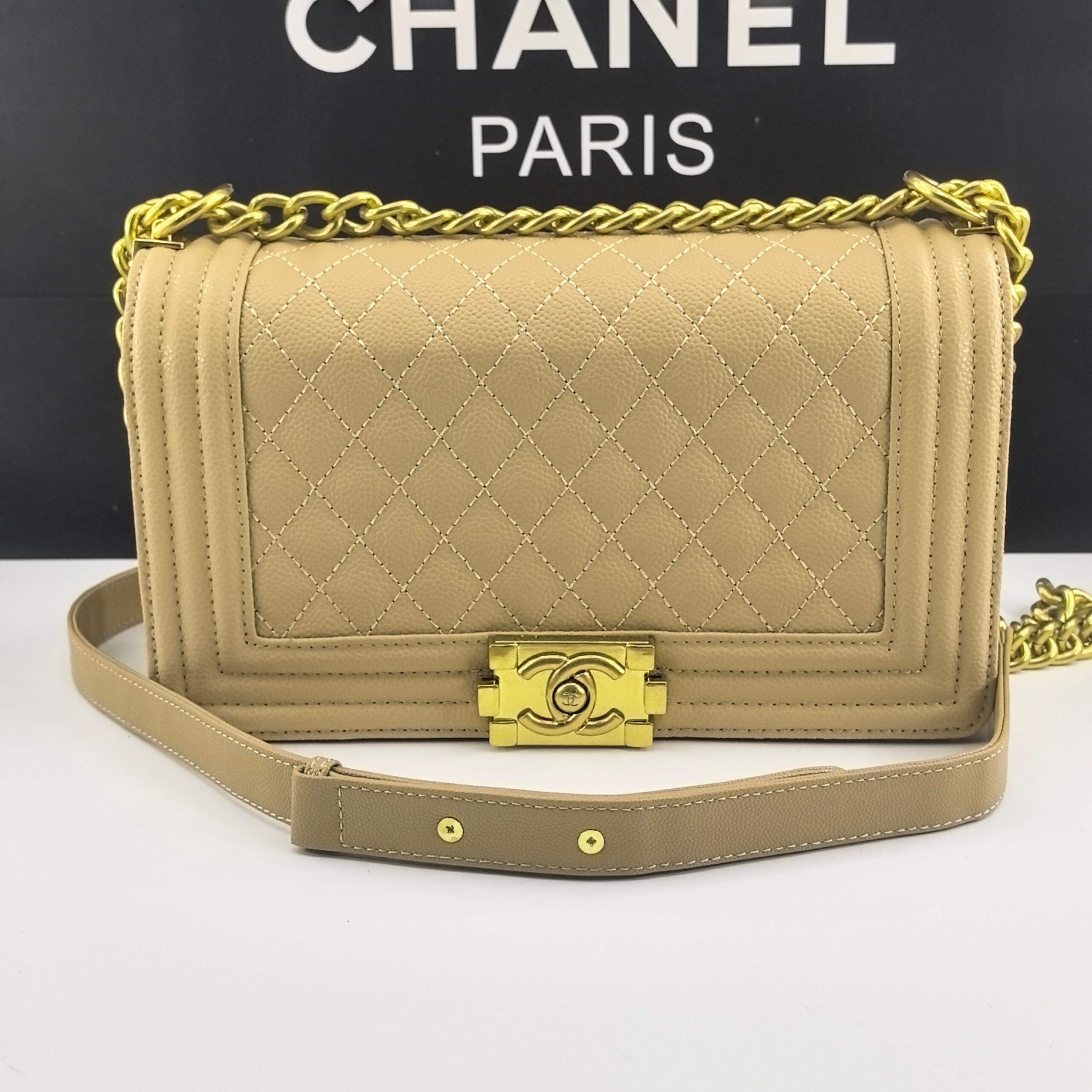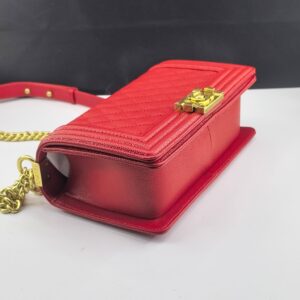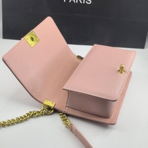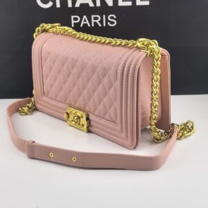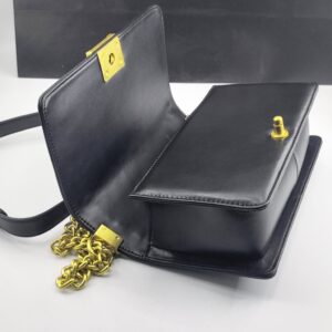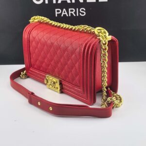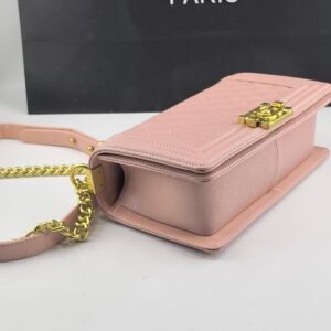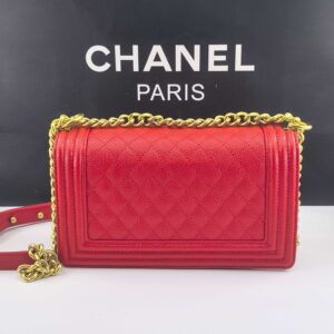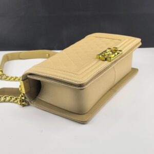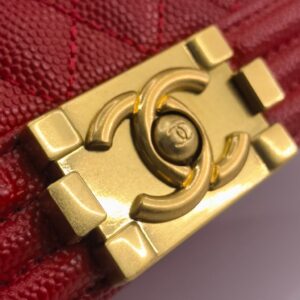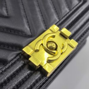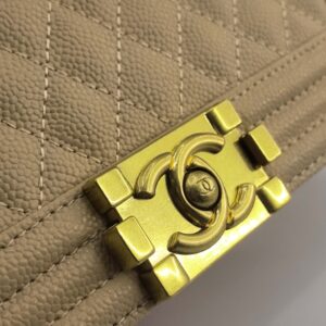 Design Details: It includes the Boy line’s signature rectangular CC turn-lock closure (centered on the front flap), a thick gold-tone curb chain strap (paired with a tonal leather shoulder pad for comfort), and stitched edge detailing that enhances its structured shape. Small CC-embossed gold-tone studs accent the leather pad, and “CHANEL” branding is engraved on hardware fixtures (like the chain’s connector).