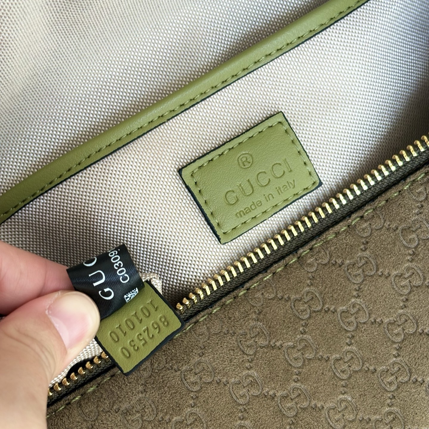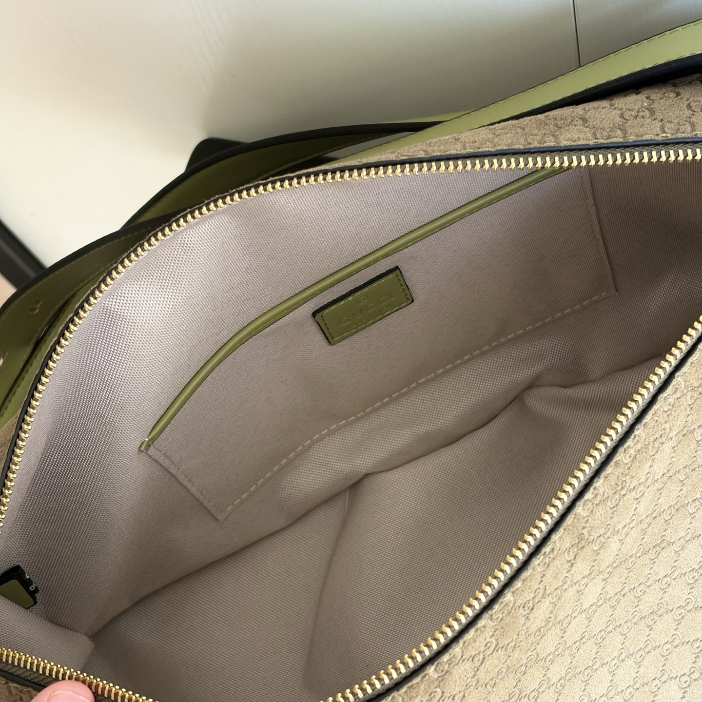 • The interior is lined in neutral fabric, with a slip pocket for small items, and includes a leather “Gucci made in Italy” label for authenticity.