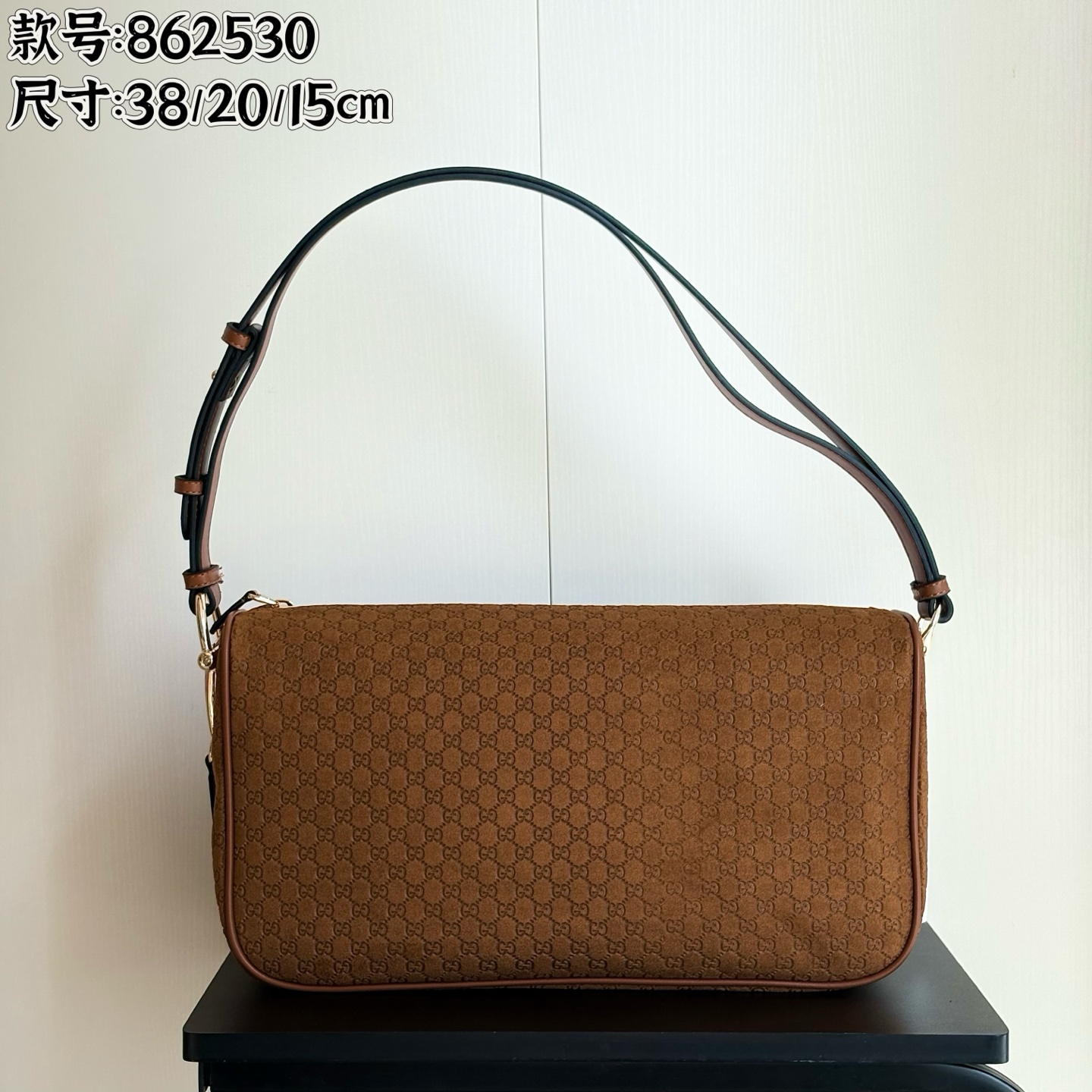 • This is a Gucci shoulder bag (style number 862530) featuring the brand’s iconic brown GG monogram pattern, crafted from soft suede material.