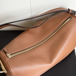• The bag has a rounded rectangular silhouette with a full-zip closure (matching gold-tone zipper).