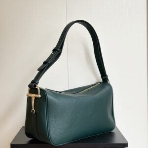 • It is accented with sleek olive green leather trim (along the edges and adjustable shoulder strap) and polished gold-tone hardware—including the signature Gucci horsebit detail at the strap attachment.