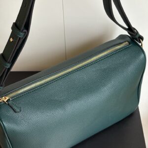 • The adjustable shoulder strap (with olive green and black leather panels) allows for versatile carrying (shoulder or crossbody).