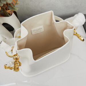 These are Dior Caro bucket bags—elegant, structured drawstring-style bags crafted from smooth leather (available in warm tan and crisp white finishes).