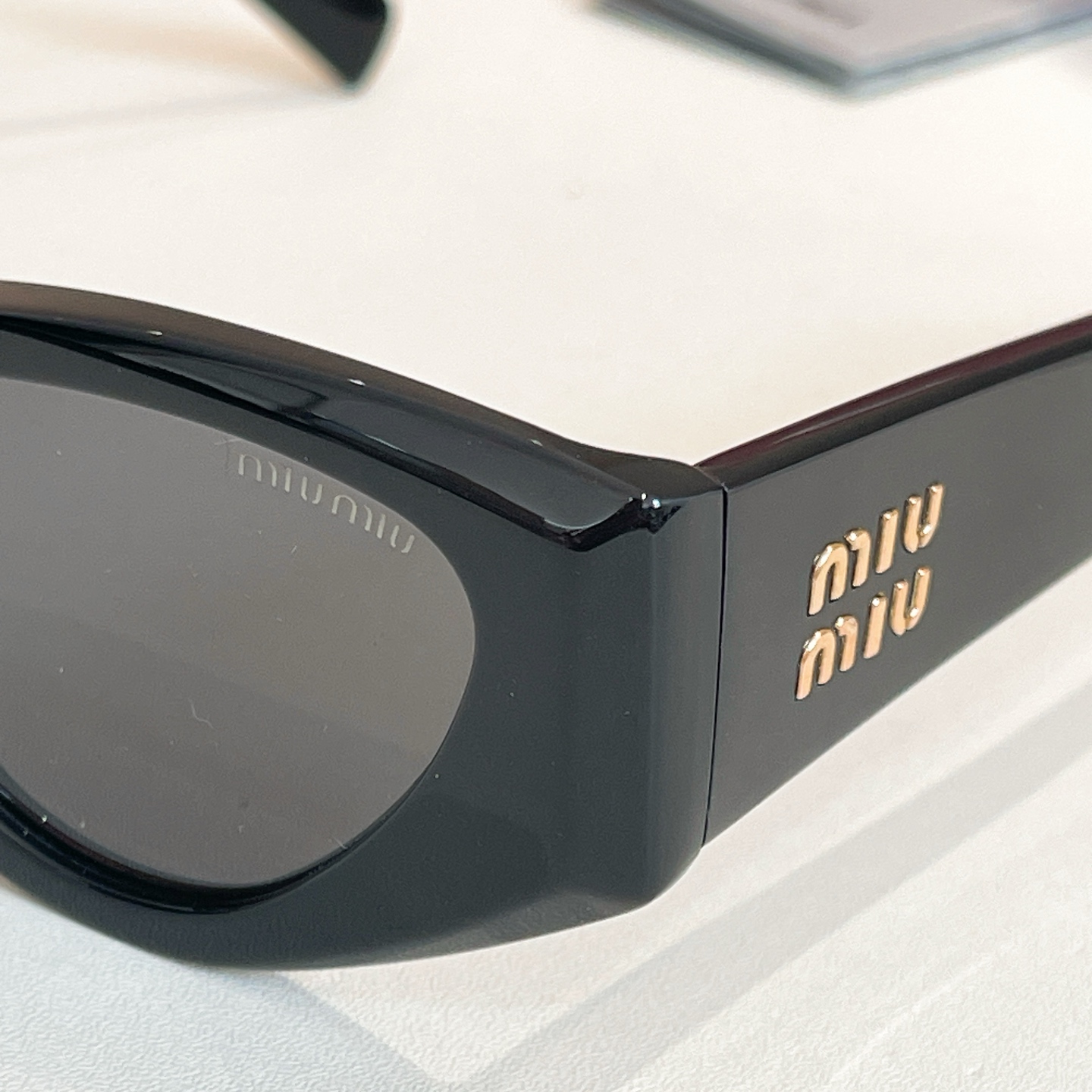 • These are Miu Miu cat-eye sunglasses featuring the brand’s iconic logo prominently displayed on the temple arms.