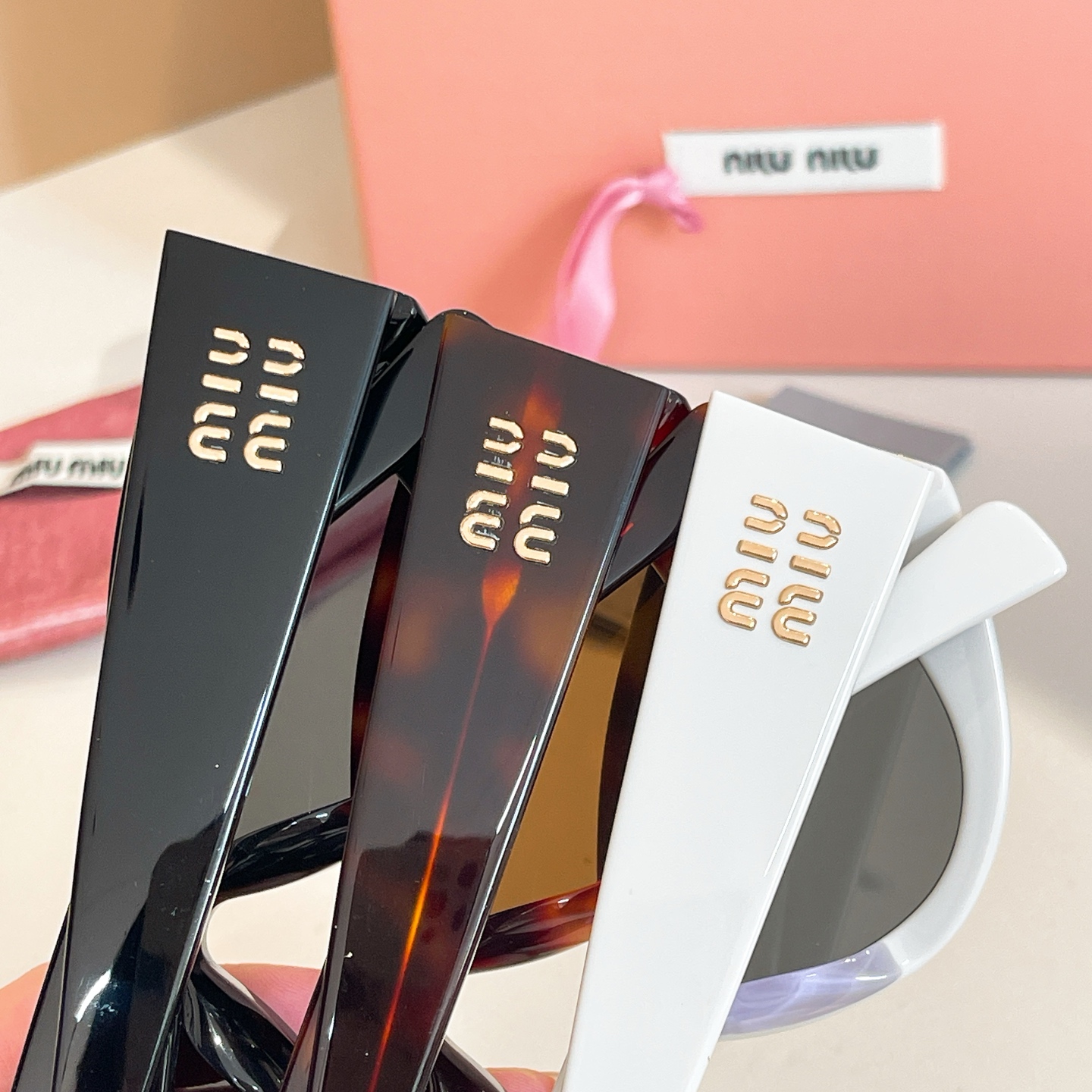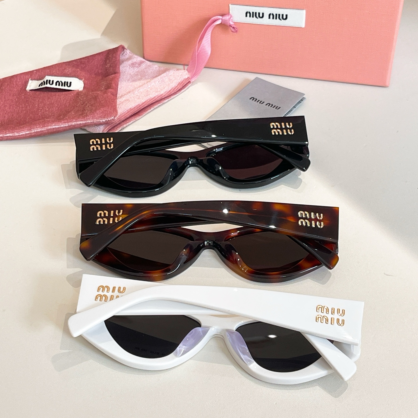 • Presented with Miu Miu’s signature pink packaging, including a velvet case and a branded box, these sunglasses exemplify the brand’s commitment to playful luxury and retro-inspired design.
