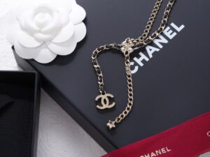 • The necklace has two dangling chains, one ending with a star charm and the other with the iconic interlocking “CC” logo encrusted with crystals.