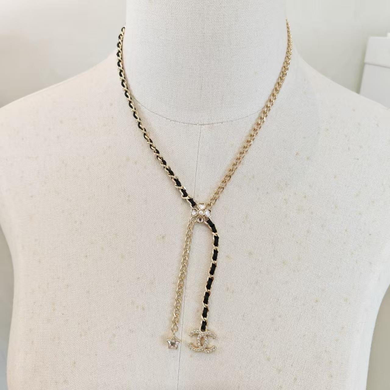 • The product in the pictures is a stylish necklace from Chanel. It features a Y – shaped design with chains, some intertwined with black fabric.