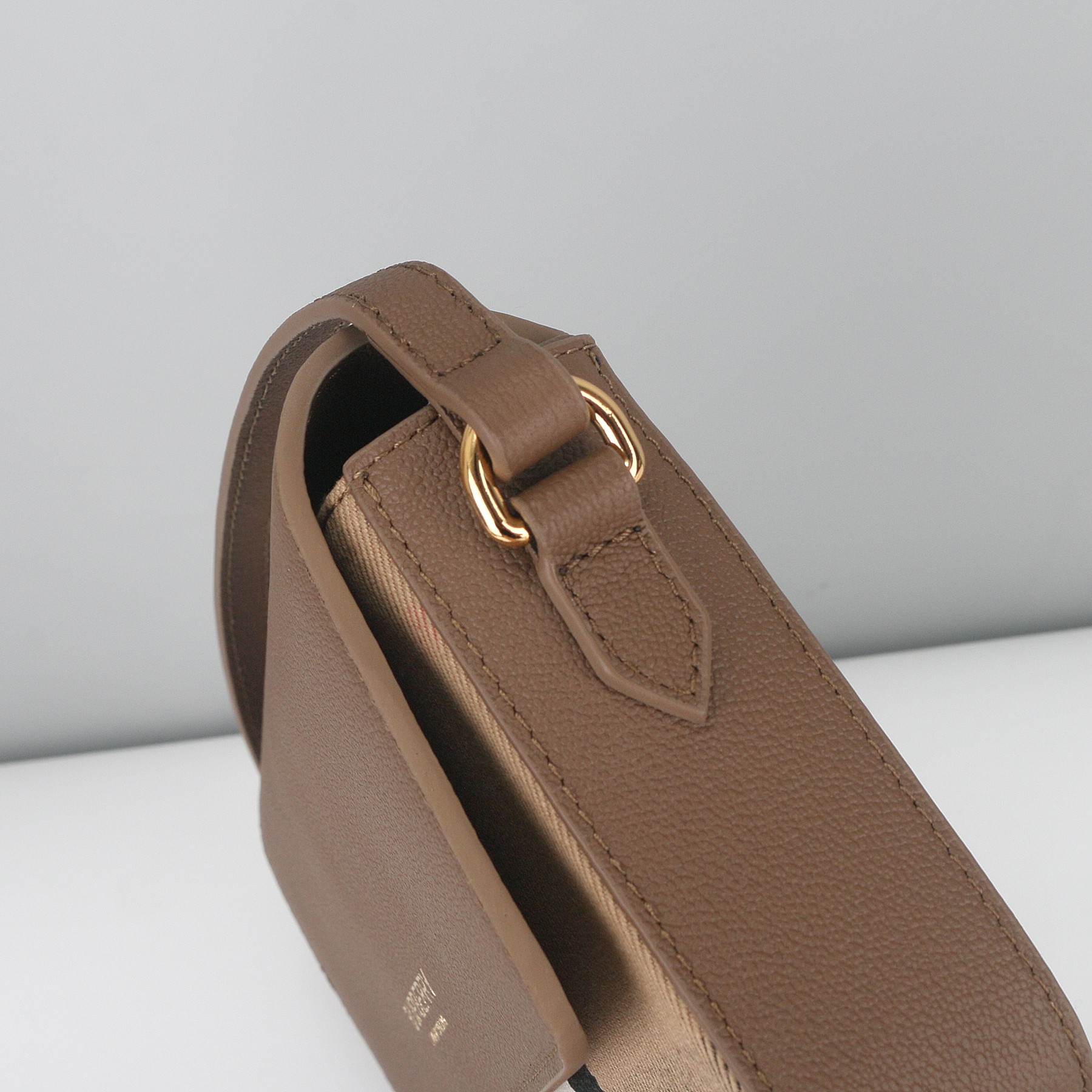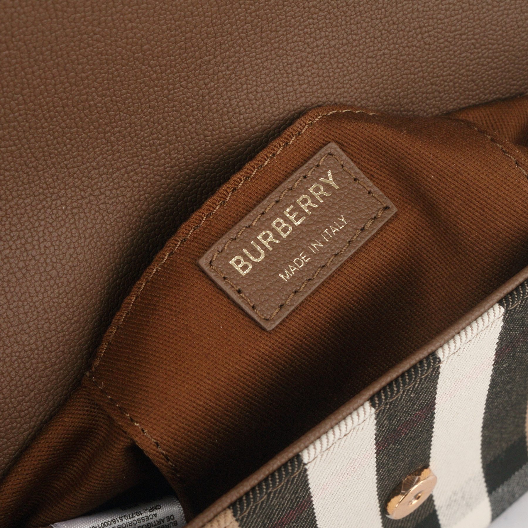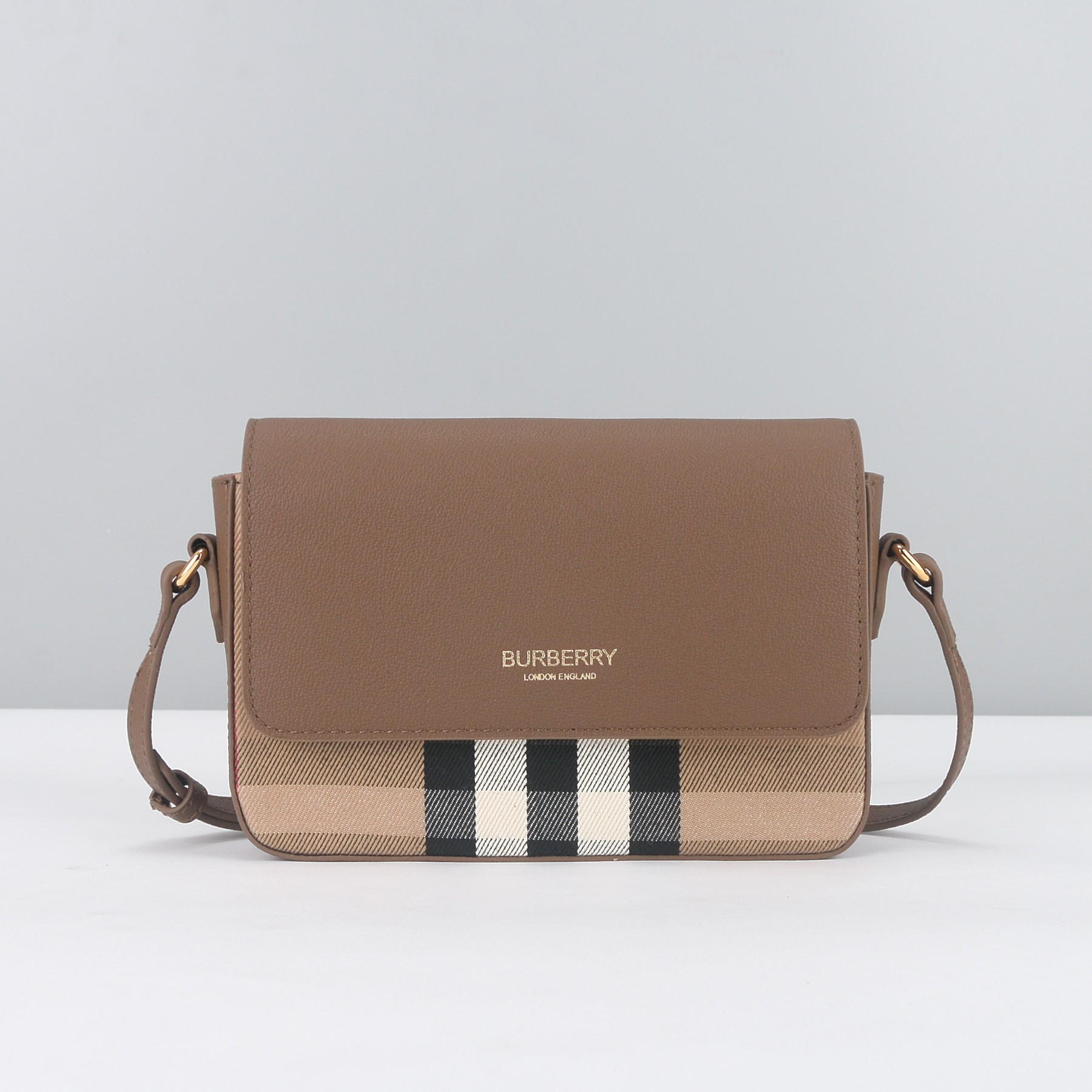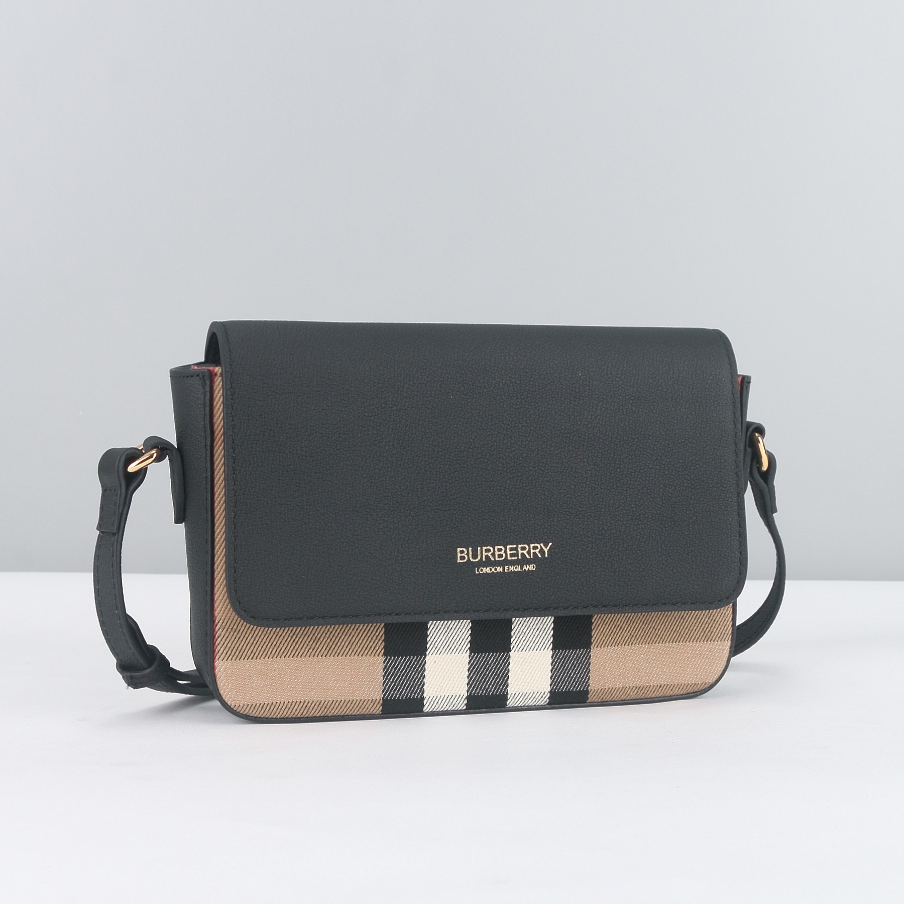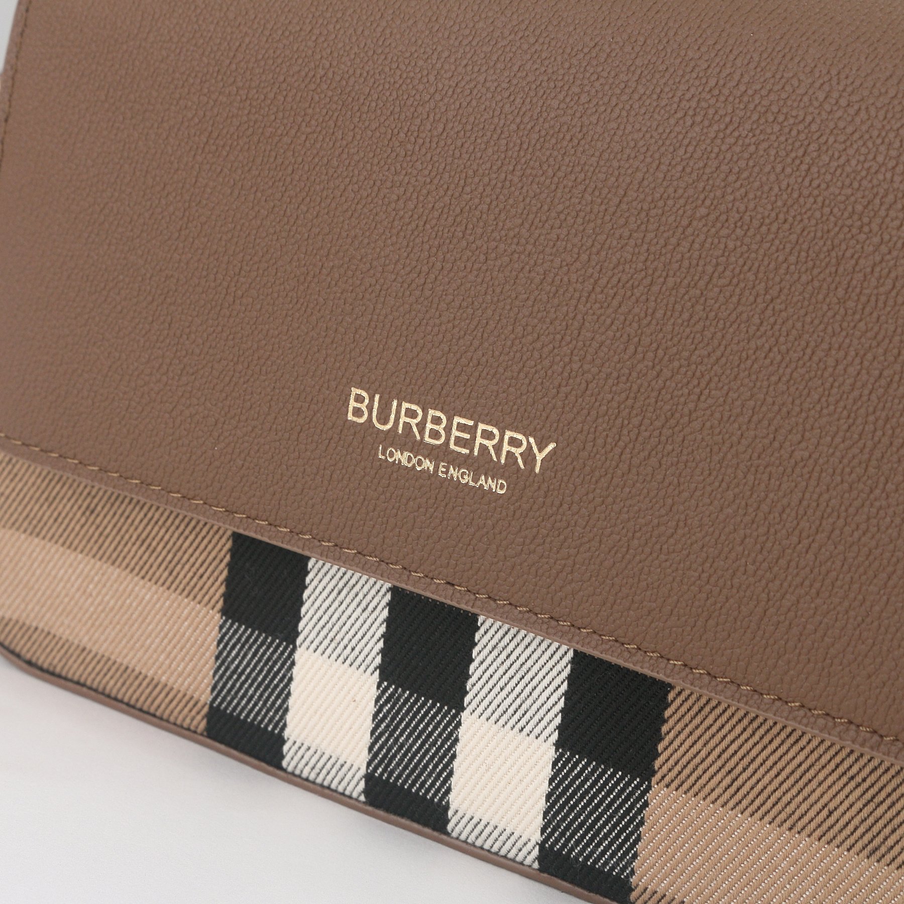 Branding: Gold-tone “BURBERRY LONDON ENGLAND” lettering embossed on the leather flap.