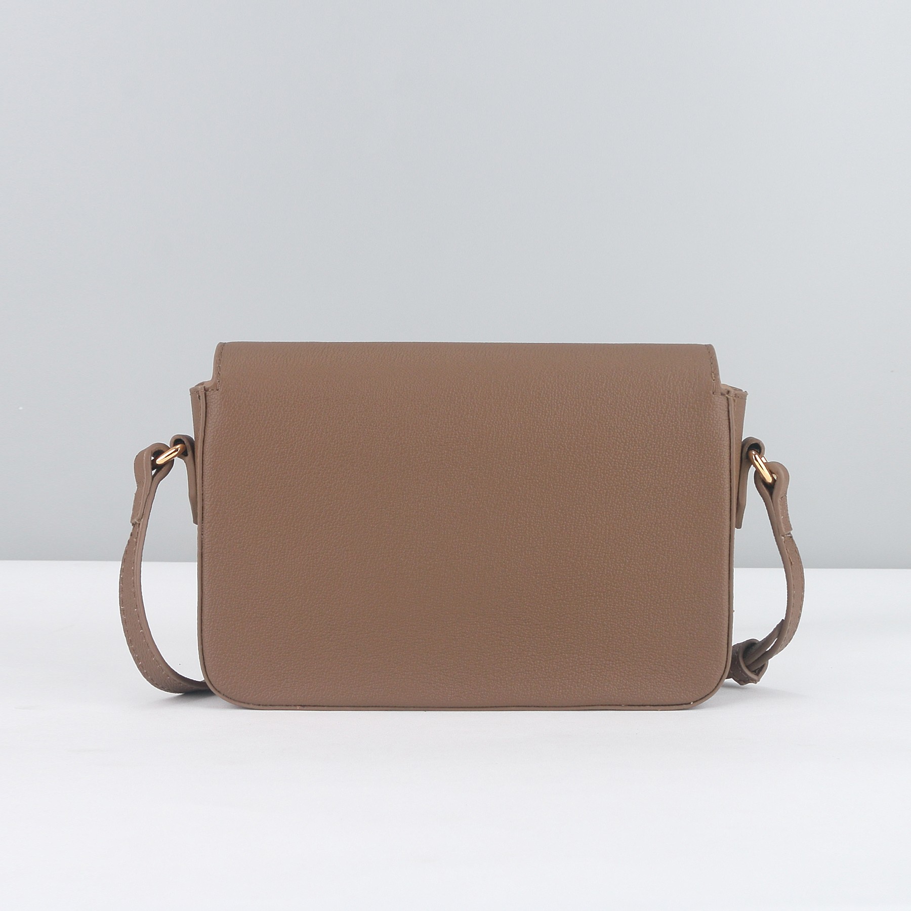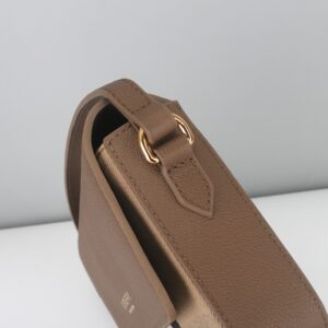 Hardware: Polished gold-tone metal clasps (for the flap closure) and adjustable leather crossbody straps (matching the flap color).