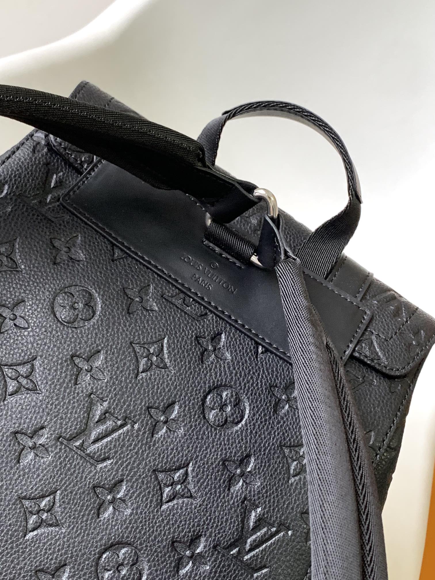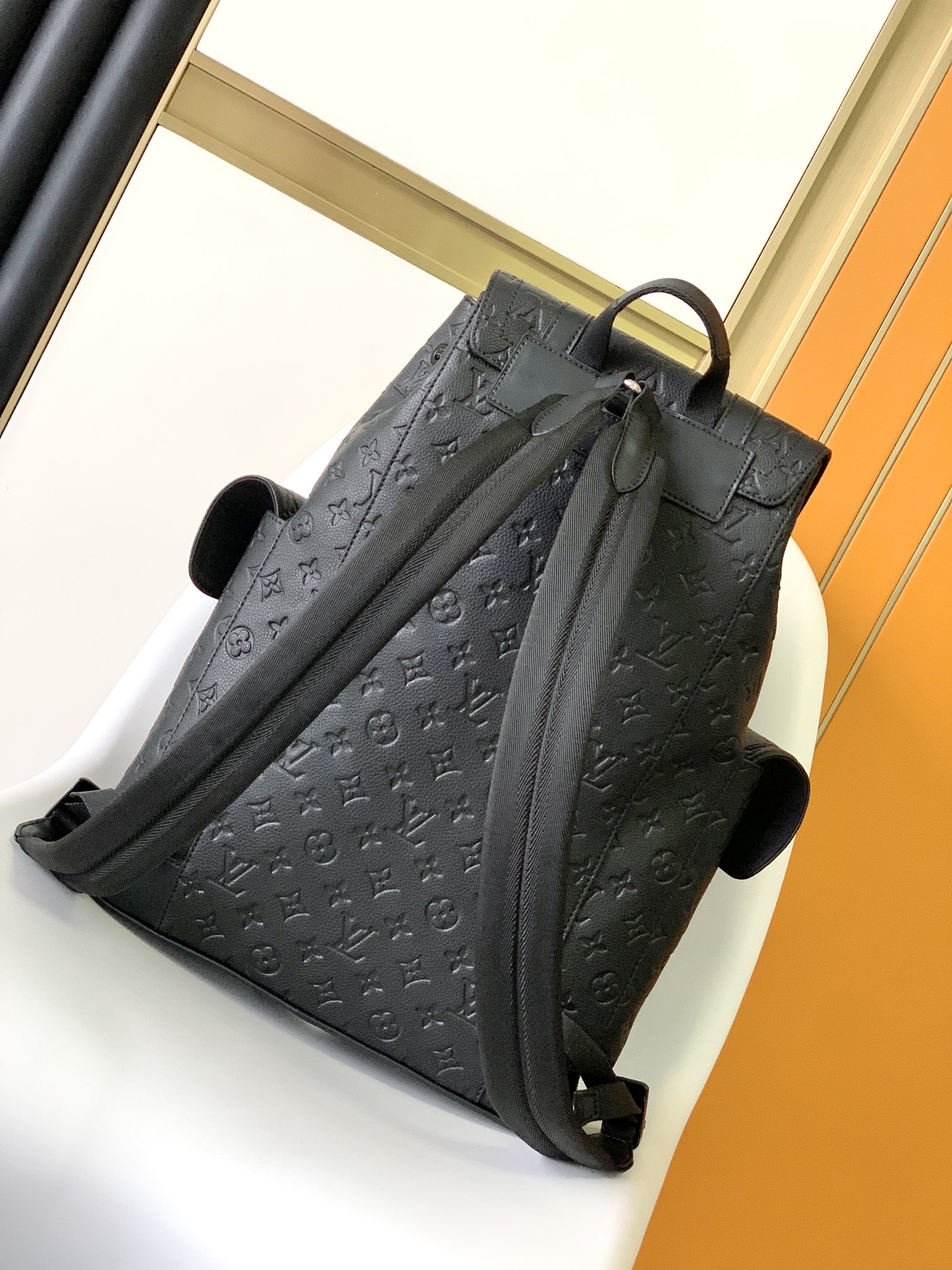 This is the Louis Vuitton Christopher Small Backpack, crafted from black embossed leather (featuring the brand’s iconic Monogram pattern for a sleek, textured look).