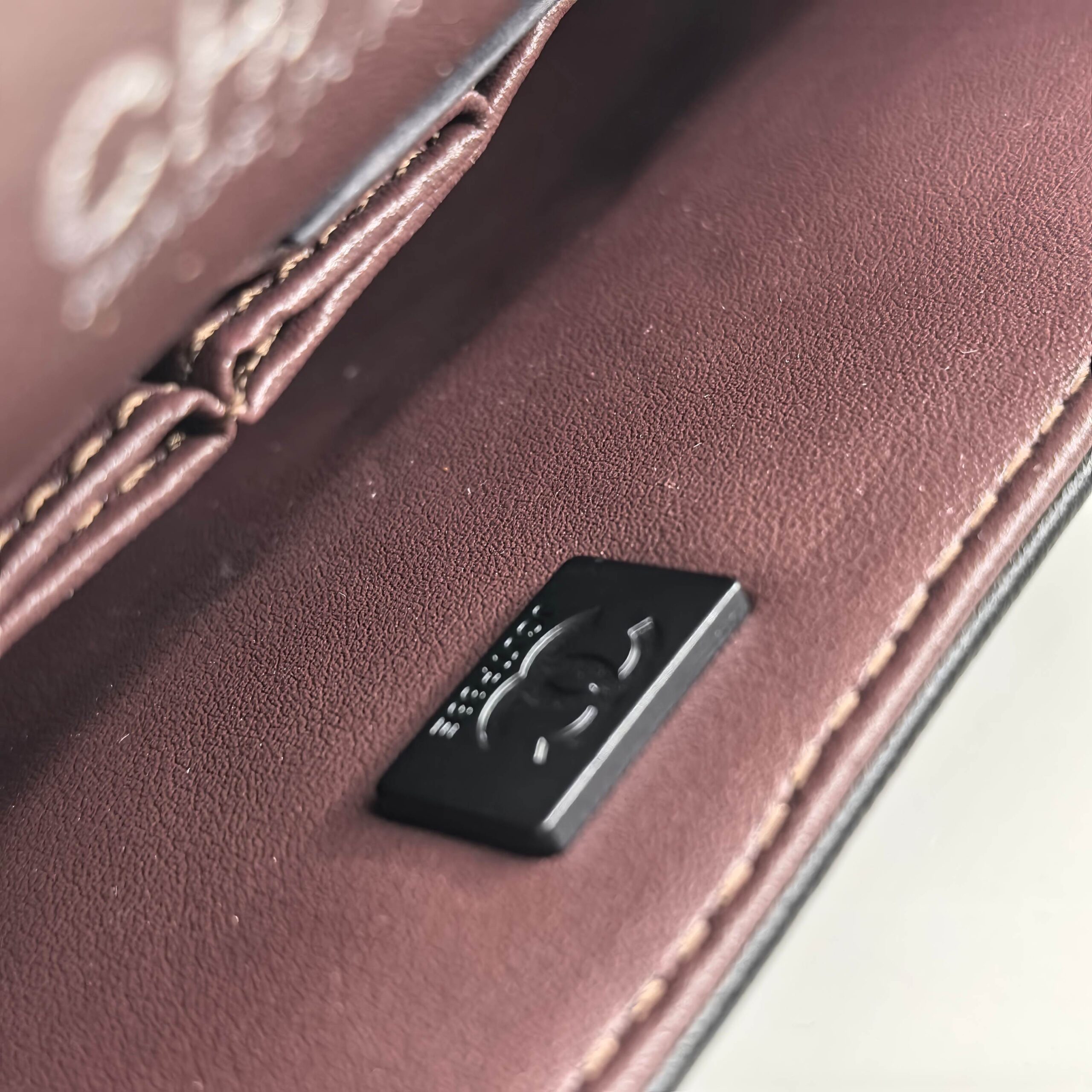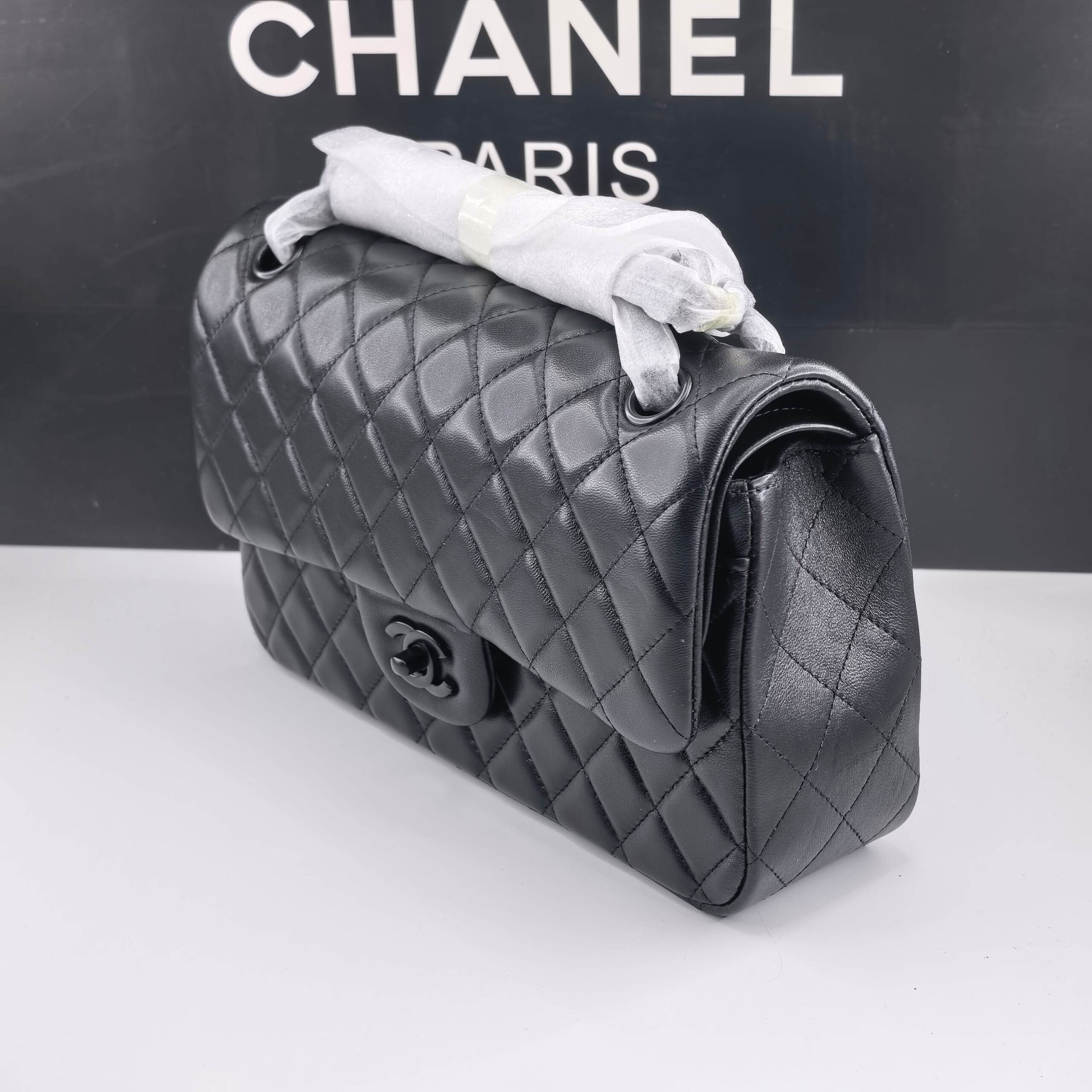 Black Style: Crafted from smooth black lambskin, it features subtle quilted stitching, a tonal leather interior (with embossed “CHANEL” branding), and polished gold hardware (including the CC clasp and chain-link strap fixtures).