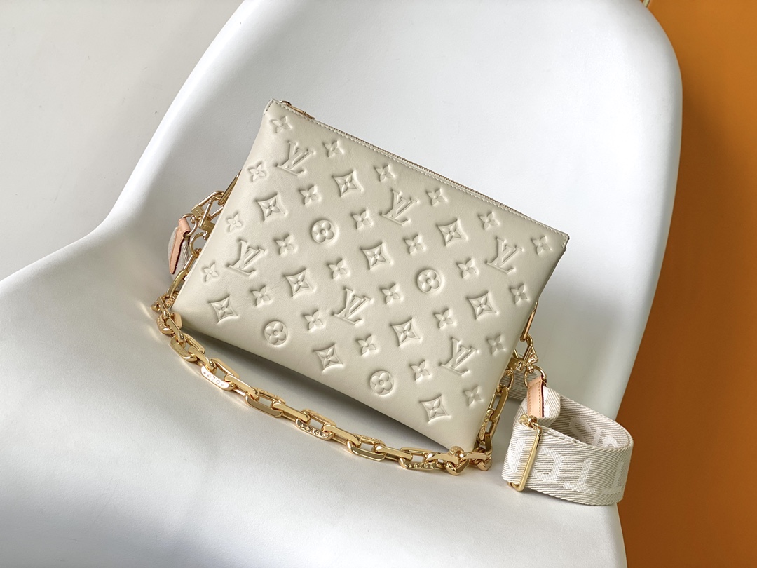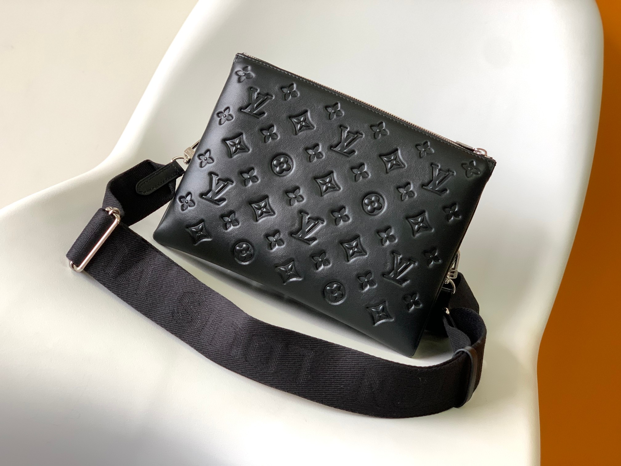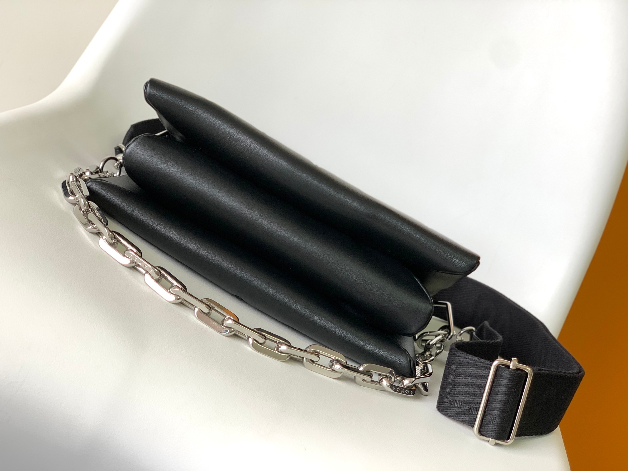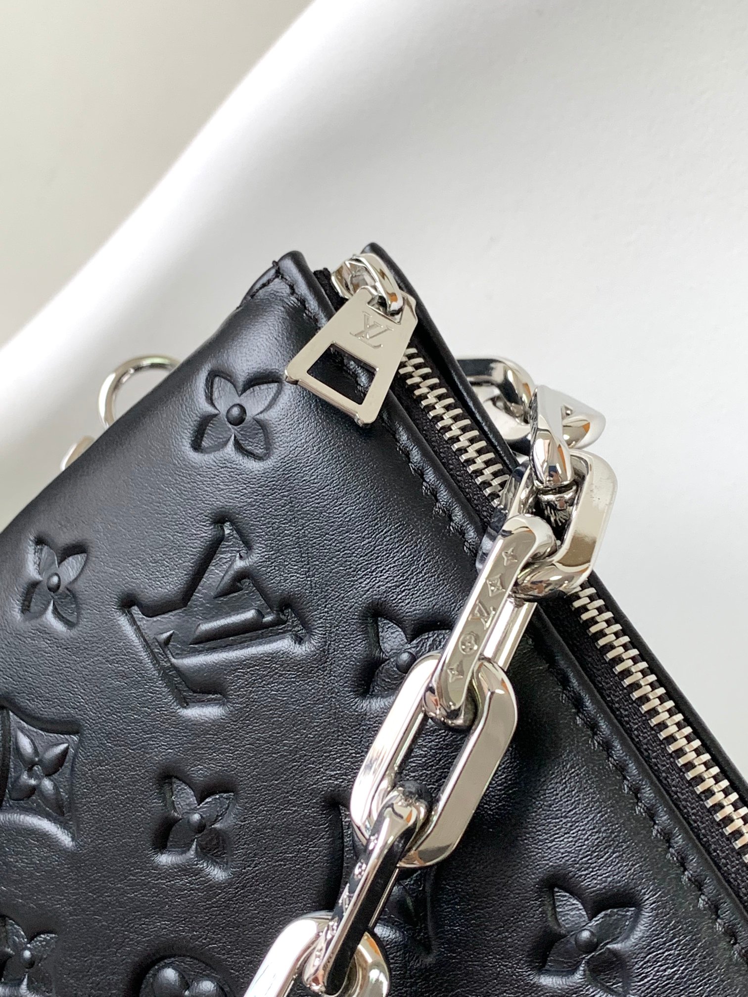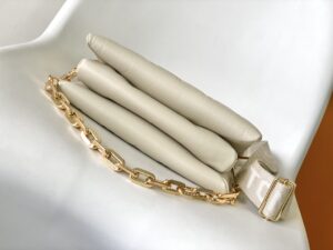 Crafted from plush embossed lambskin (featuring tonal Monogram patterns), it has a distinctive “pillow” silhouette that blends minimalism with edgy style.