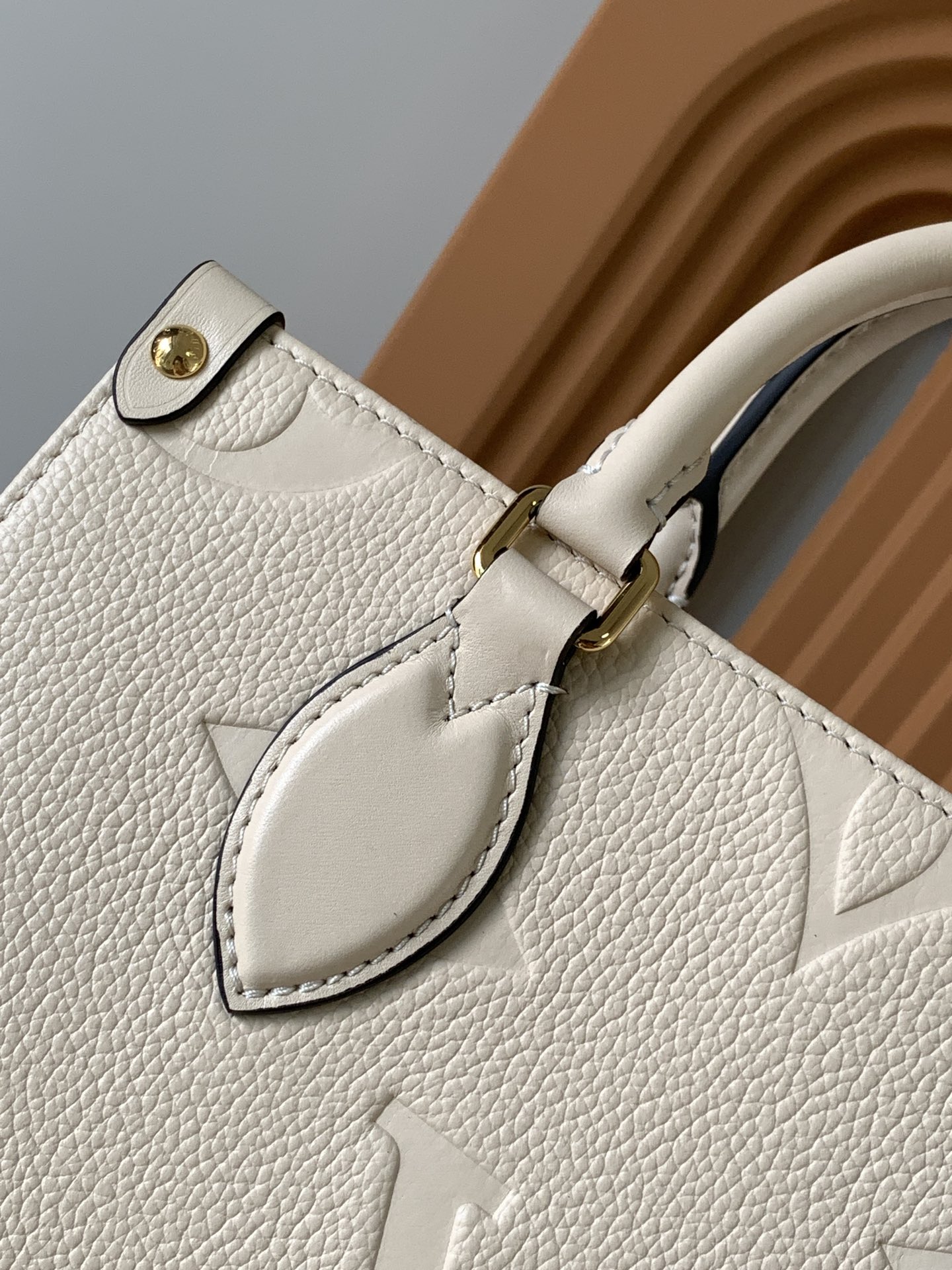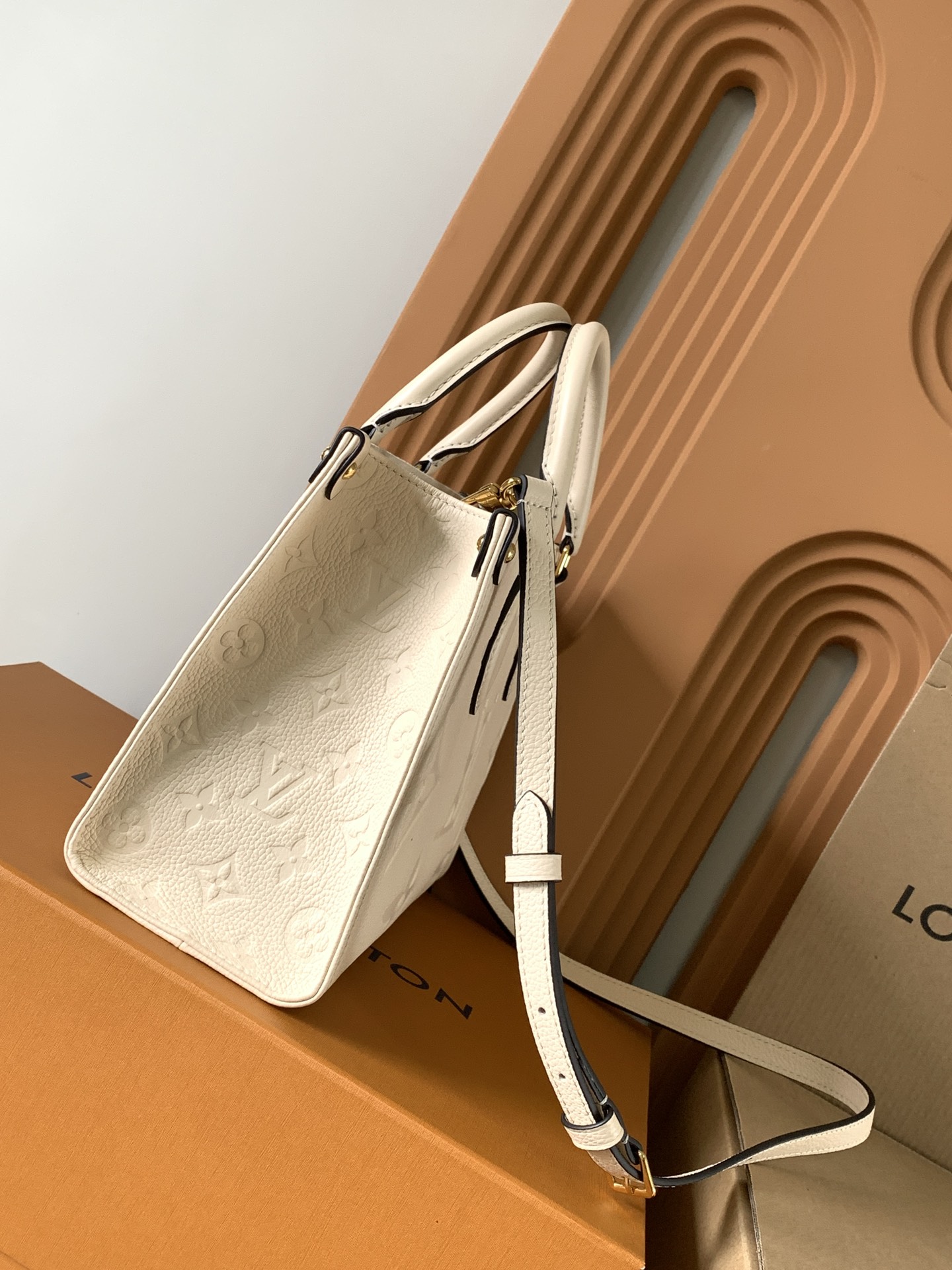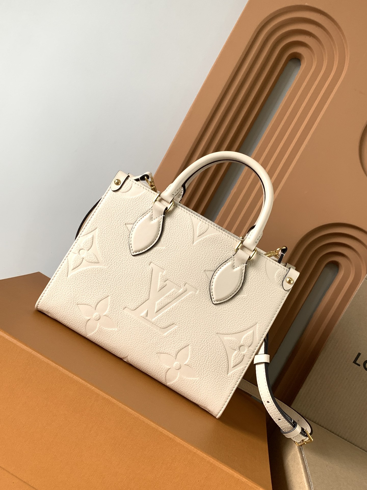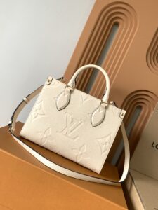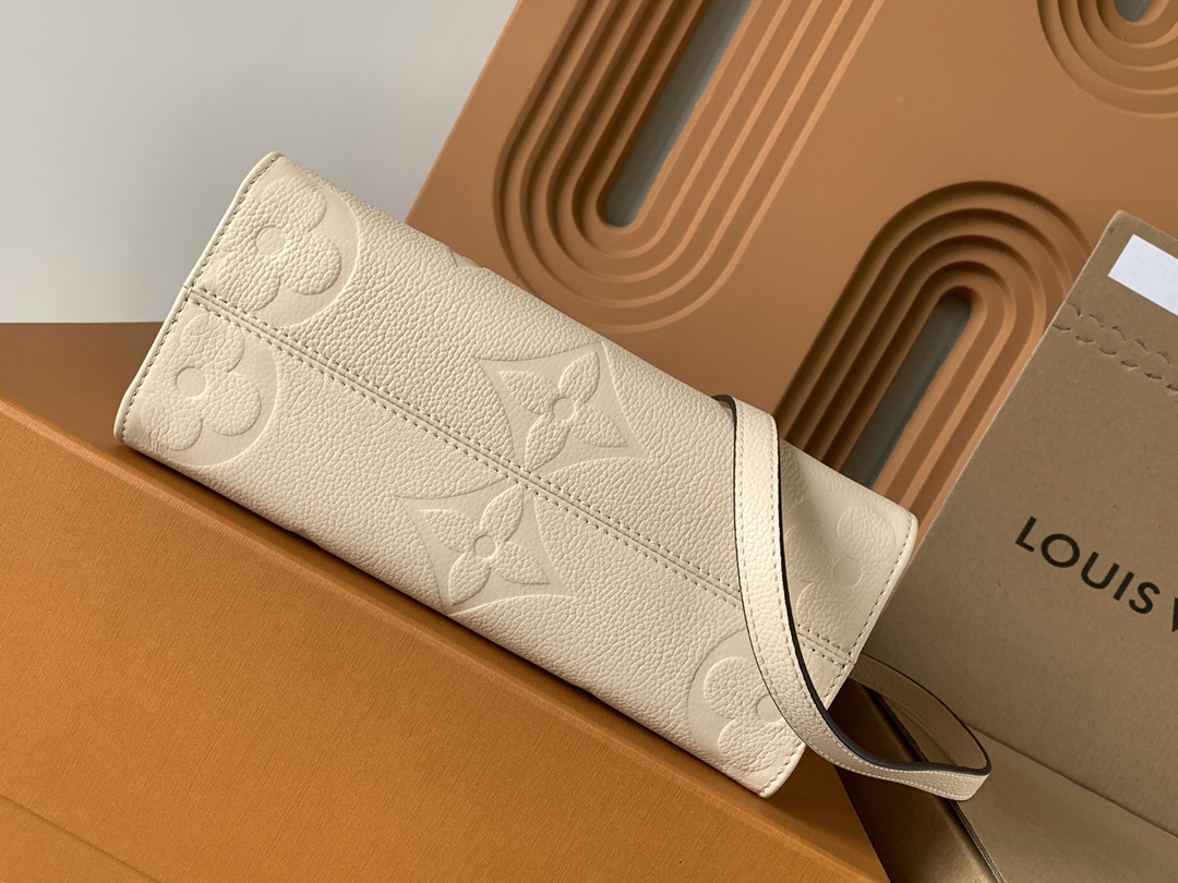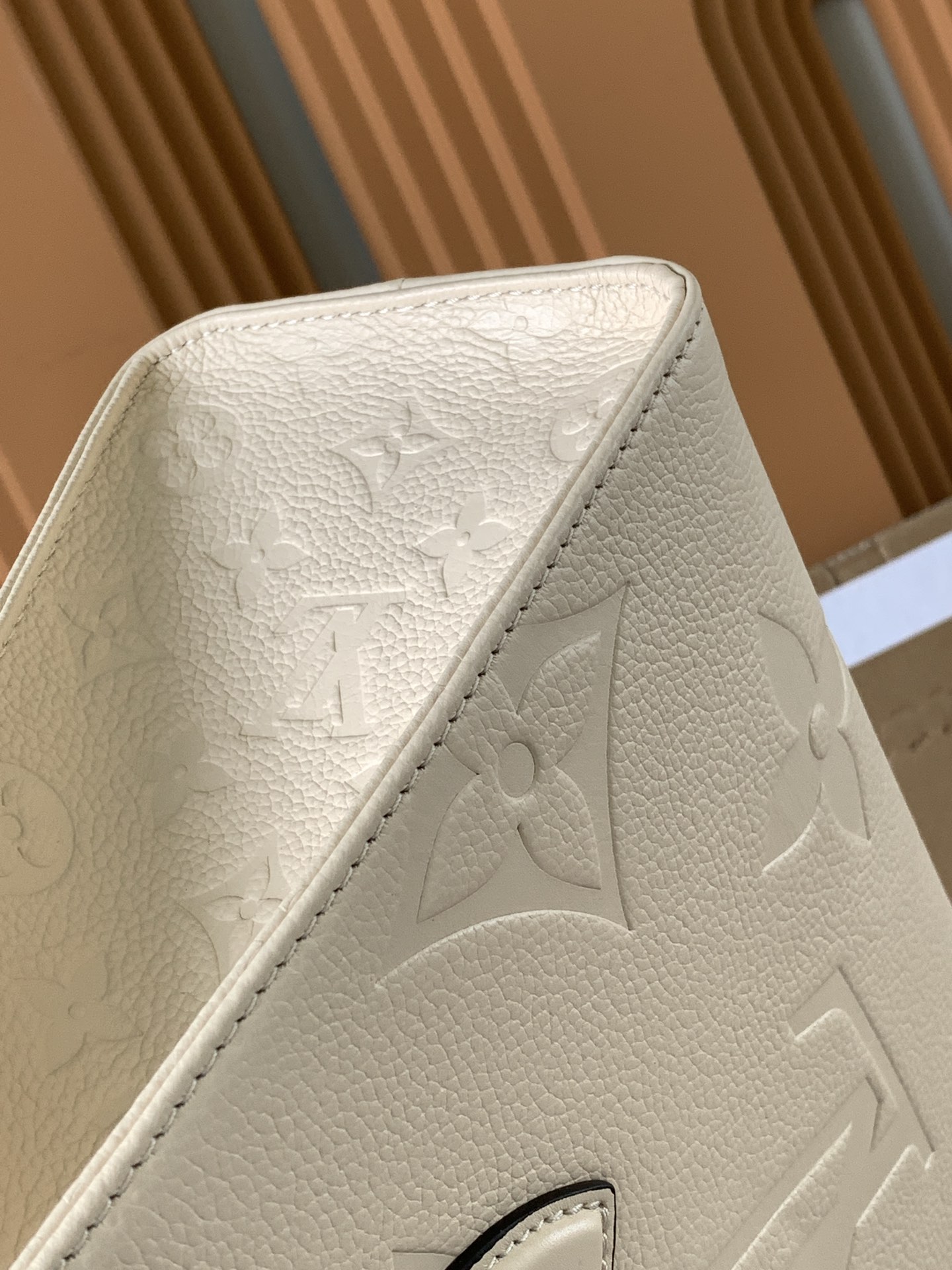 This set features a Louis Vuitton handbag and matching wallet, crafted from cream-colored textured leather with the brand’s iconic embossed monogram and floral motifs.