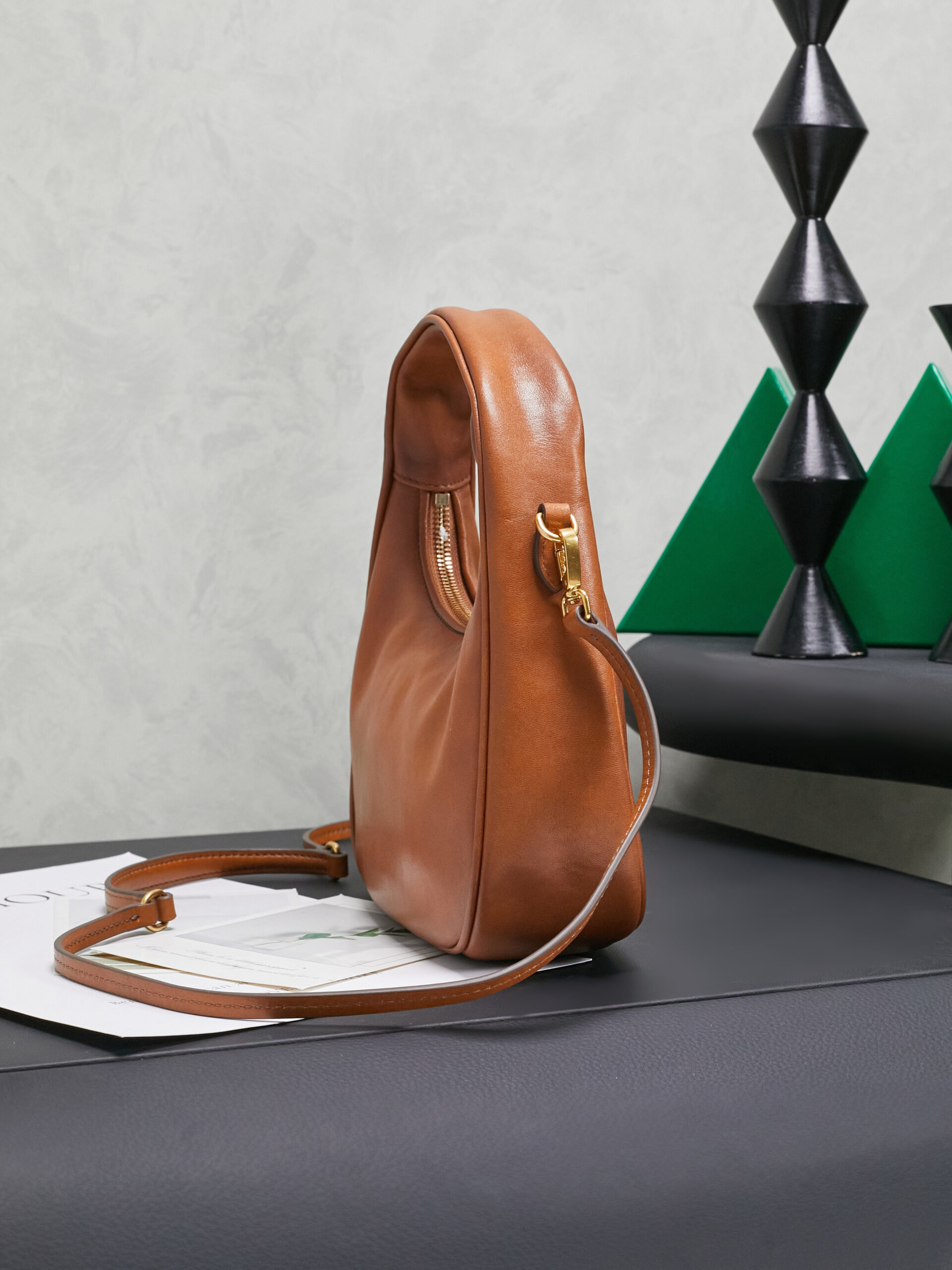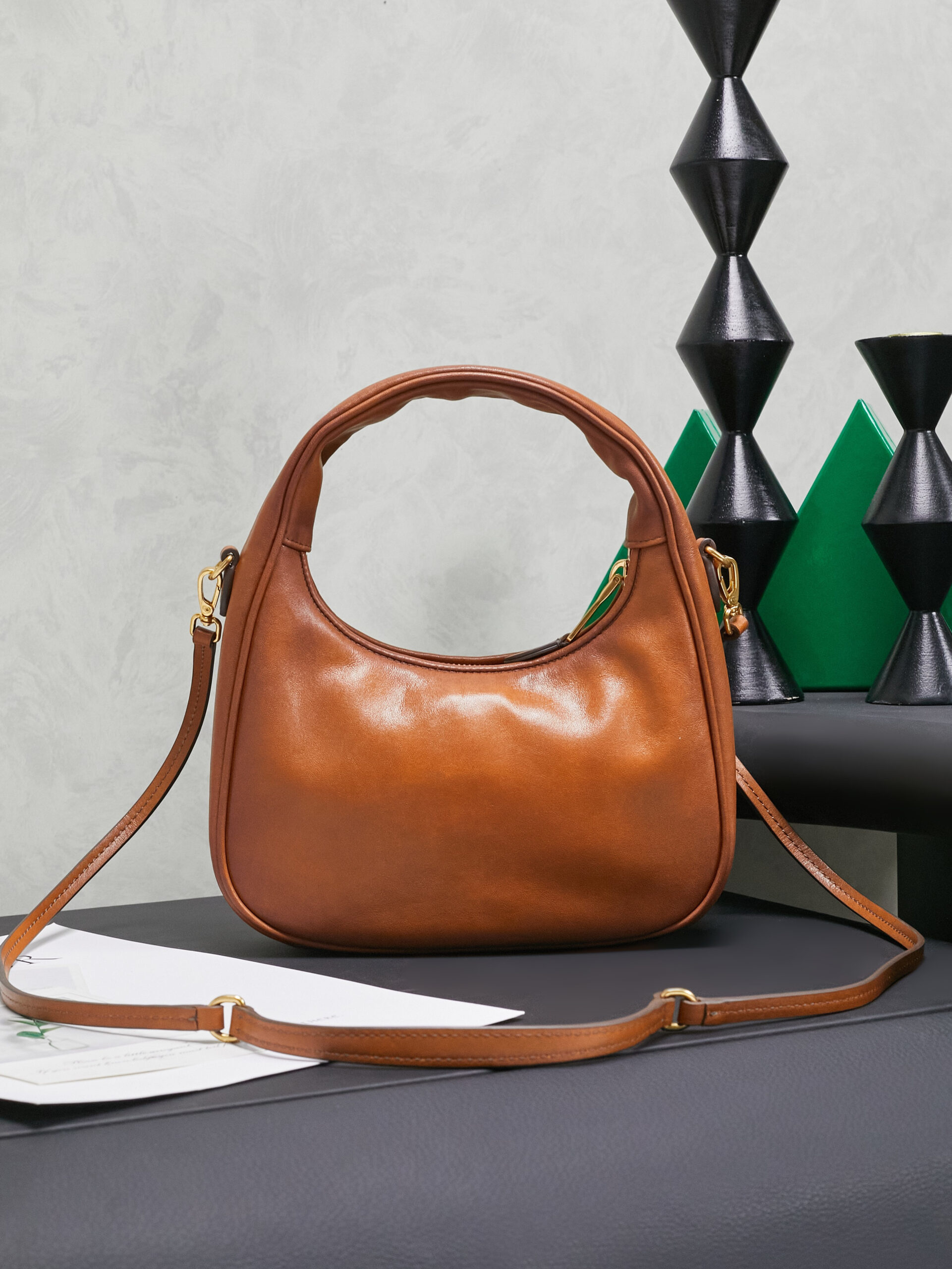 Crescent Hobo Bag – Tan Leather with Signature Branding (Playful Luxury Everyday Crossbody)