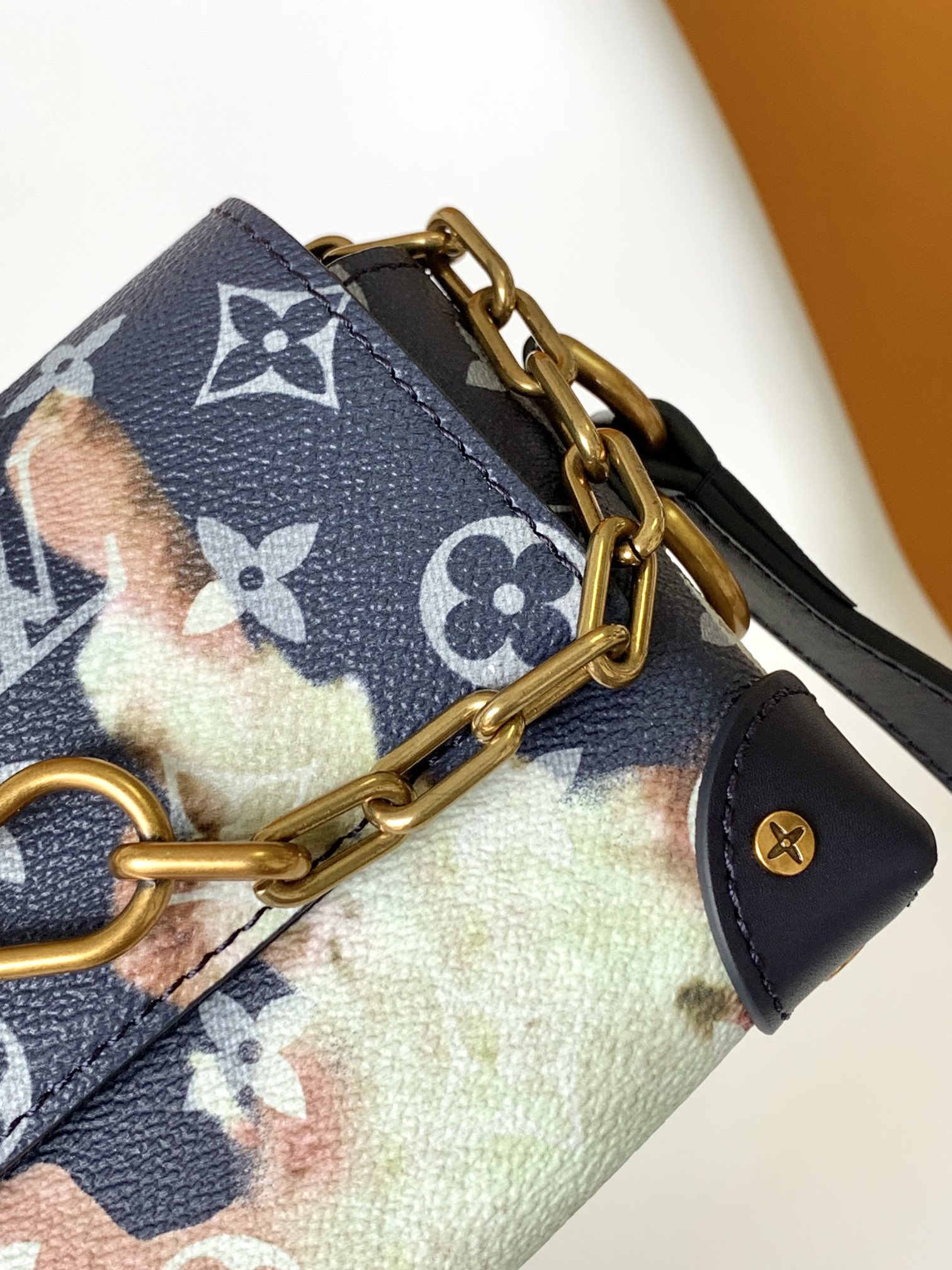 This is a Louis Vuitton compact crossbody bag, crafted from Monogram canvas with a striking two-tone design: a deep navy base paired with a soft pastel art print (featuring watercolor-style floral/flame patterns).