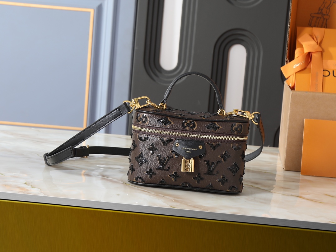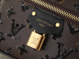 Embellished brown monogram version: Made from textured brown leather, adorned with black sequined LV monogram motifs.