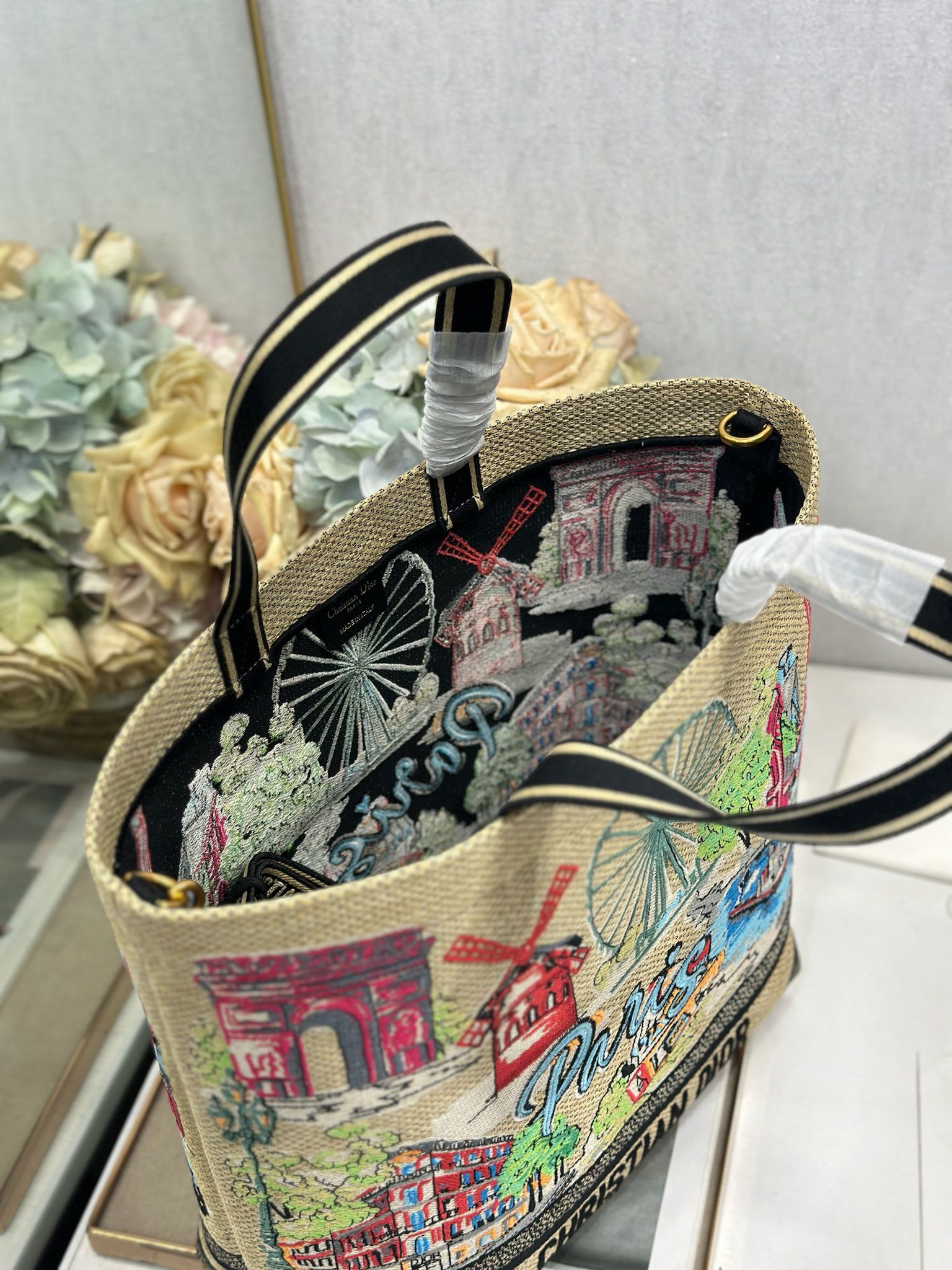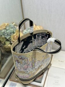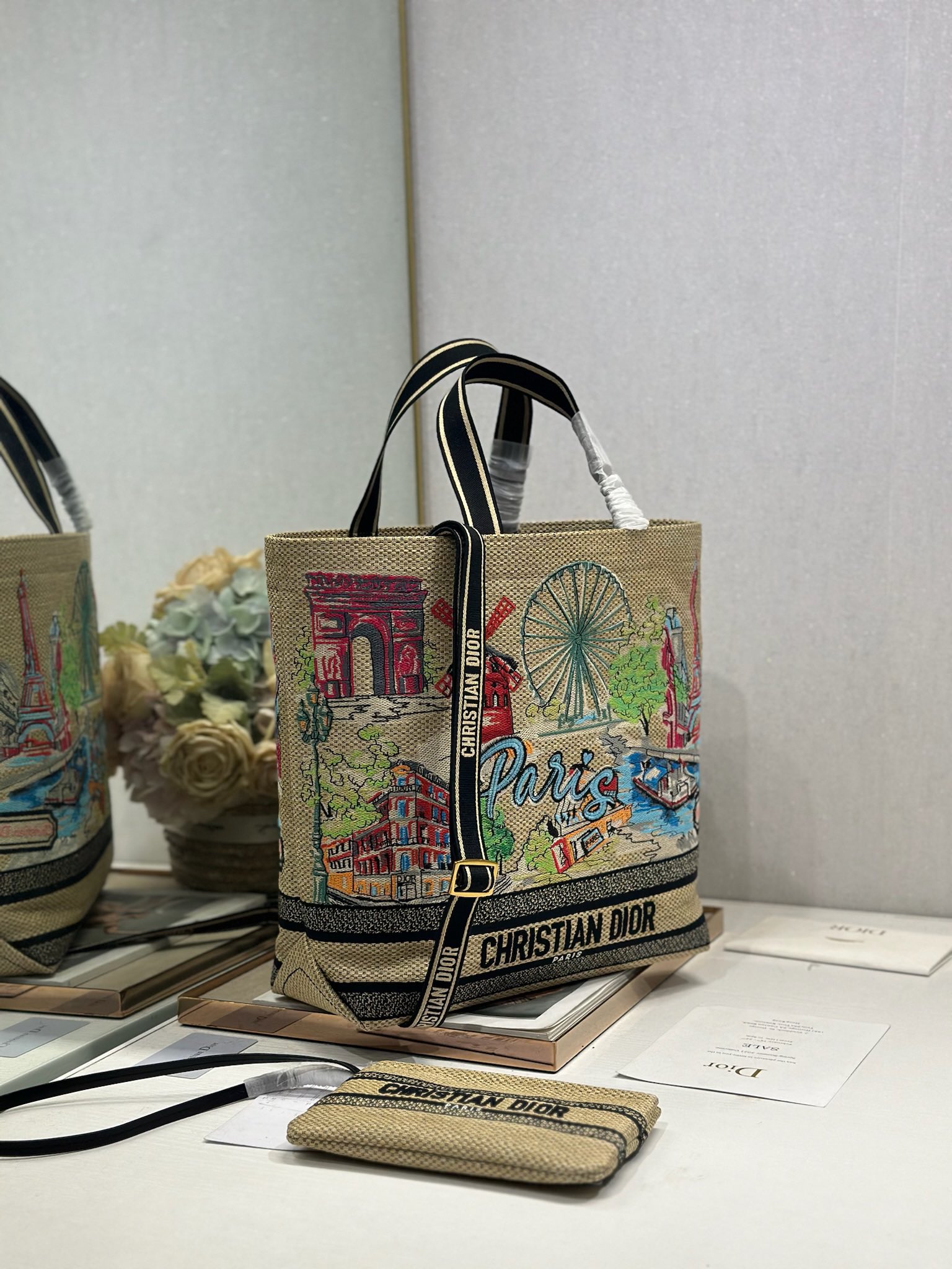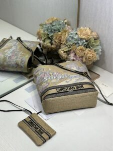 This Christian Dior tote bag set showcases a two-sided design, crafted from textured beige fabric with vibrant embroidered motifs.