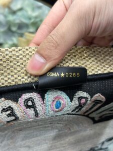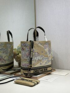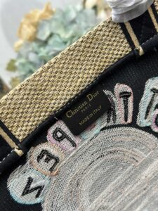 The bag comes with a black-and-gold striped top handle (protected by white wrapping) and an adjustable crossbody strap (printed with “CHRISTIAN DIOR”).