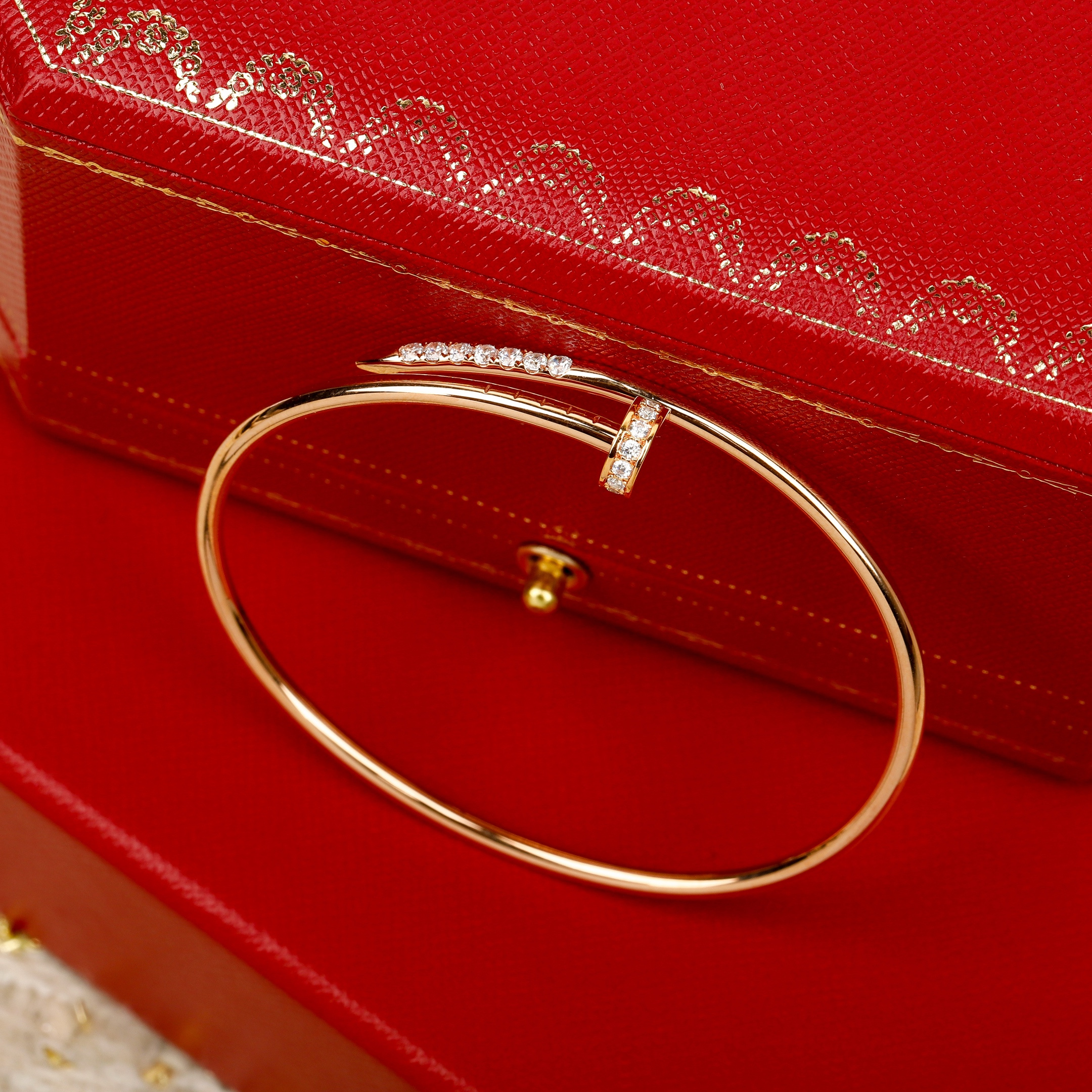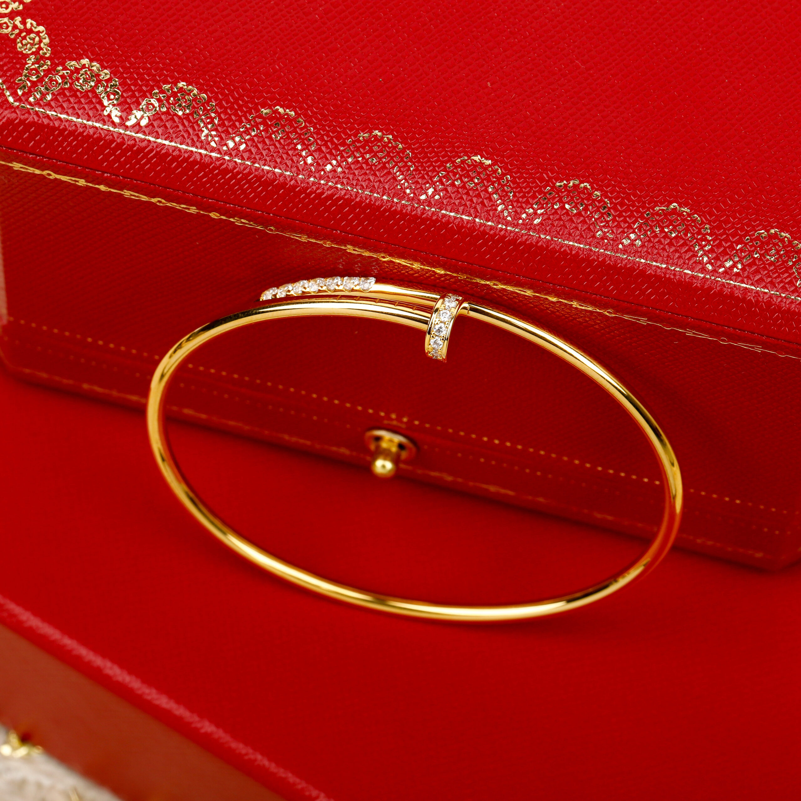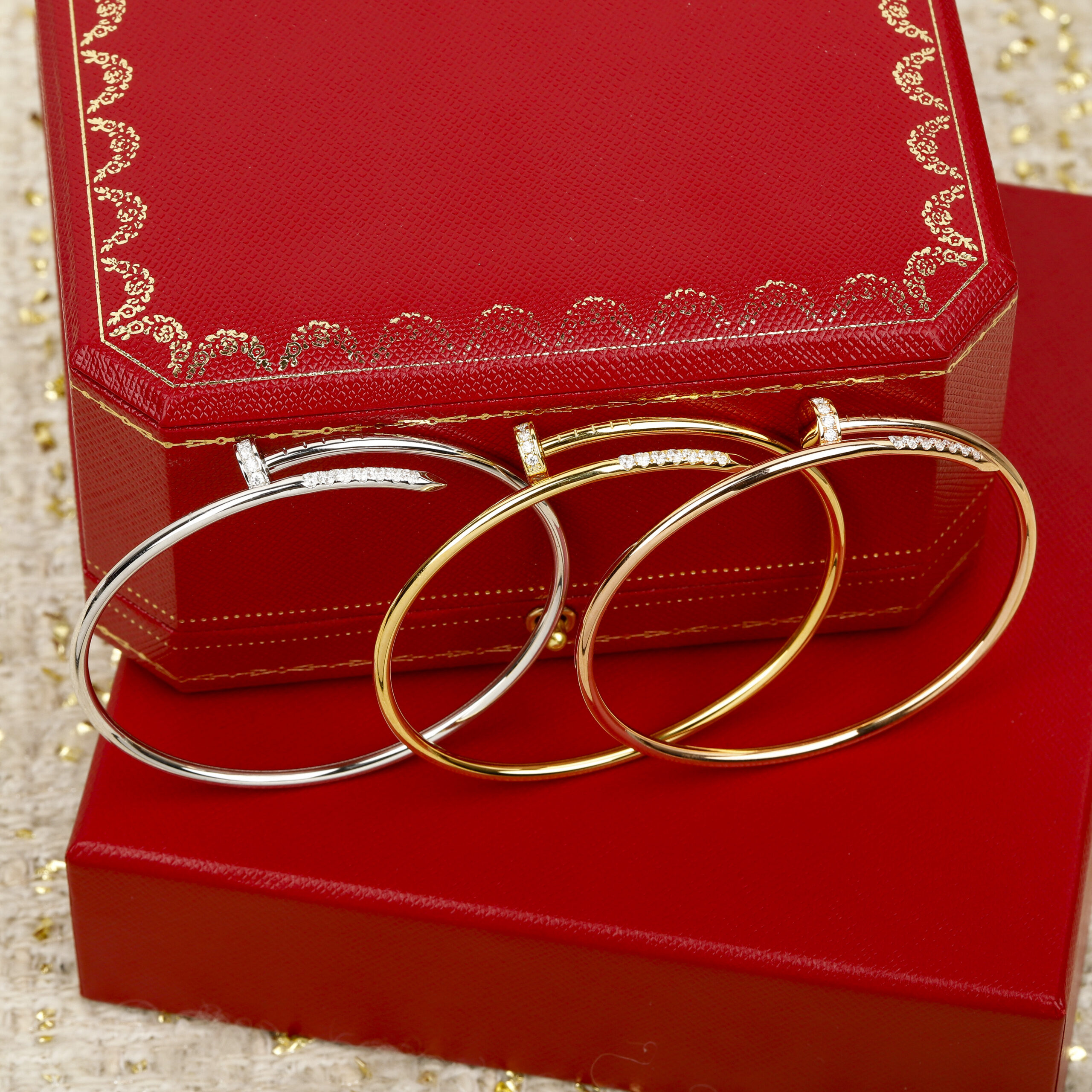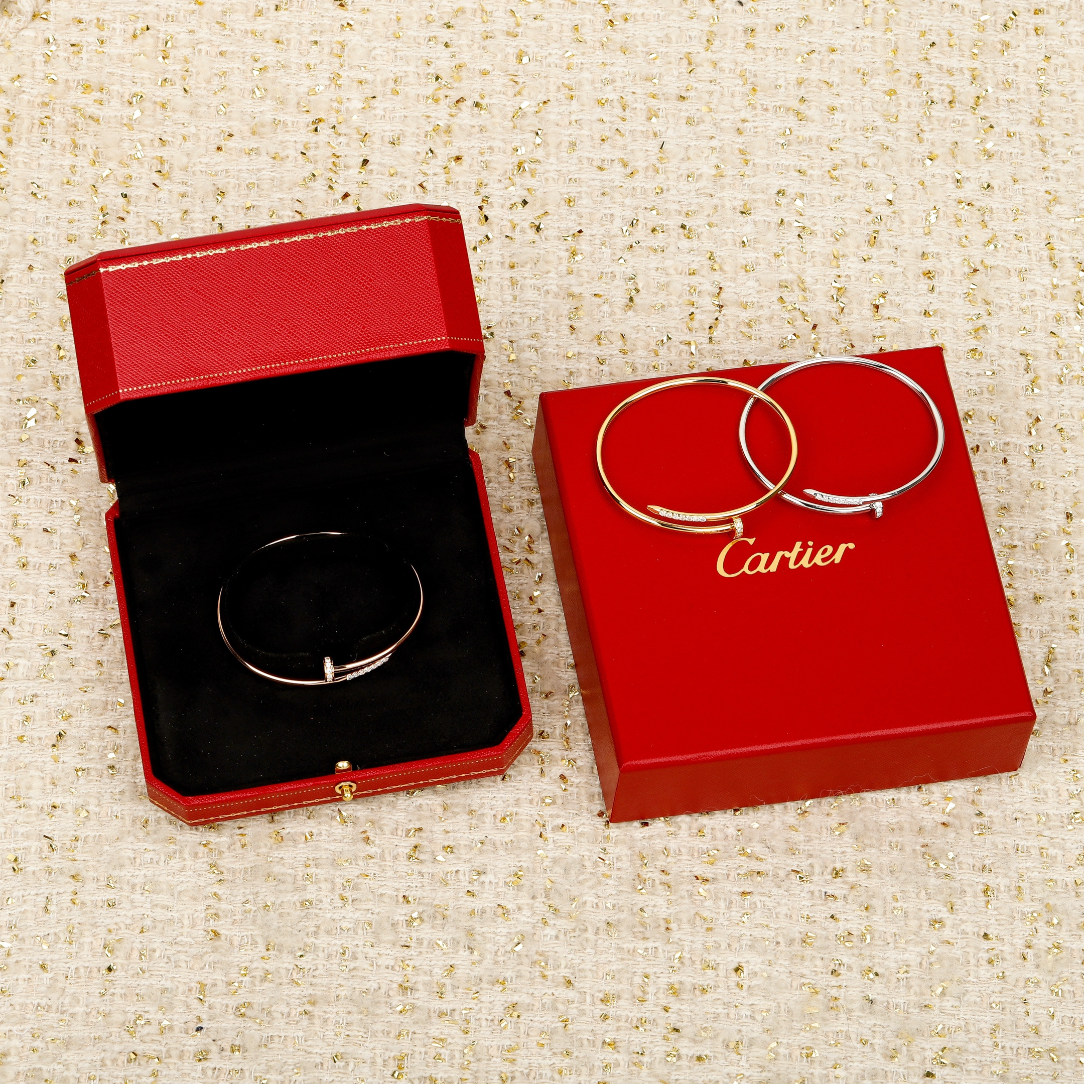 These are elegant double-band cuff bracelets from Cartier, presented in the brand’s signature red luxury packaging.