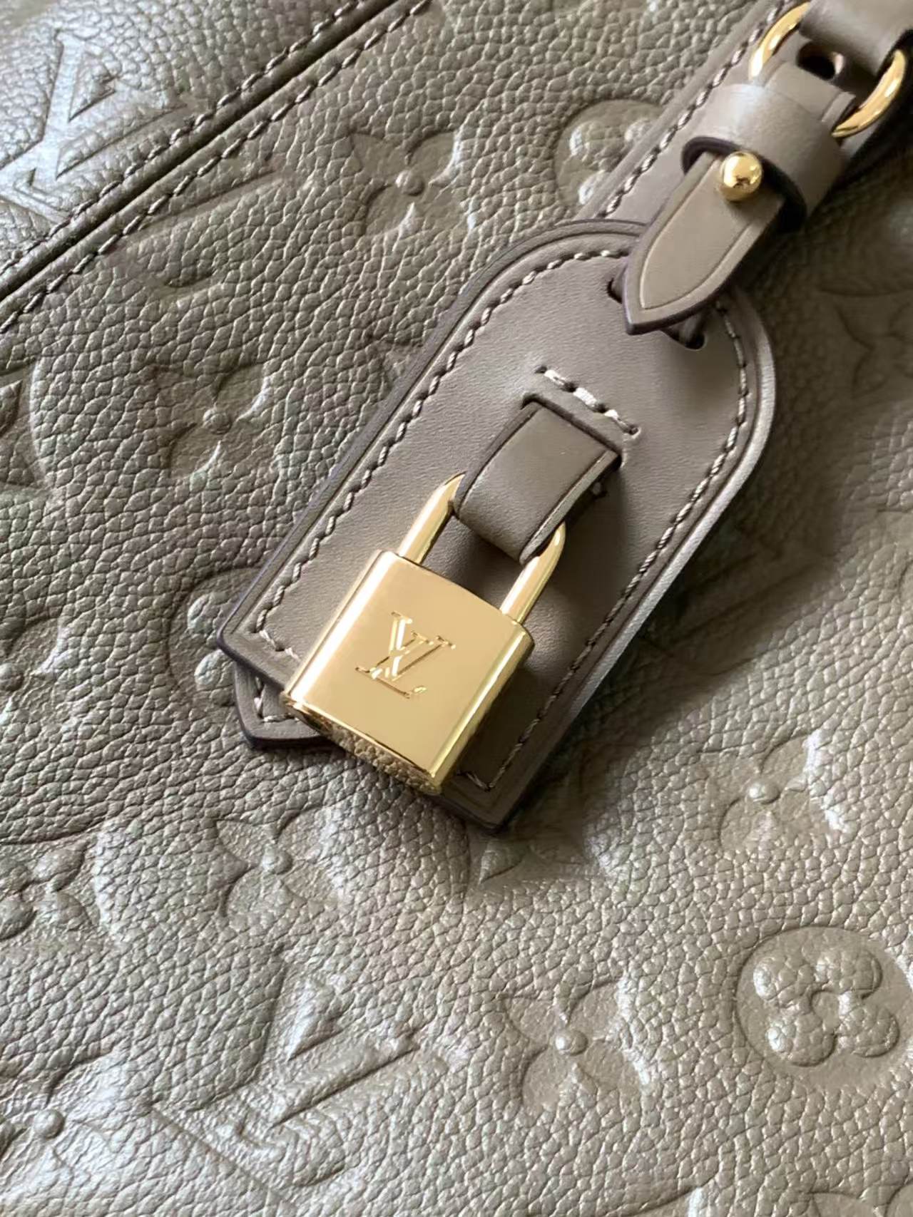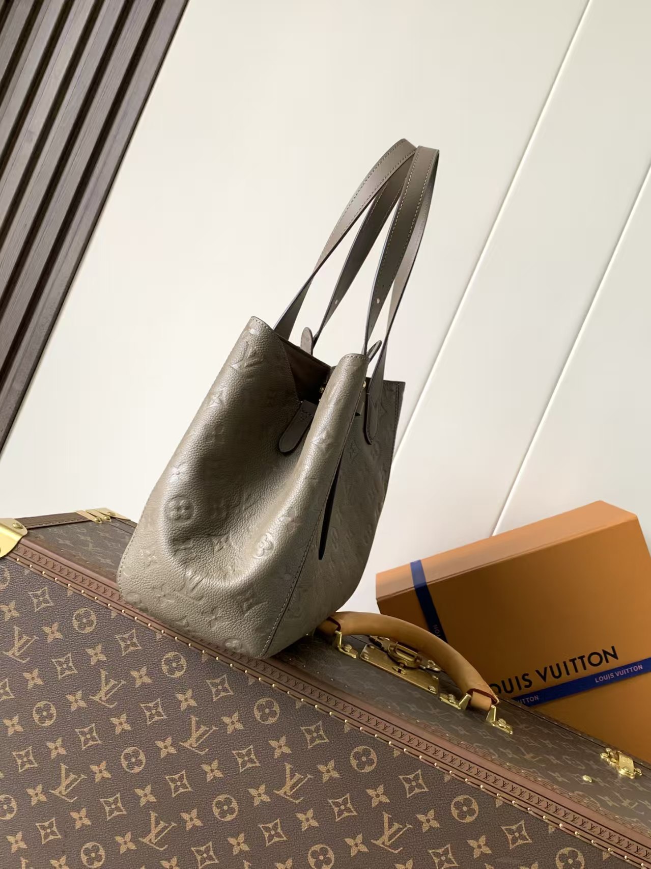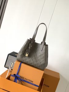 The product in the pictures is a tote bag from Louis Vuitton, crafted from gray embossed leather featuring the brand’s signature LV monogram and floral motifs.