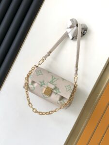 This is the Louis Vuitton Favorite handbag (cream with mint green monogram), crafted from soft grained leather embossed with an oversized Monogram pattern.