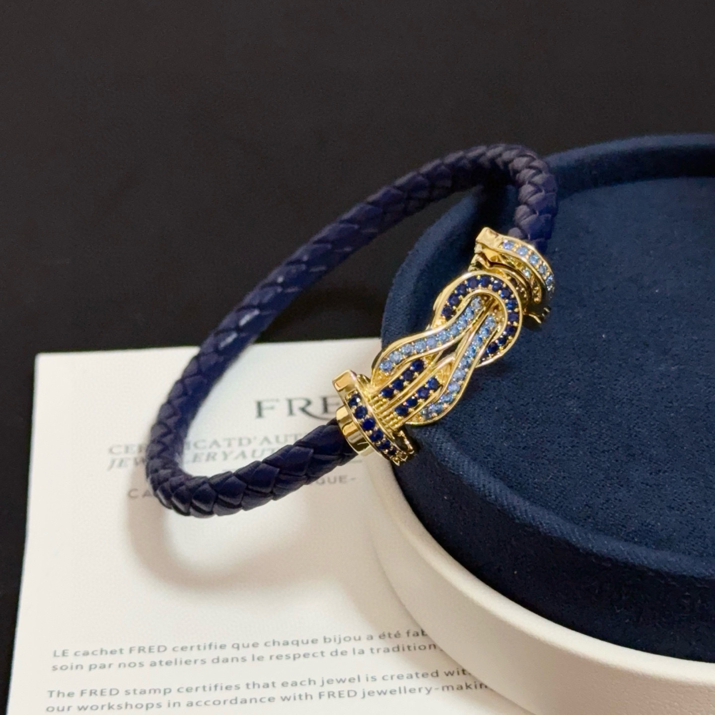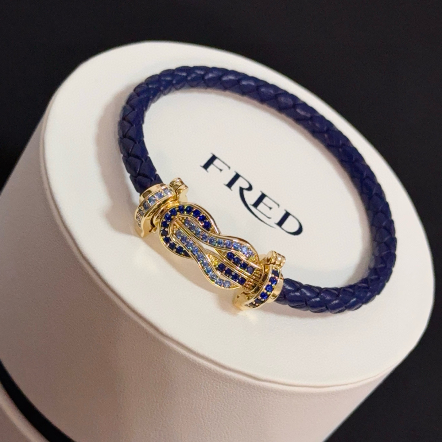 This is a signature Force 10 bracelet from FRED, featuring a sleek navy blue braided leather band paired with a statement-making yellow gold clasp.