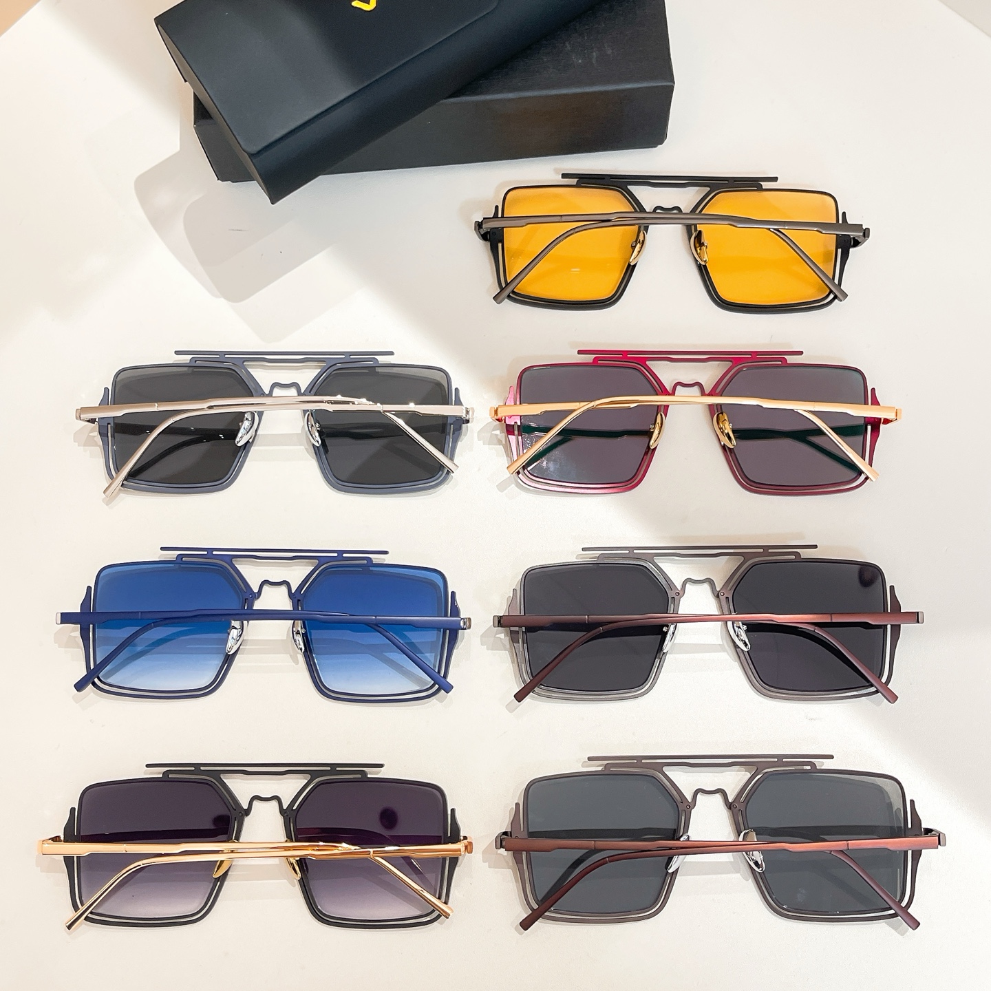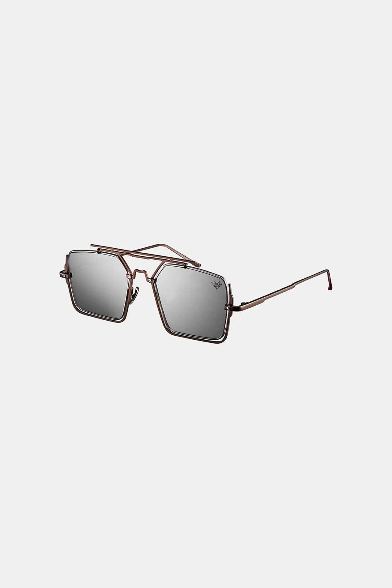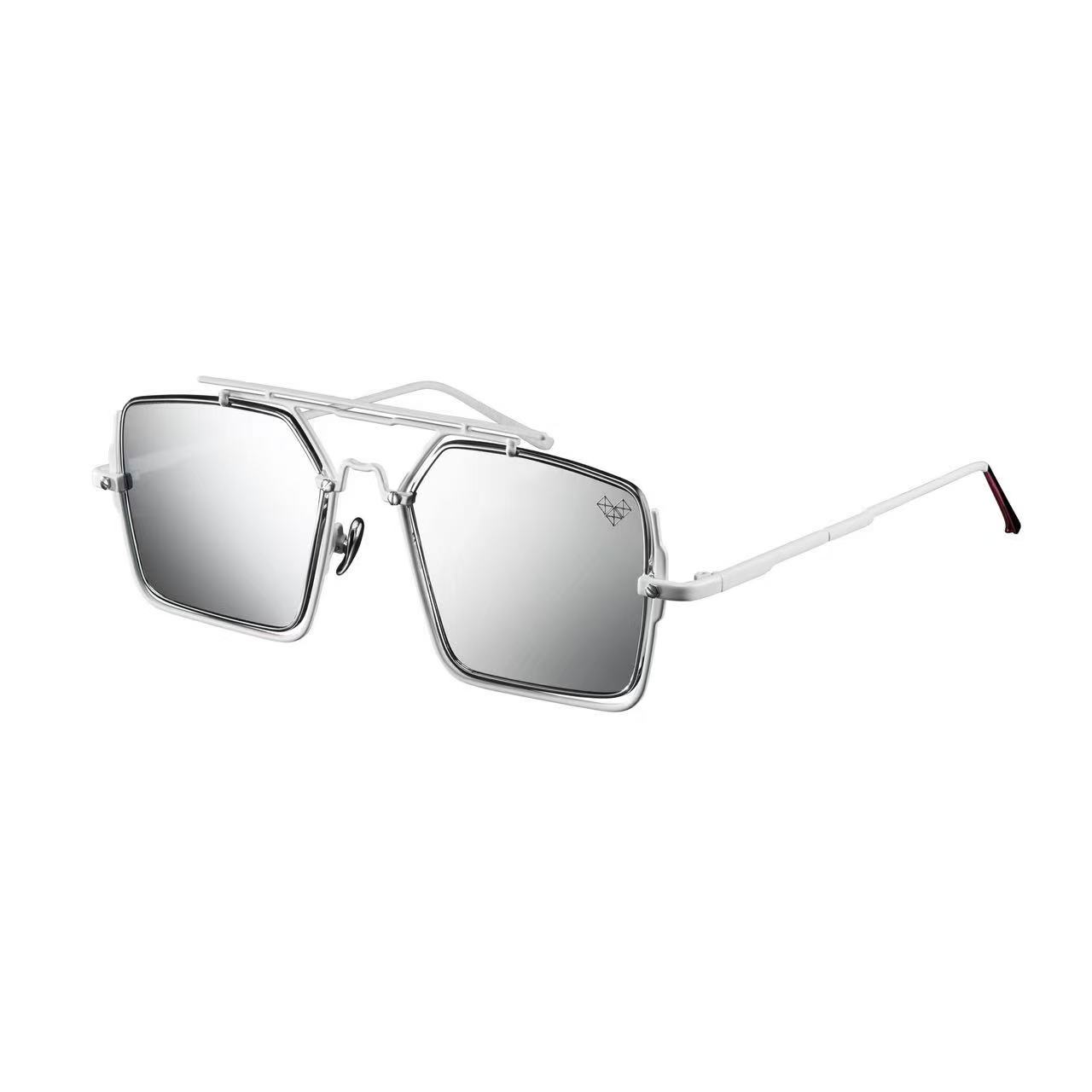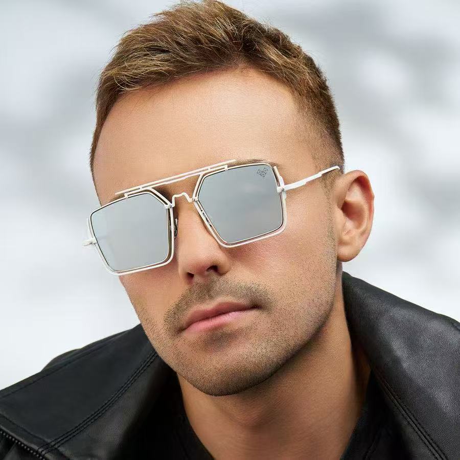 These are Vysen geometric square sunglasses featuring a distinctive layered metal frame design with double brow bars. - Available in a wide range of styles, including combinations of brown, white, black, red, and other metal frames paired with lenses in tints like gray, yellow, pink, blue, and gradient hues, the frames are crafted from high-quality metal.