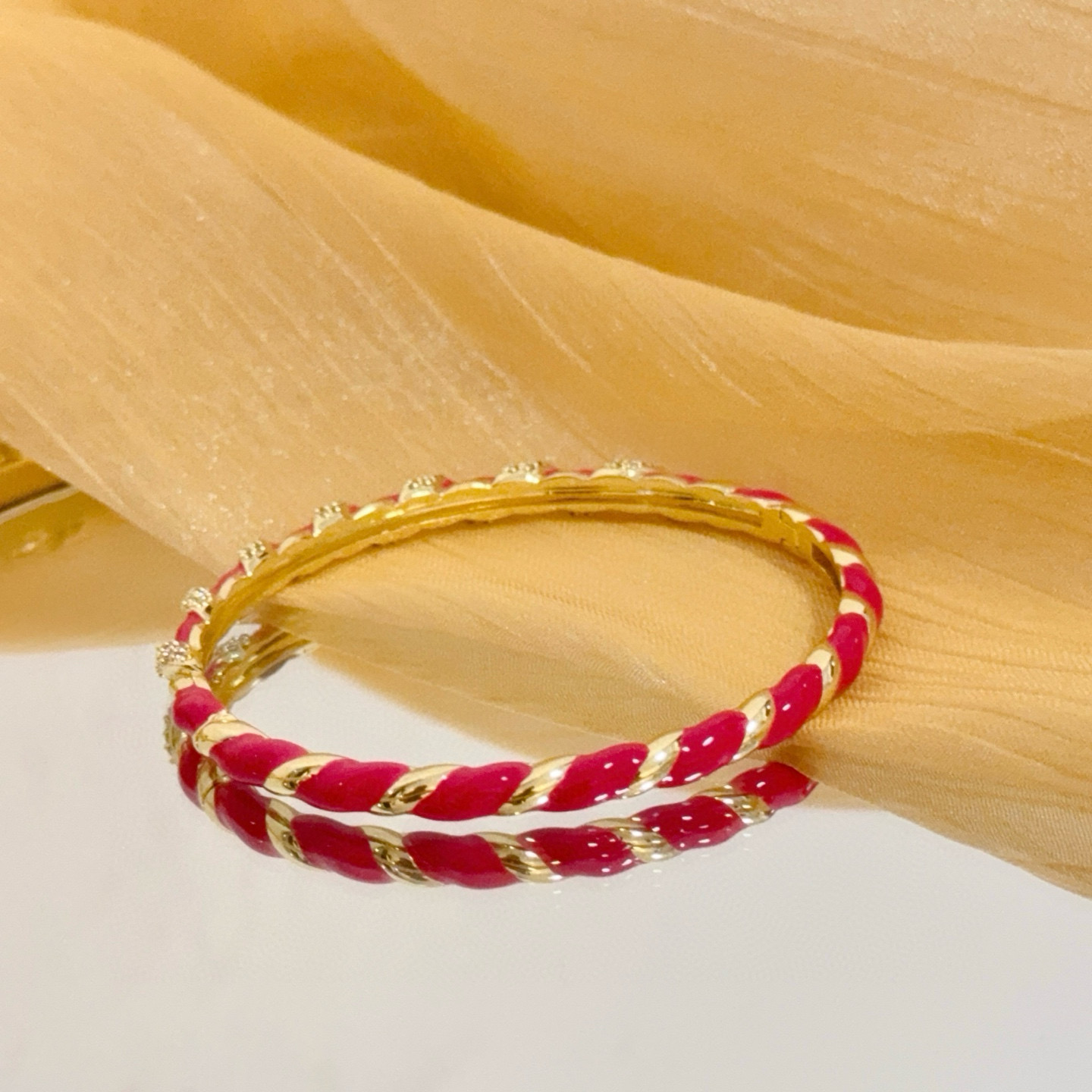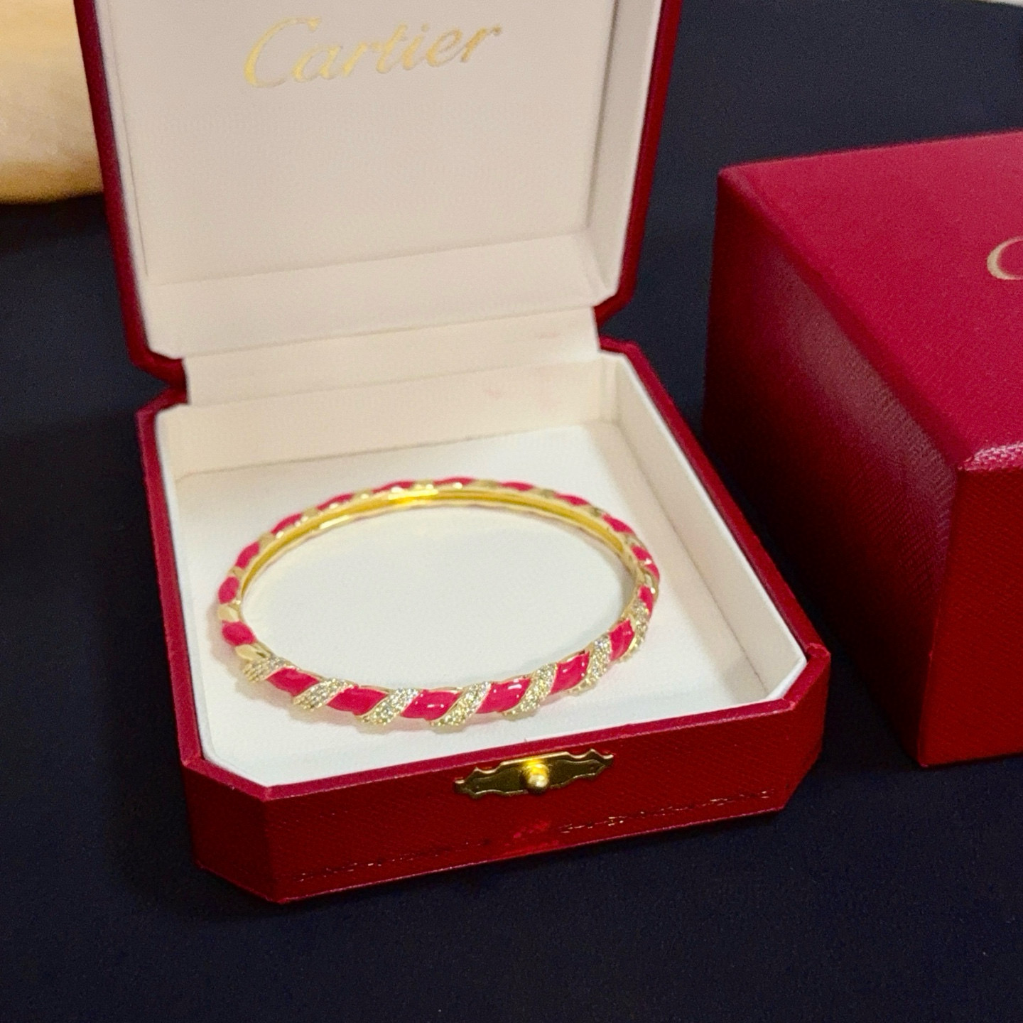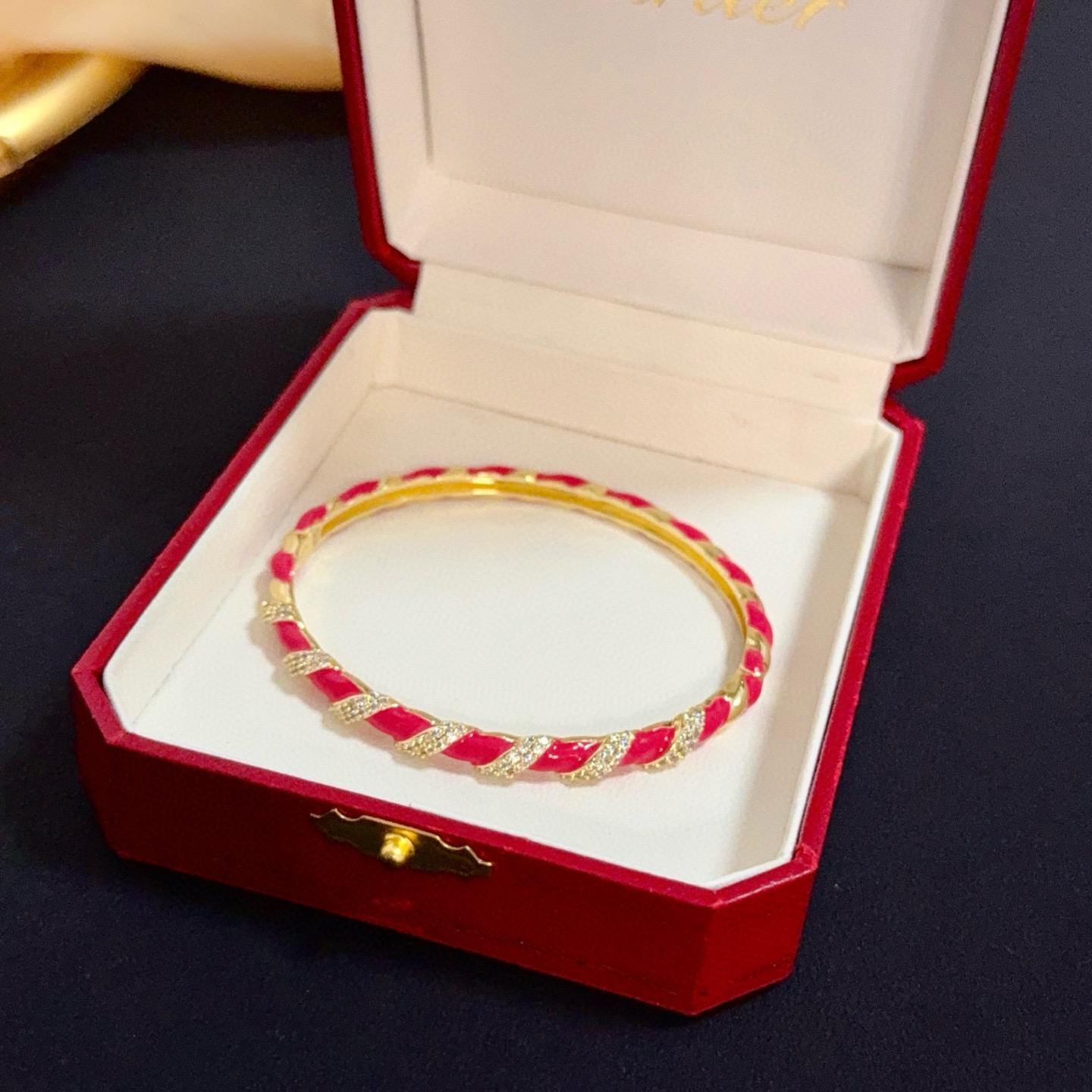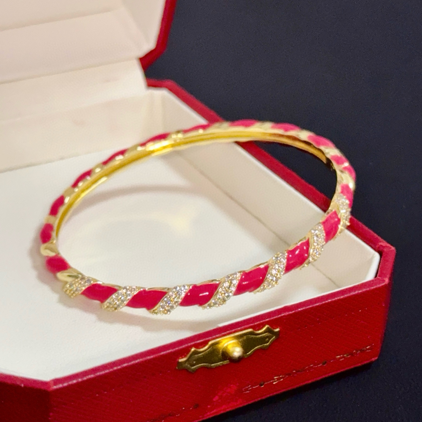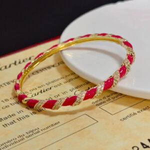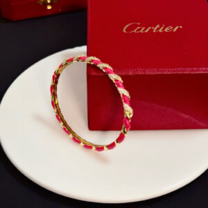 This is a vibrant bangle from Cartier, showcased in the brand’s iconic red luxury box (embossed with the “Cartier” logo).