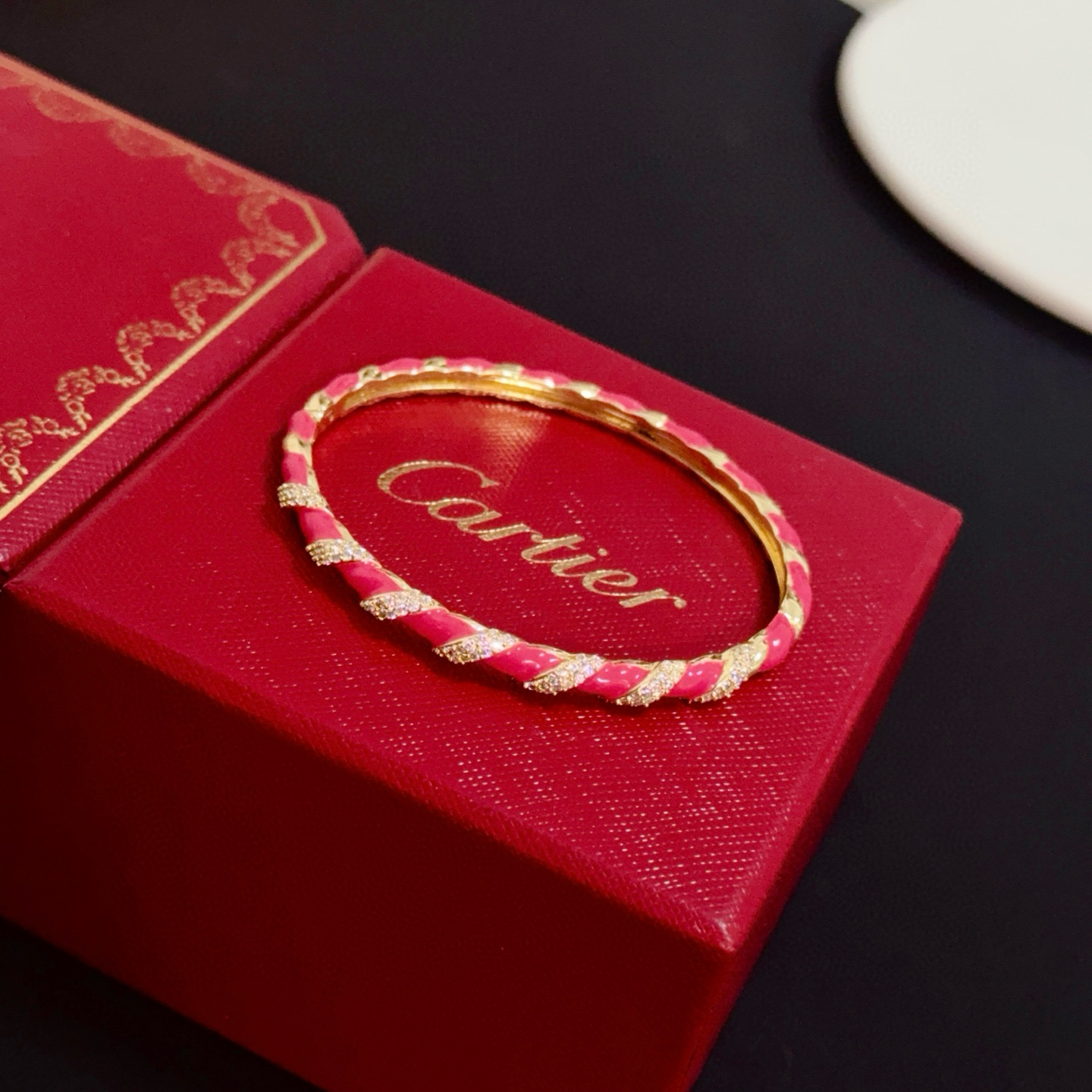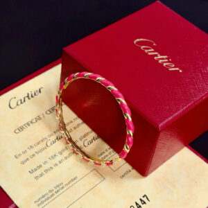 The bangle’s sleek, hinged structure reflects Cartier’s signature craftsmanship, while the bright pink enamel brings a playful, eye-catching pop of color.