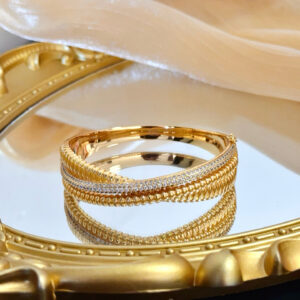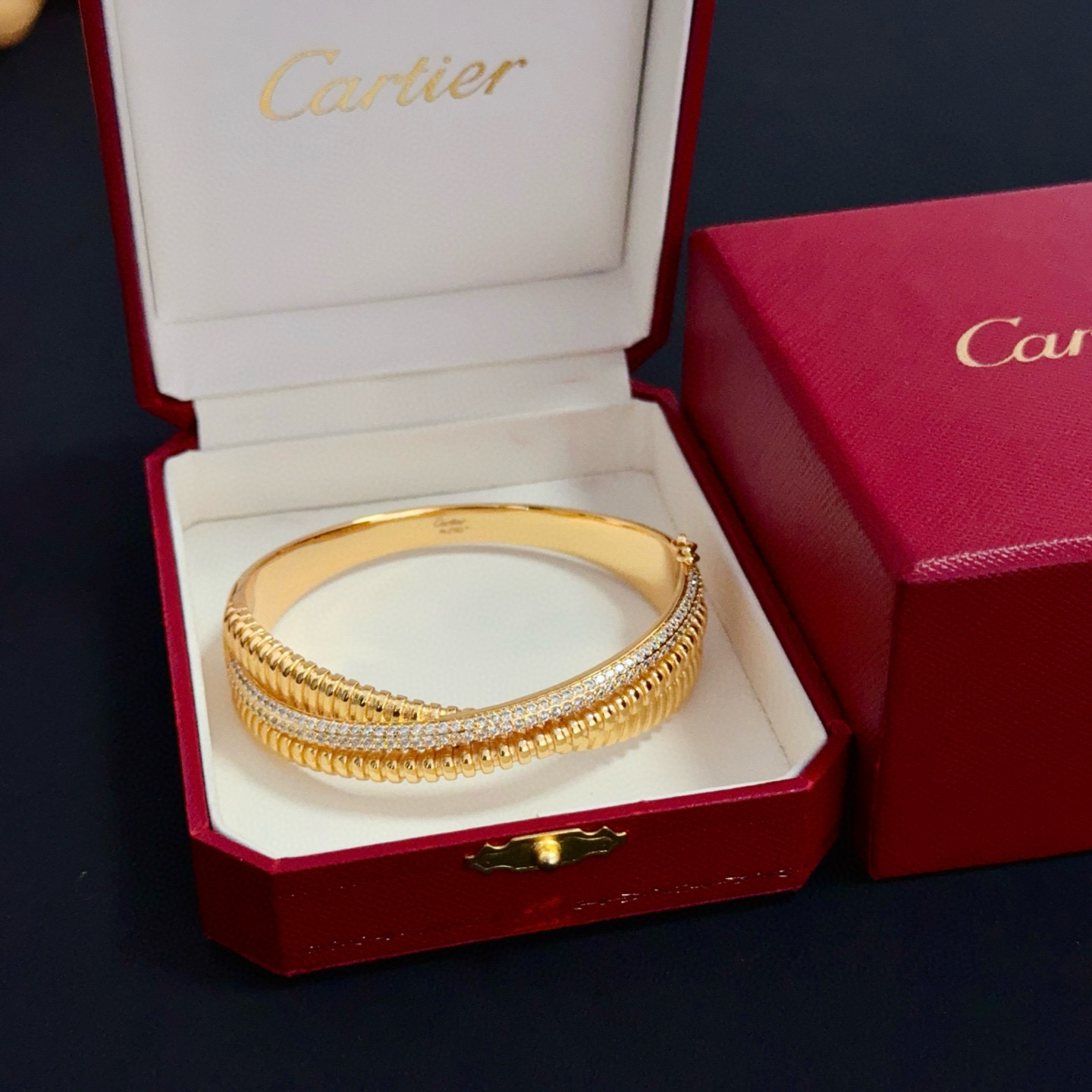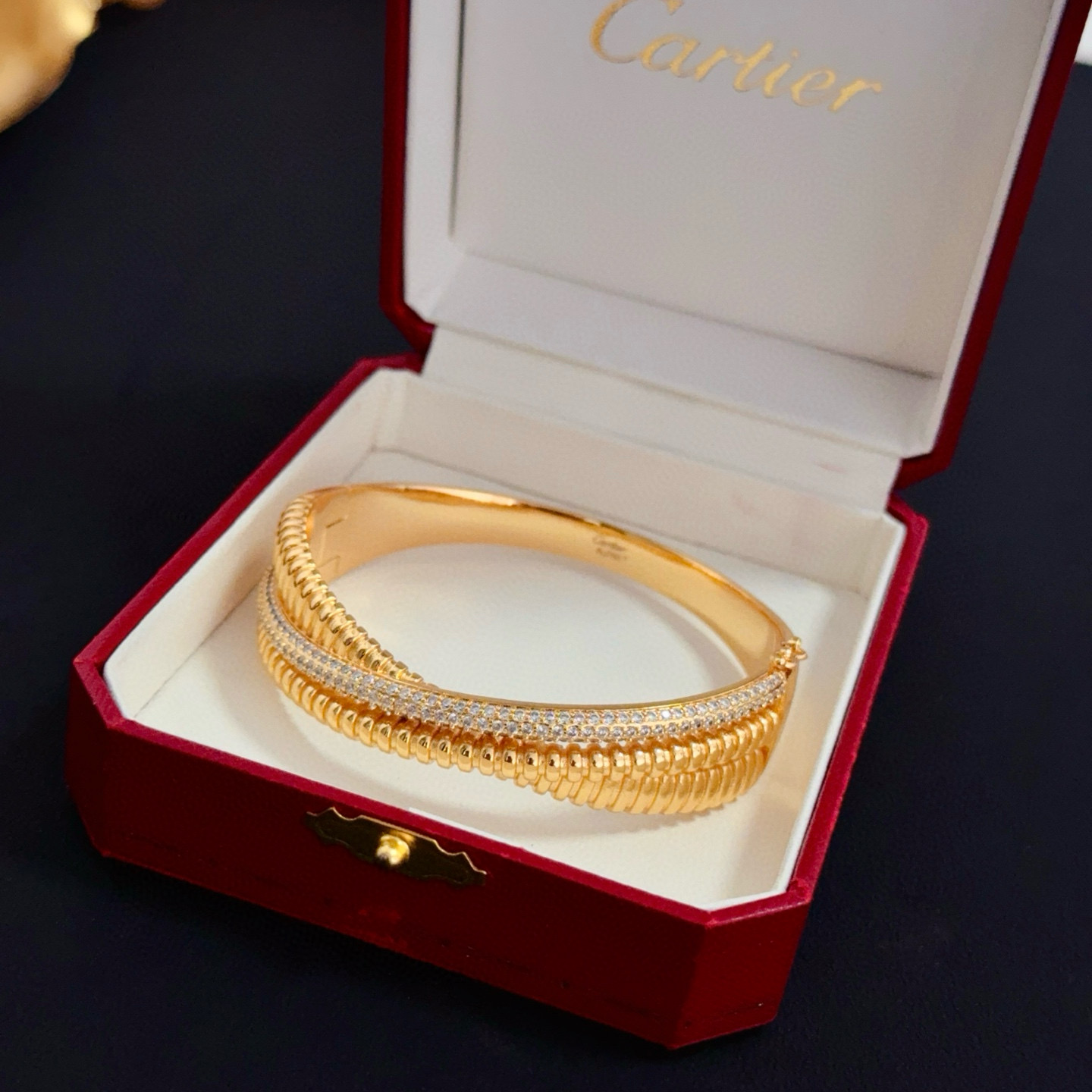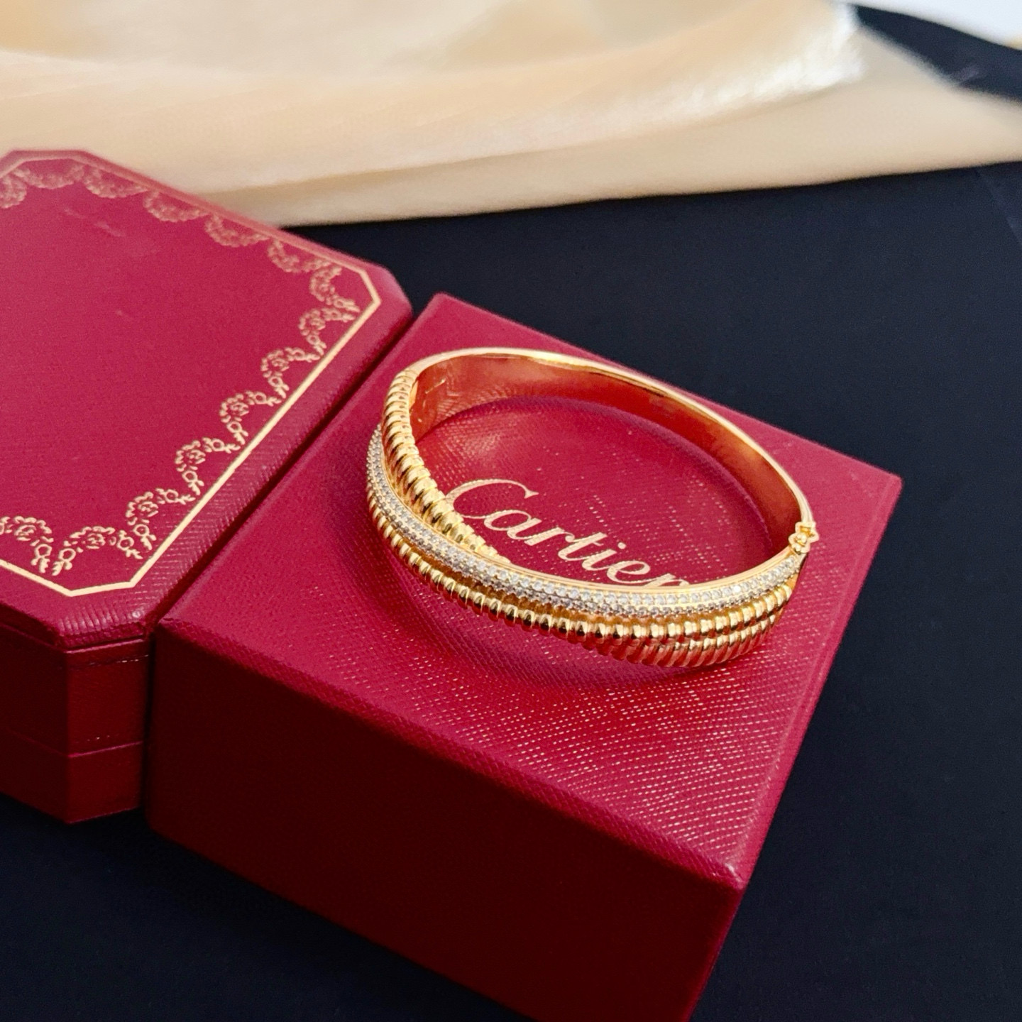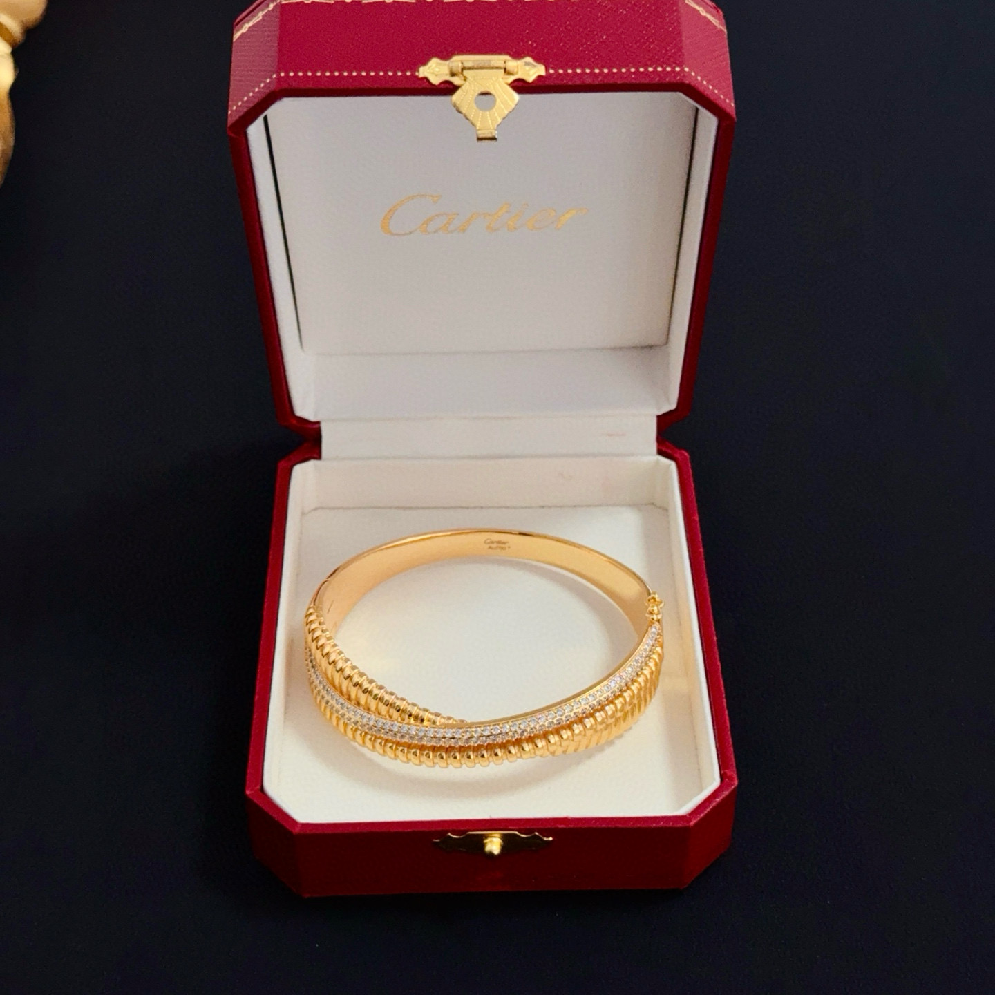 This is an elegant bangle from Cartier, presented in the brand’s iconic red luxury box (with the “Cartier” logo embossed in gold).
