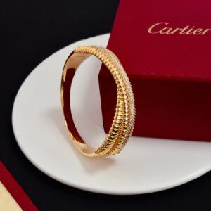 The bangle has a sleek, hinged construction (typical of Cartier’s refined craftsmanship) and balances intricate texture with understated sparkle.