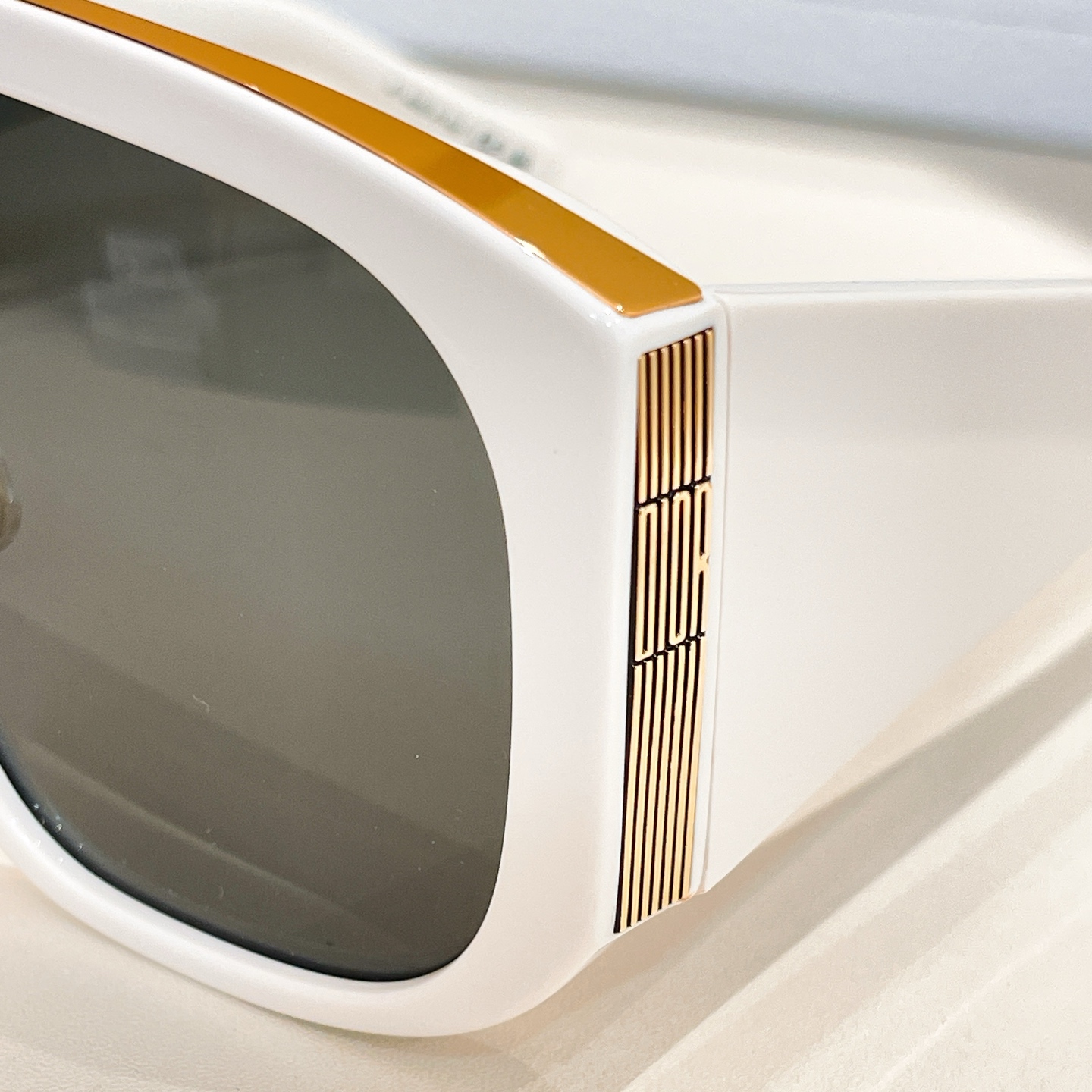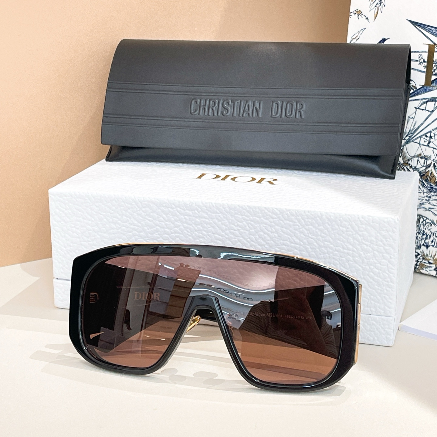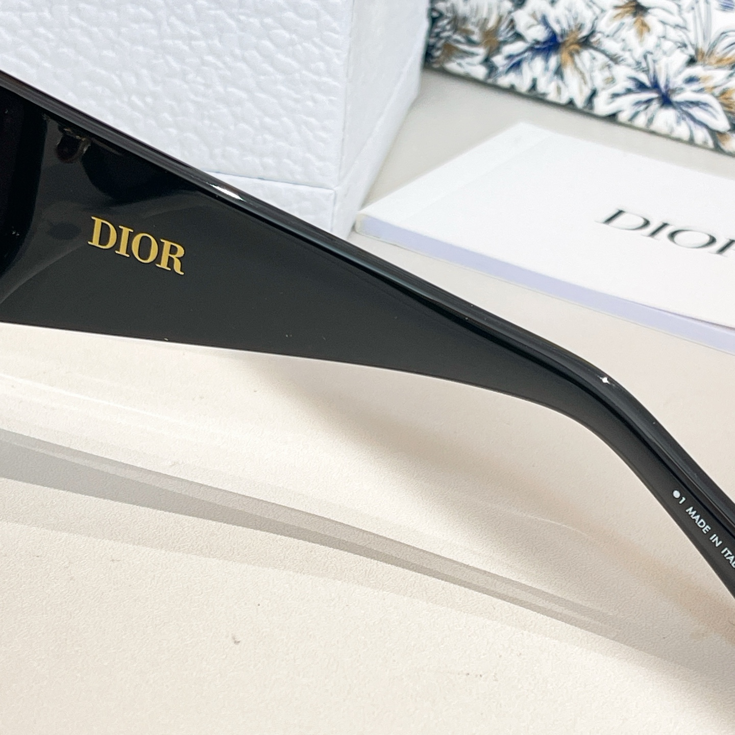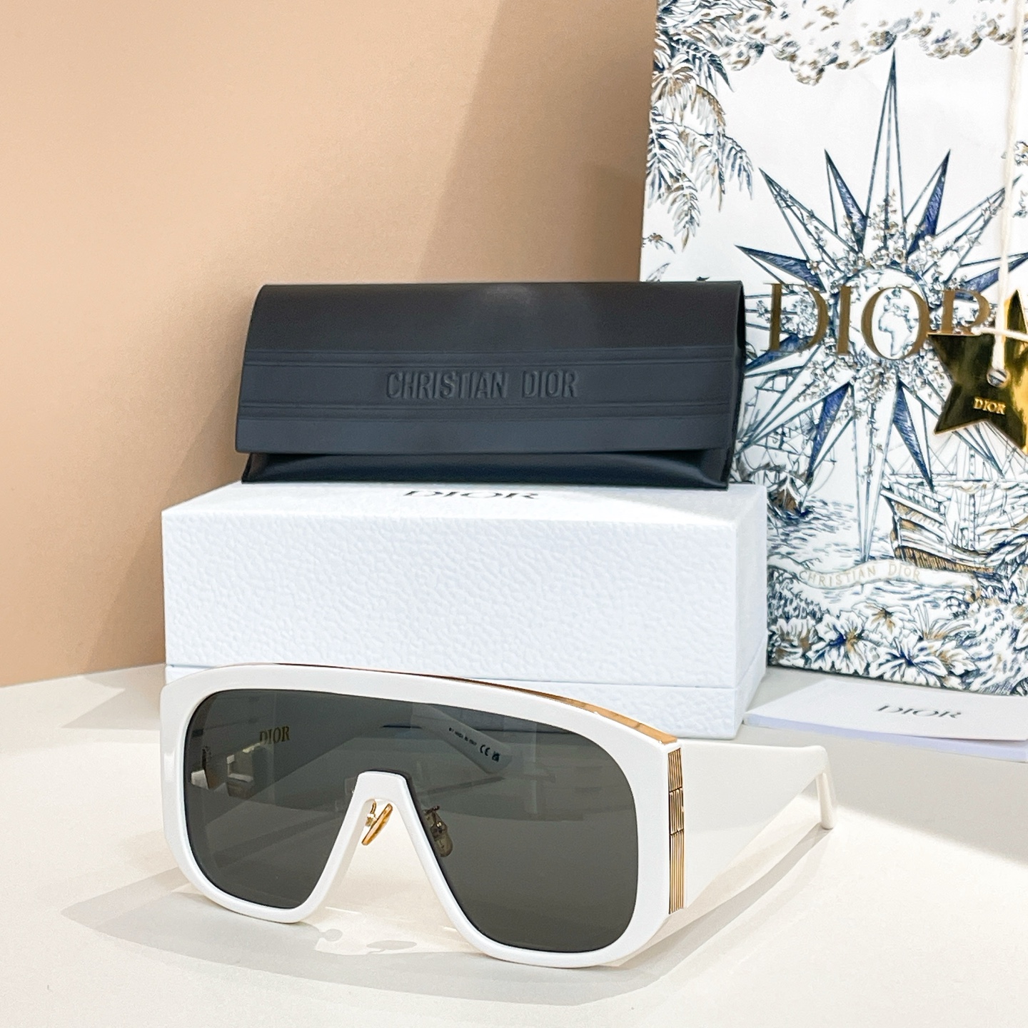 - The sunglasses showcase the distinctive “DIOR” branding with vertical stripes on the temple arms and are presented with Dior’s signature packaging, including a textured white box, a black case, and a decorative shopping bag.