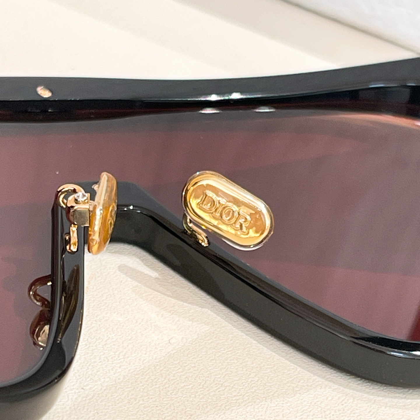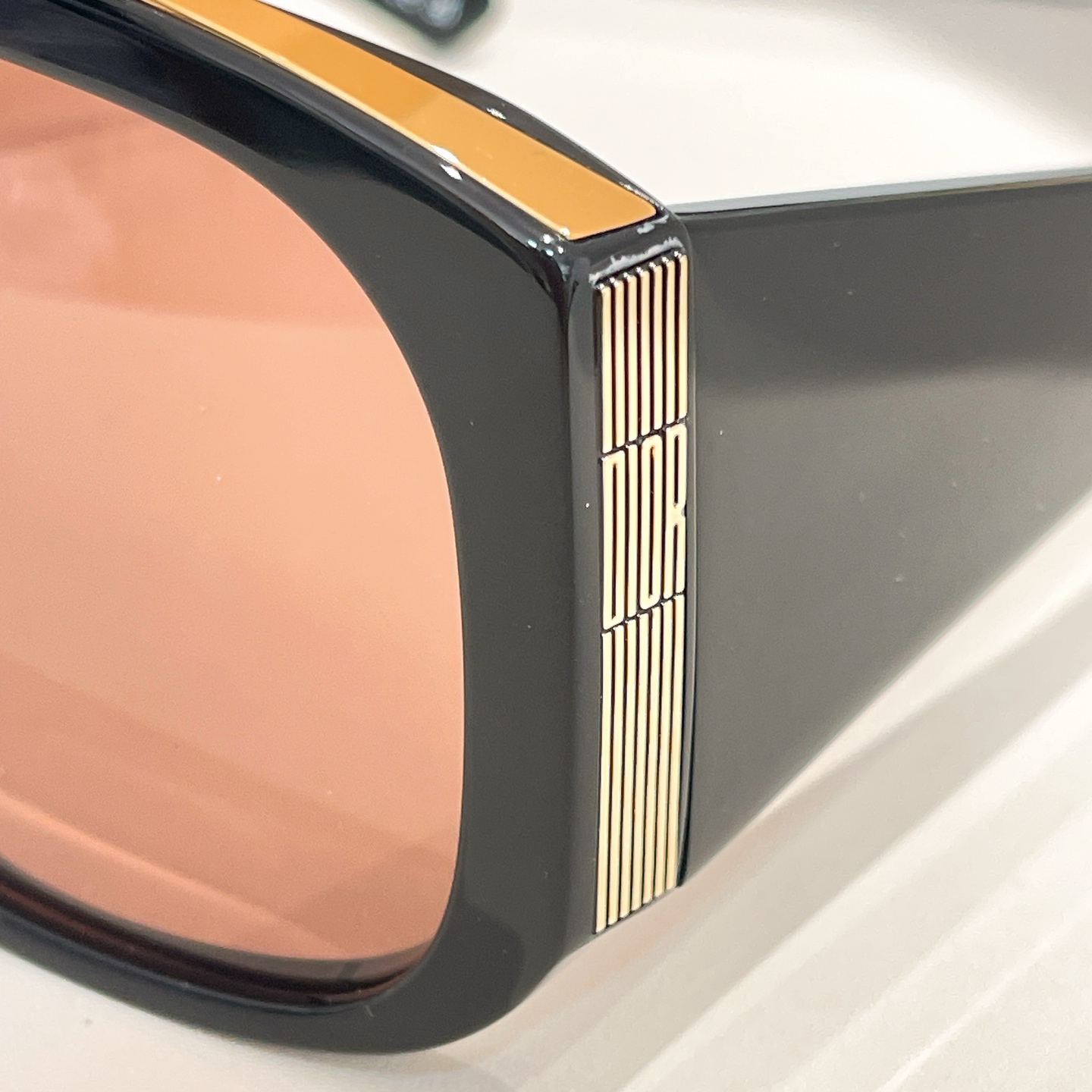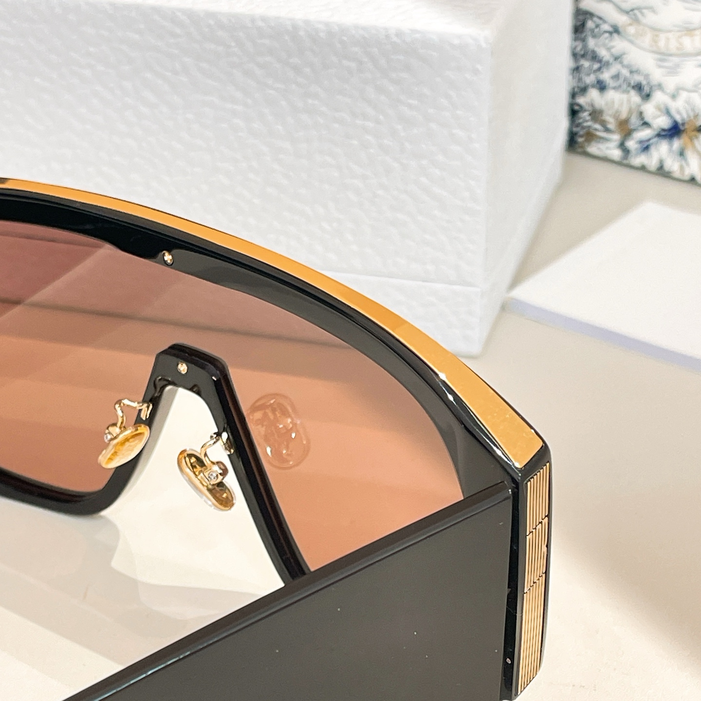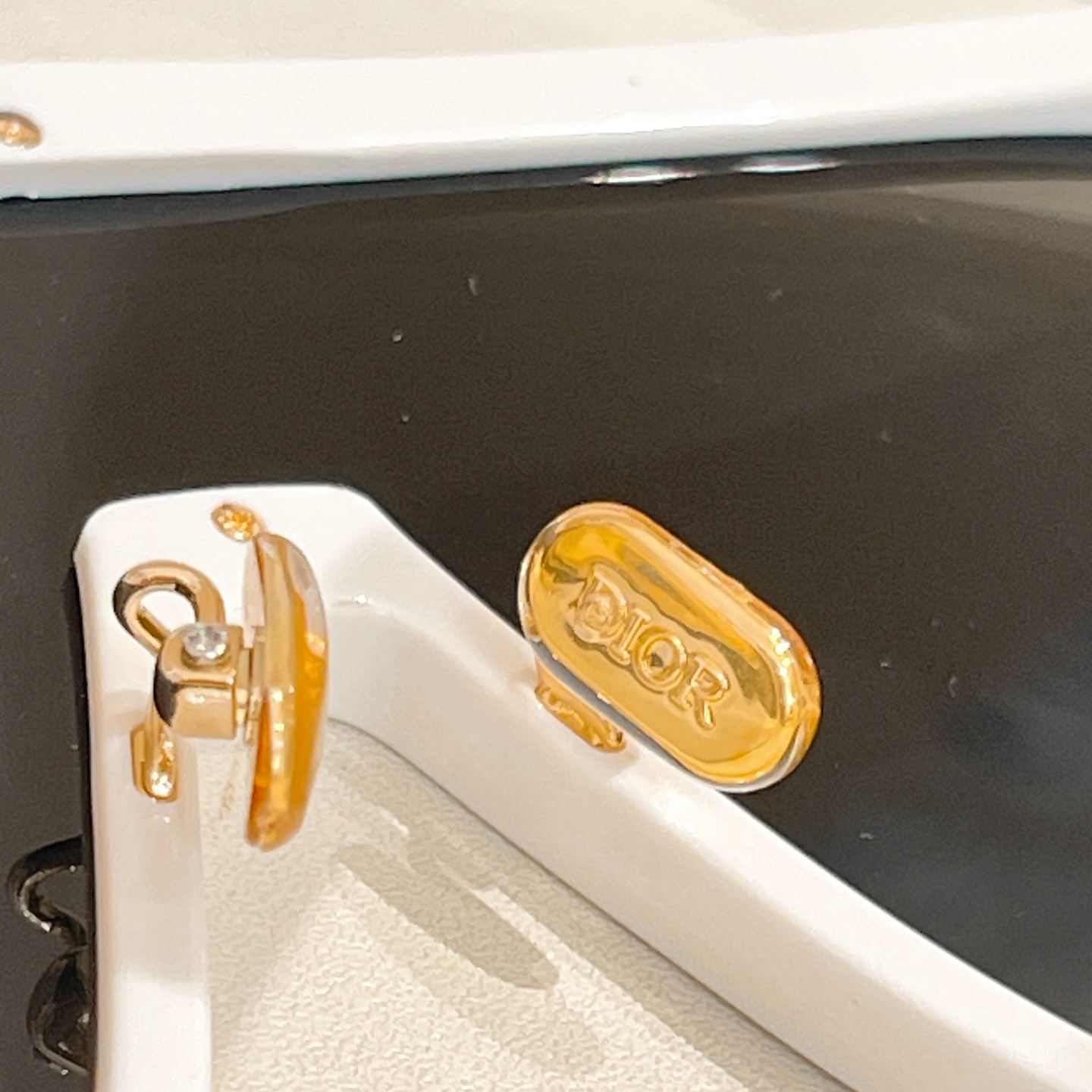 - The sunglasses showcase the distinctive “DIOR” branding with vertical stripes on the temple arms and are presented with Dior’s signature packaging, including a textured white box, a black case, and a decorative shopping bag.