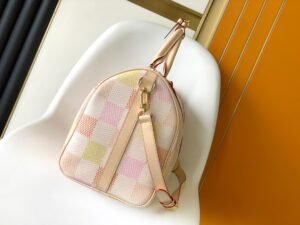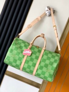 This is a Louis Vuitton Keepall travel bag featuring a vibrant green Damier Ebene checkered canvas (a bold twist on LV’s iconic pattern). \It’s accented with soft beige leather trim, top handles, and an adjustable crossbody strap for versatile carrying.