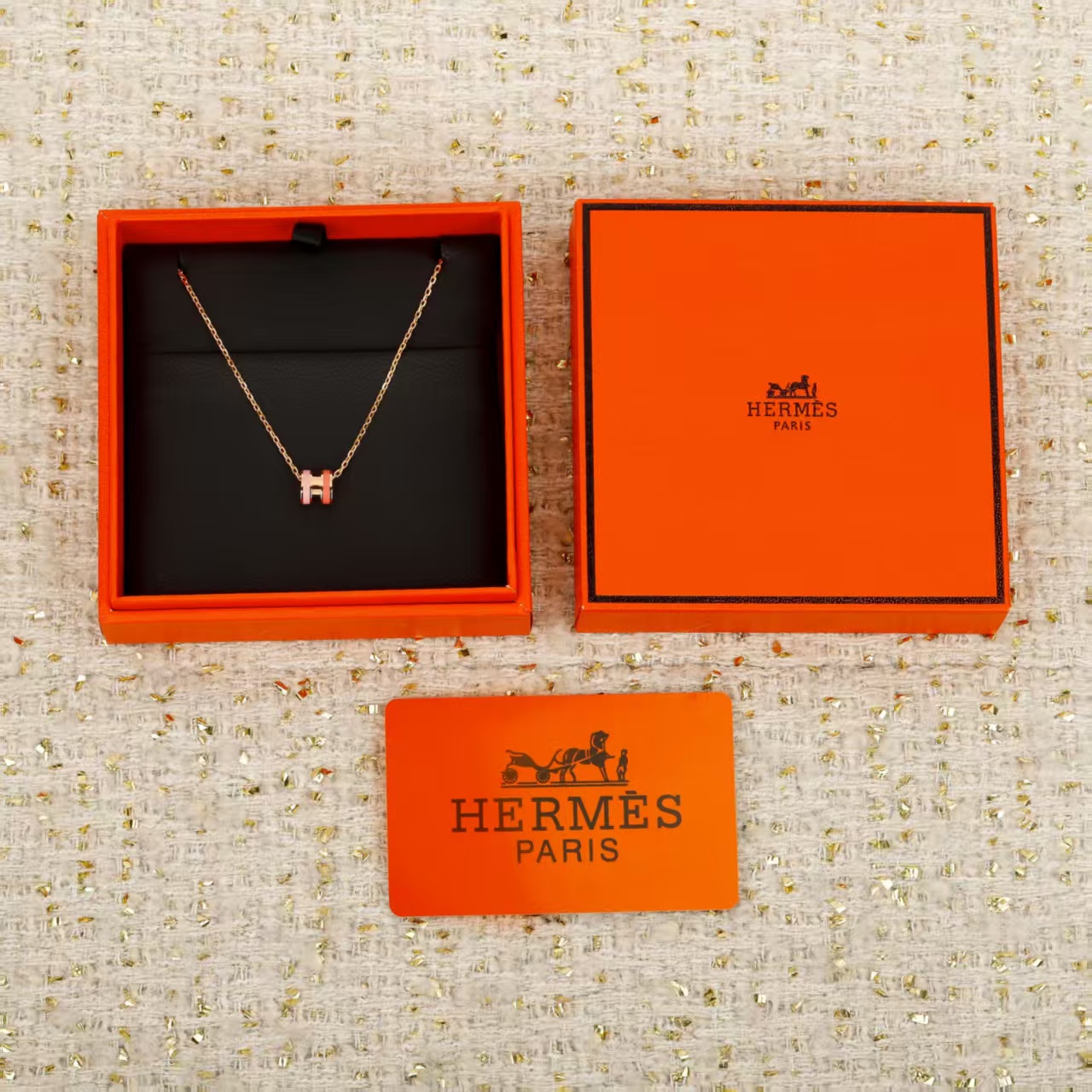 • This is a Hermès “Clic H” necklace, presented in the brand’s iconic orange packaging (box and card).