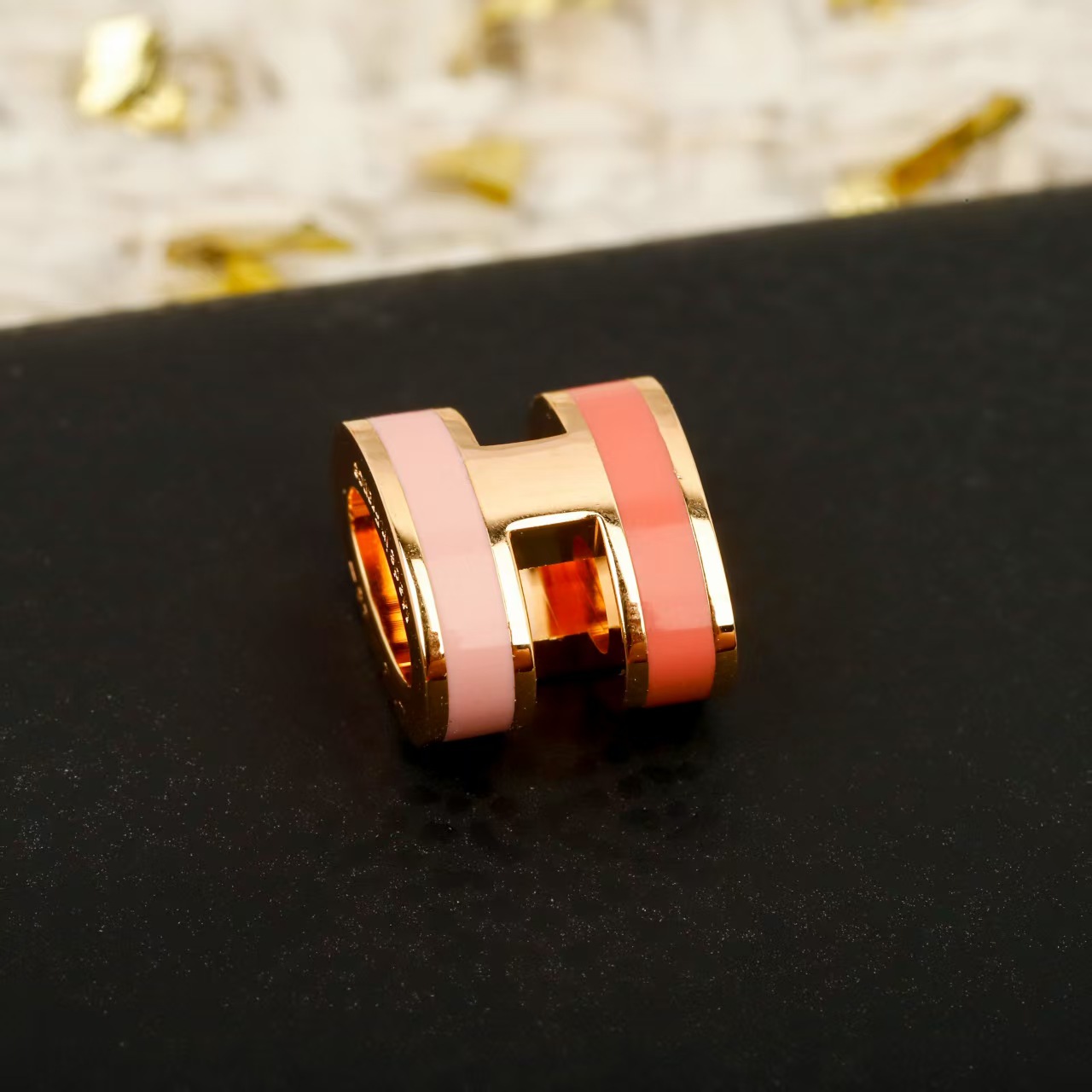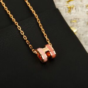 • The necklace features a delicate rose-gold chain paired with a cylindrical “H” pendant—crafted from polished rose-gold metal, accented with dual-tone enamel (soft pink and coral).