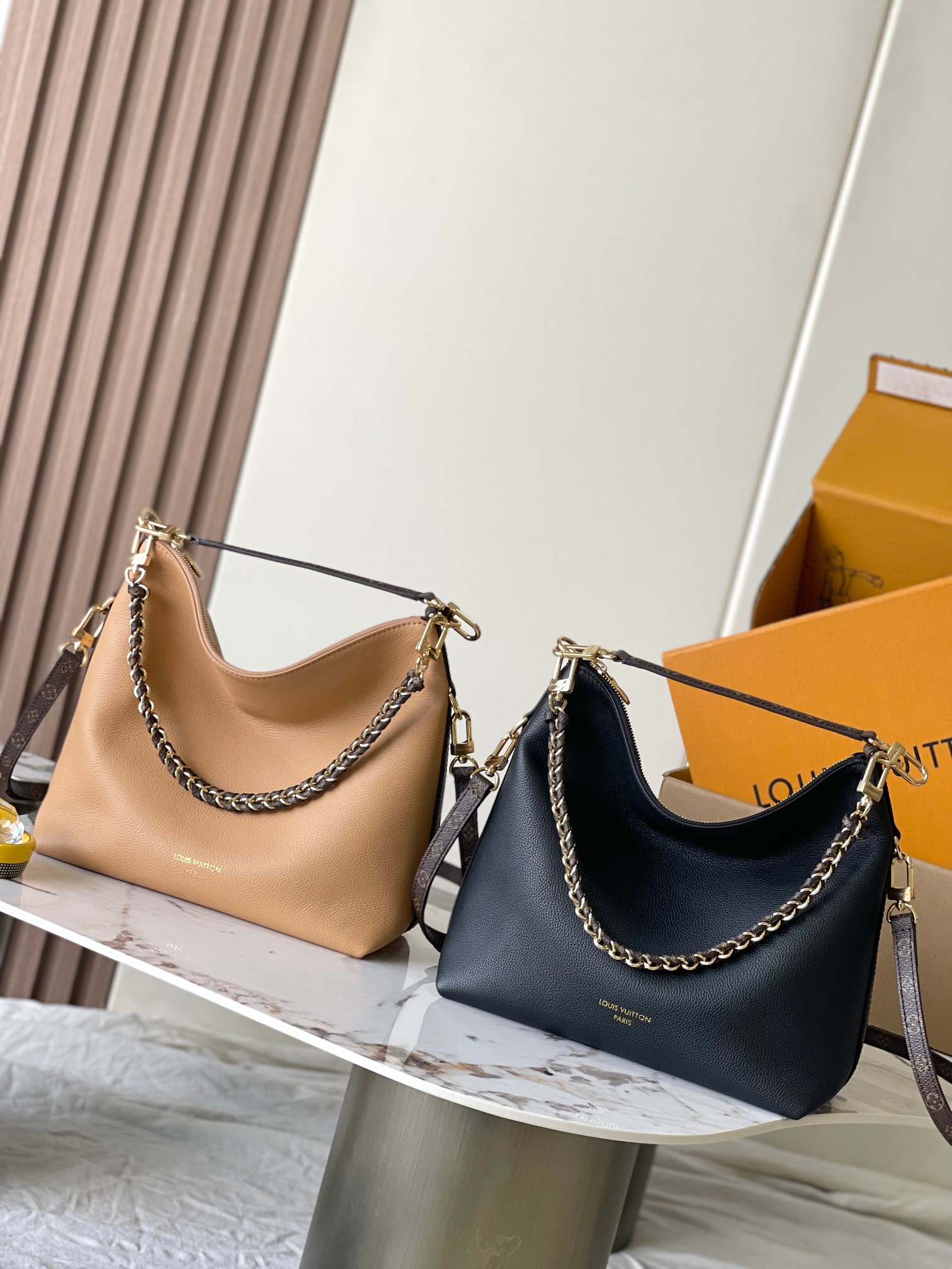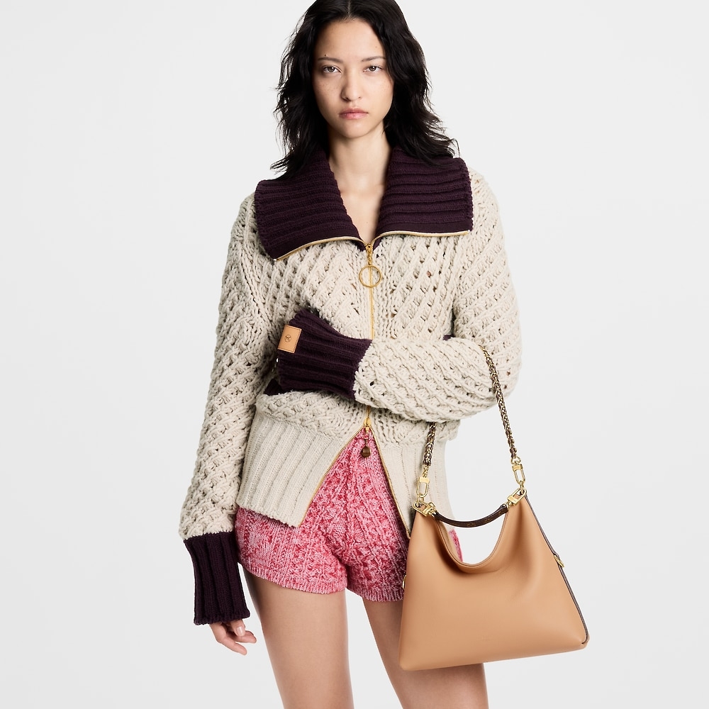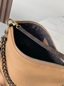 This Louis Vuitton hobo-style bag (available in classic black or warm tan) is a masterclass in versatile luxury, crafted from supple grained leather (known for its durability and soft, lived-in feel that ages beautifully).